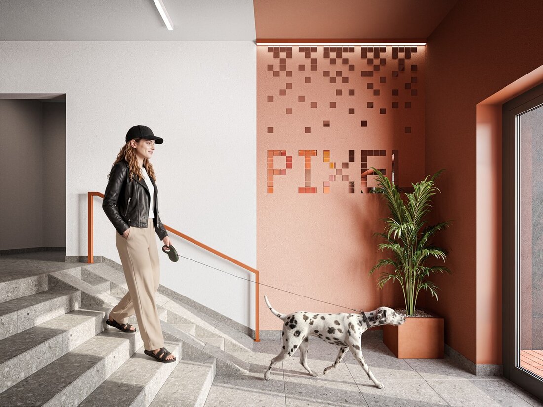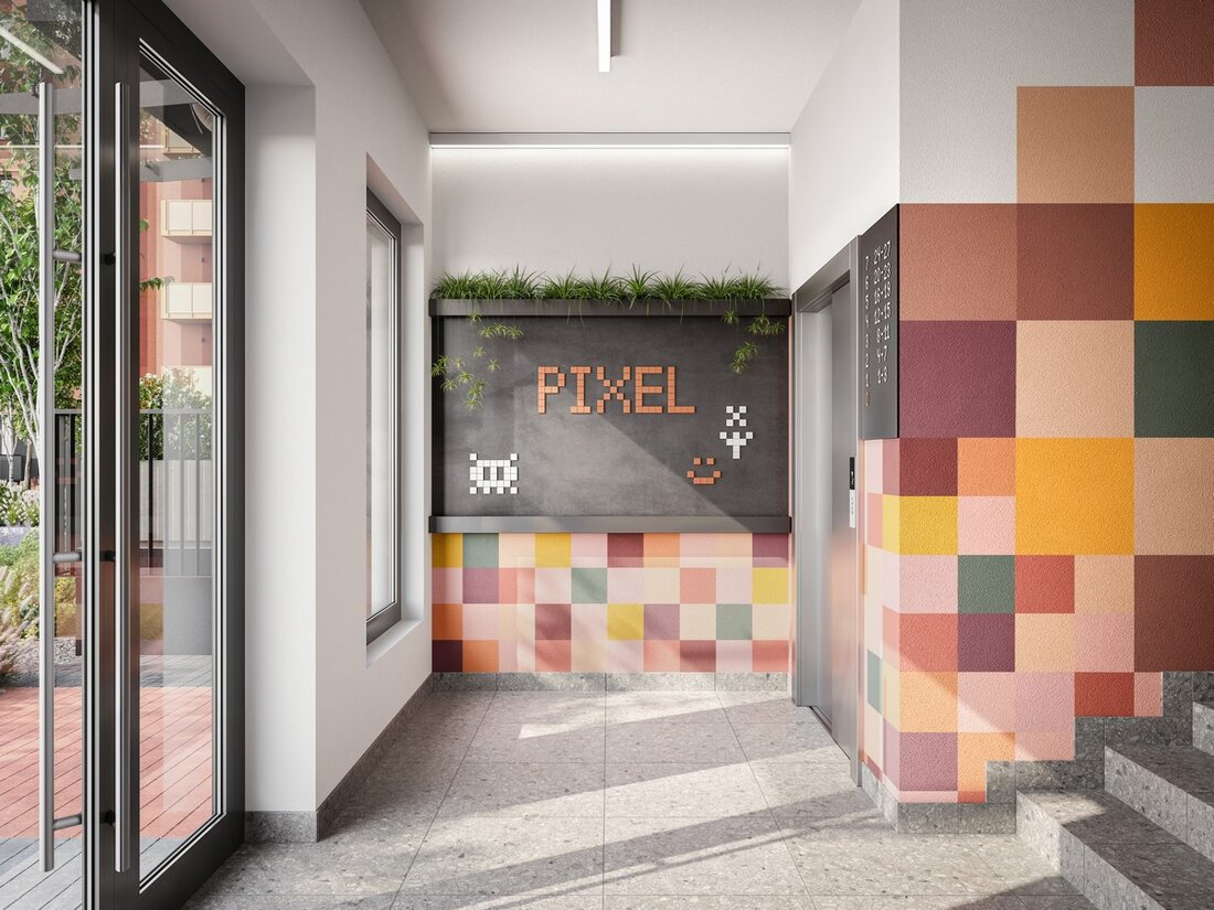 Подъезды сделают проходными и безбарьерными, с колясочными и лапомойками на первых этажах. Интерьеры подъездов также выполнят в пиксельной концепции: стены украсят фактурной штукатуркой с яркими геометрическими паттернами, зеркальными надписями Pixel и декоративными элементами в виде мелких квадратов. Двери в подъезды будут полностью остекленными.