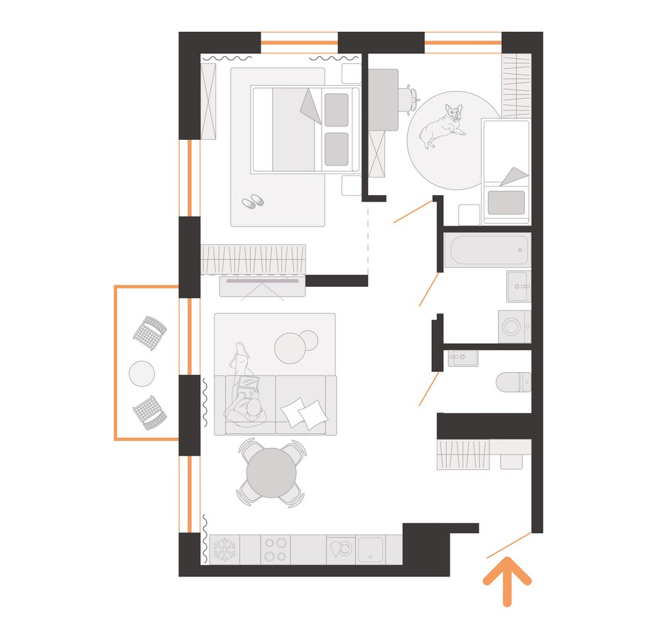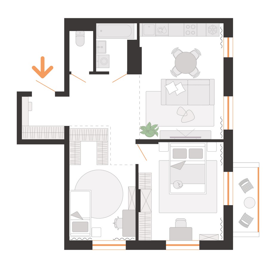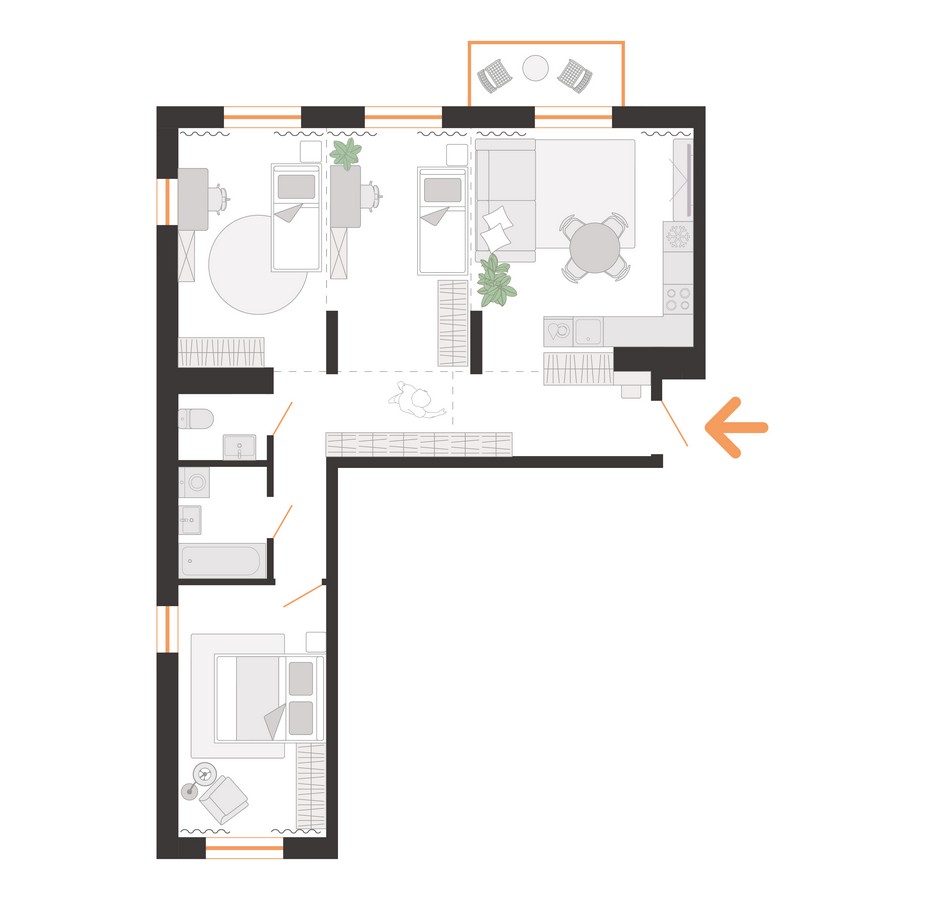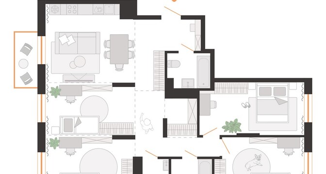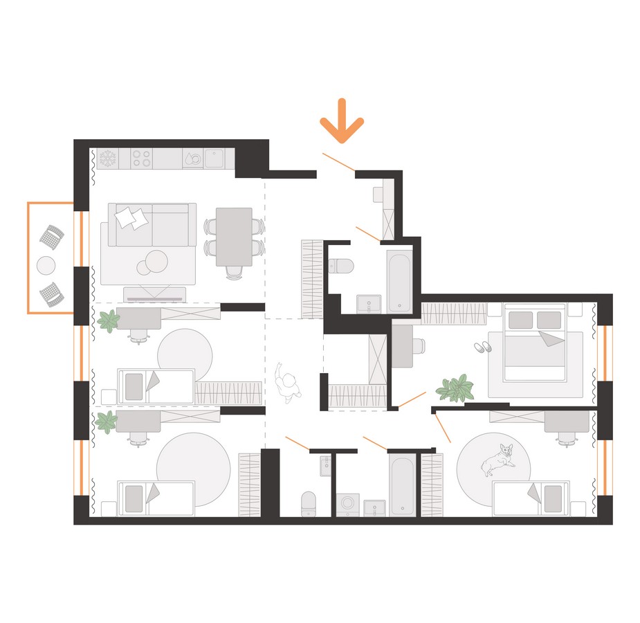 Сам дом будет переменной этажности — от 5 до 7 этажей, с пятью подъездами и 122 квартирами. Доступные площади варьируются от 34 до 108 «квадратов». Все квартиры предлагаются без отделки, с вариантами от евро-двушек до более просторных евро-пятикомнатных вариантов. Среди них будут квартиры с мастер-спальнями и двумя ванными комнатами. Квартиры получат стильные балконы разных видов — с сетчатым ограждением, глухими низкими и высокими стенками, создающими объем на фасаде. На первом этаже по традиции устраиваются террасы.