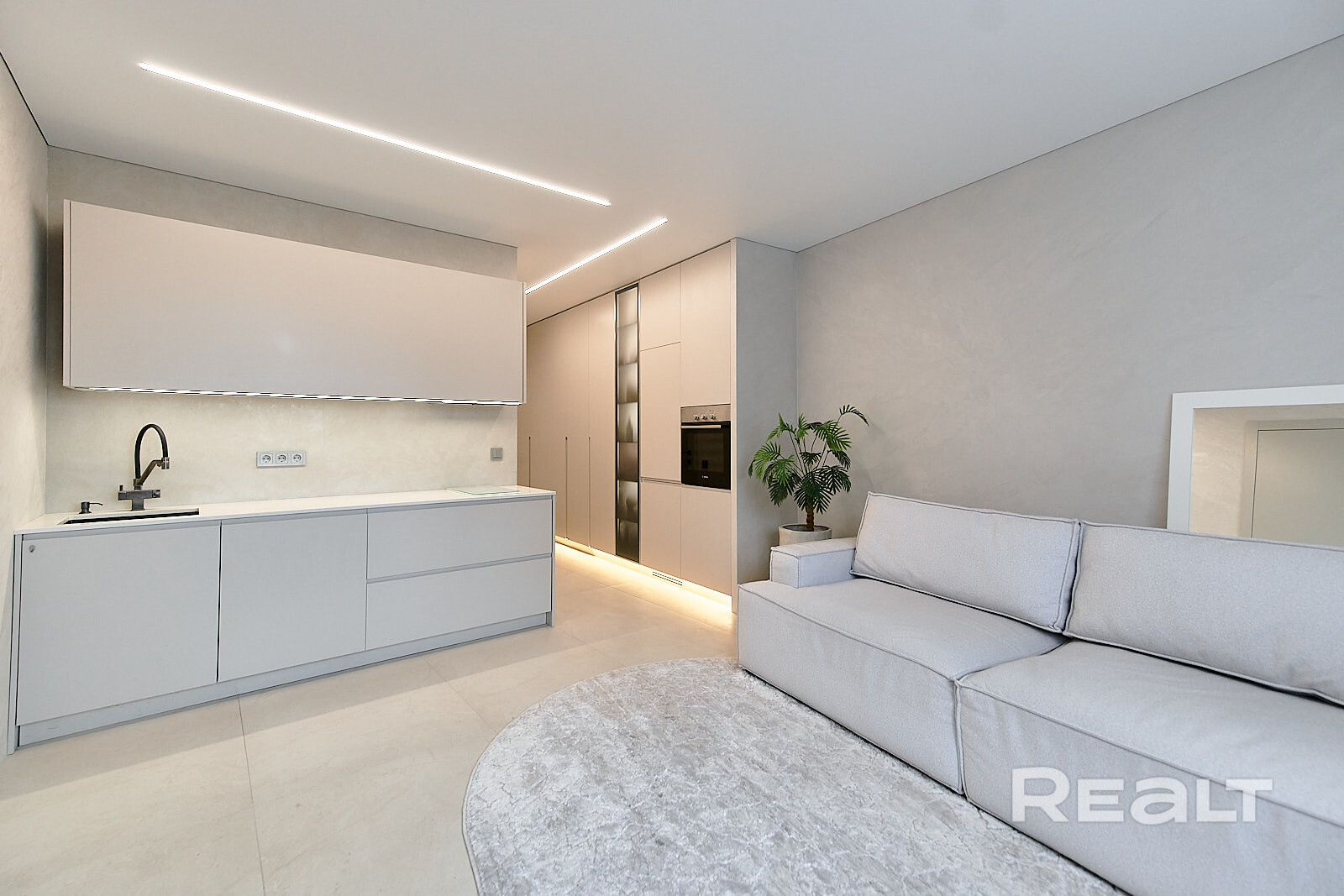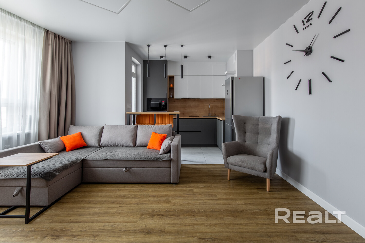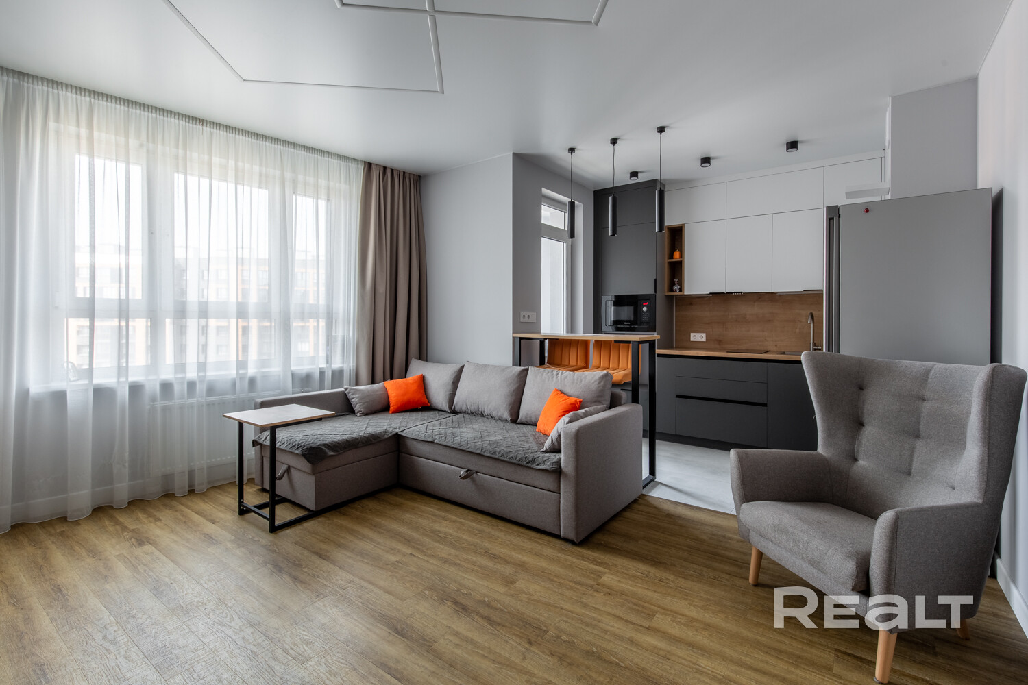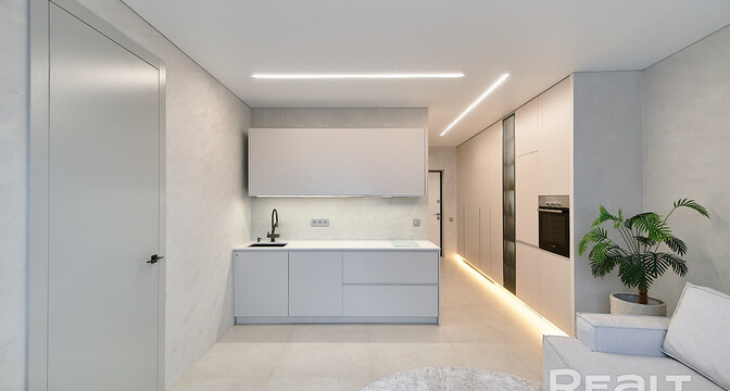 Владельцы решили не разделять пространство перегородками. Благодаря двум окнам в квартире хватает естественного света. Здесь уже разместили кухонный гарнитур с техникой: холодильником, варочной панелью, духовым шкафом и вытяжкой. Установлена барная стойка, в зоне гостиной — диван, кресло и телевизор. Достанутся покупателям и встроенные шкафы.