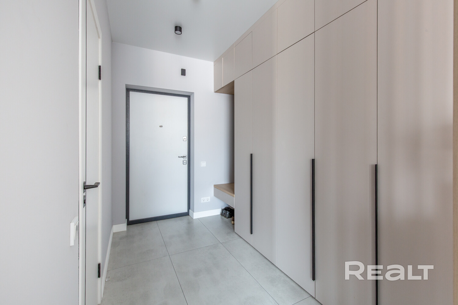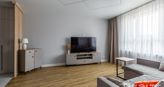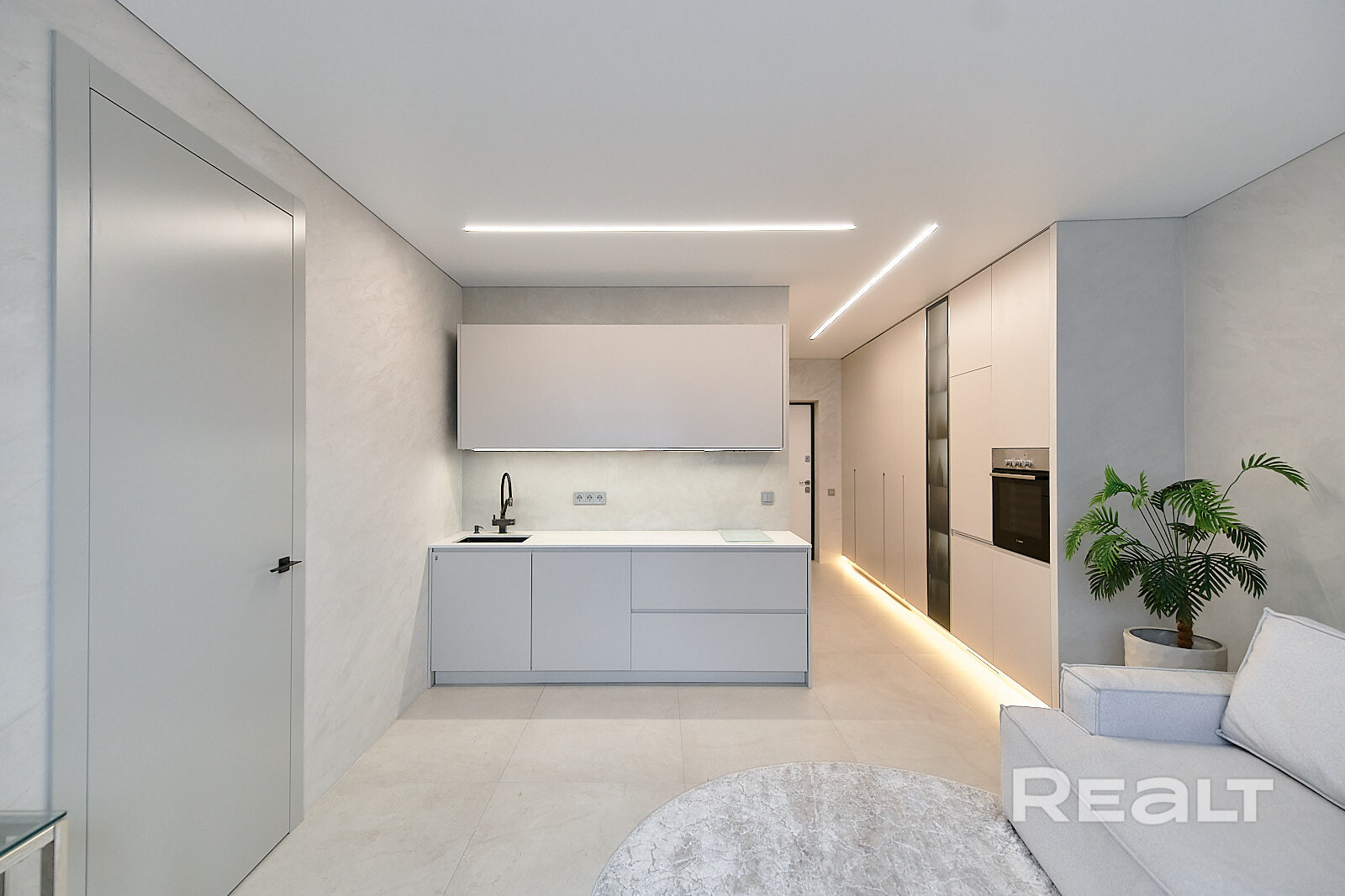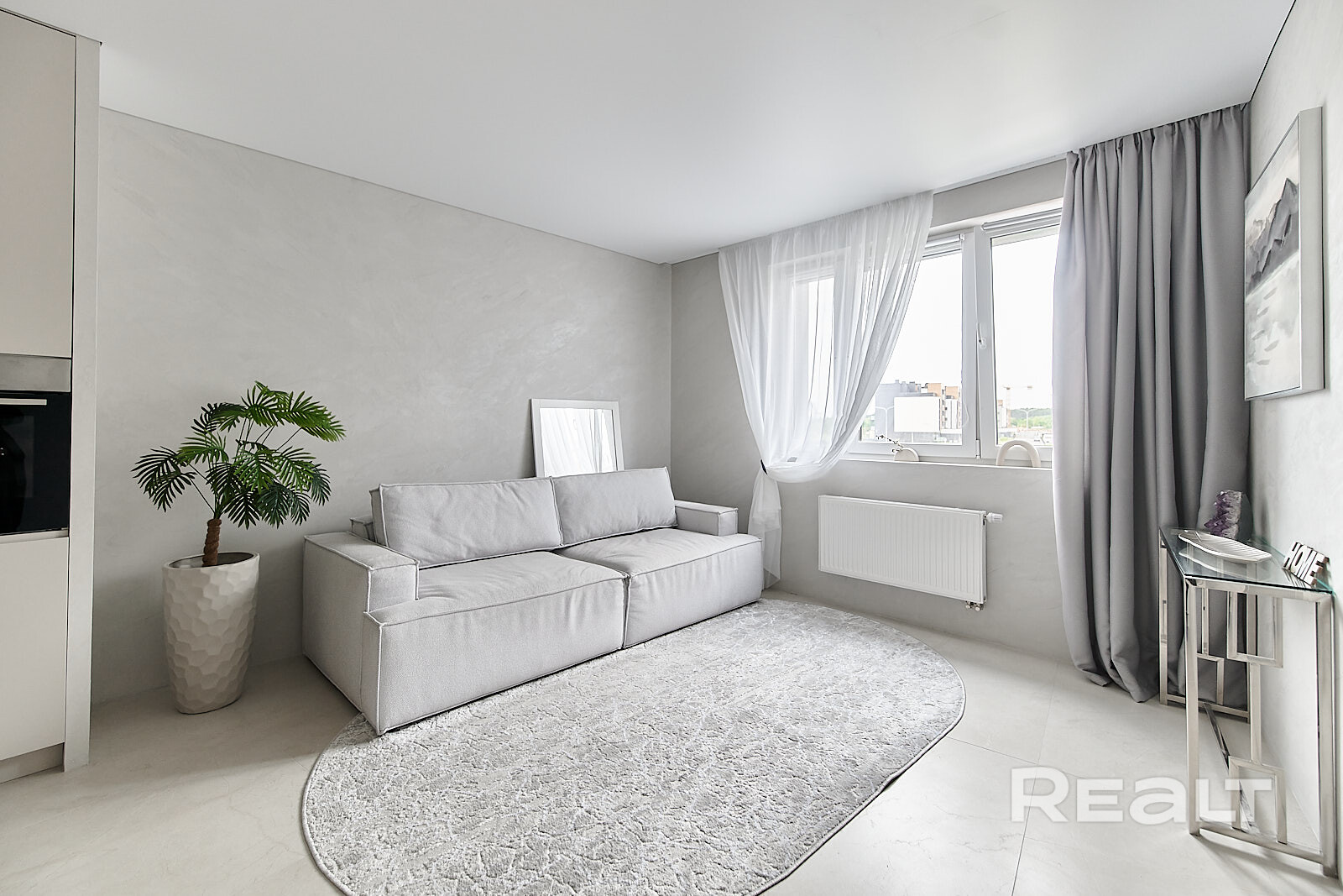 Владельцы решили не разделять пространство перегородками. Благодаря двум окнам в квартире хватает естественного света. Здесь уже разместили кухонный гарнитур с техникой: холодильником, варочной панелью, духовым шкафом и вытяжкой. Установлена барная стойка, в зоне гостиной — диван, кресло и телевизор. Достанутся покупателям и встроенные шкафы.