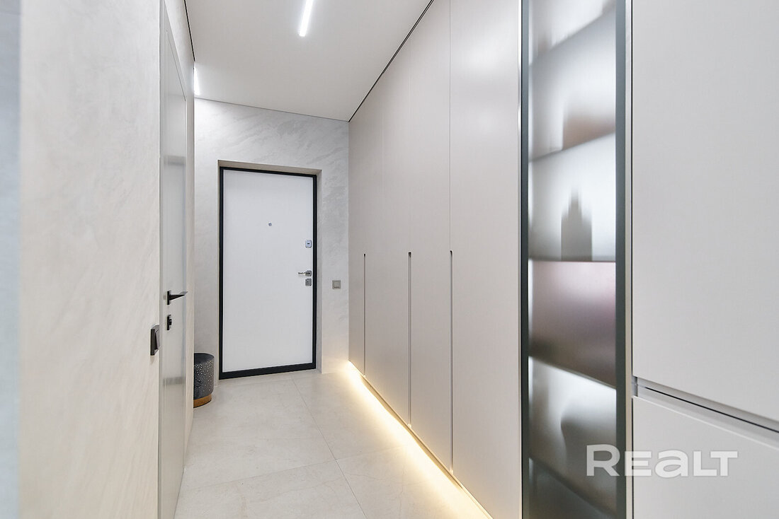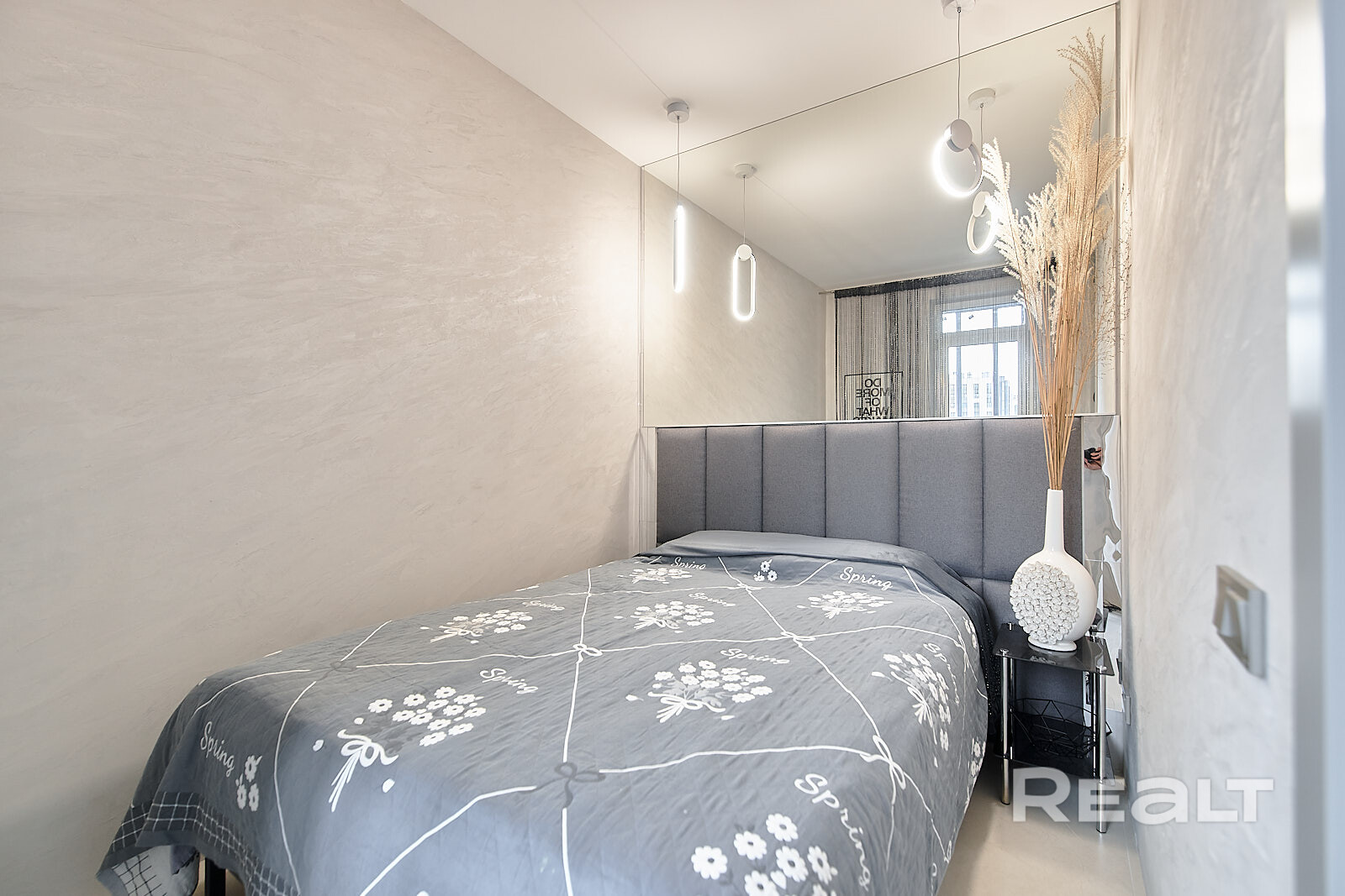 Здесь владельцы решили выделить полноценную спальную зону с выходом на застекленную лоджию. Квартира тоже готова к проживанию: со светлыем ремонтом, мебелью и техникой. Кухонный гарнитур частично поместился в коридоре.