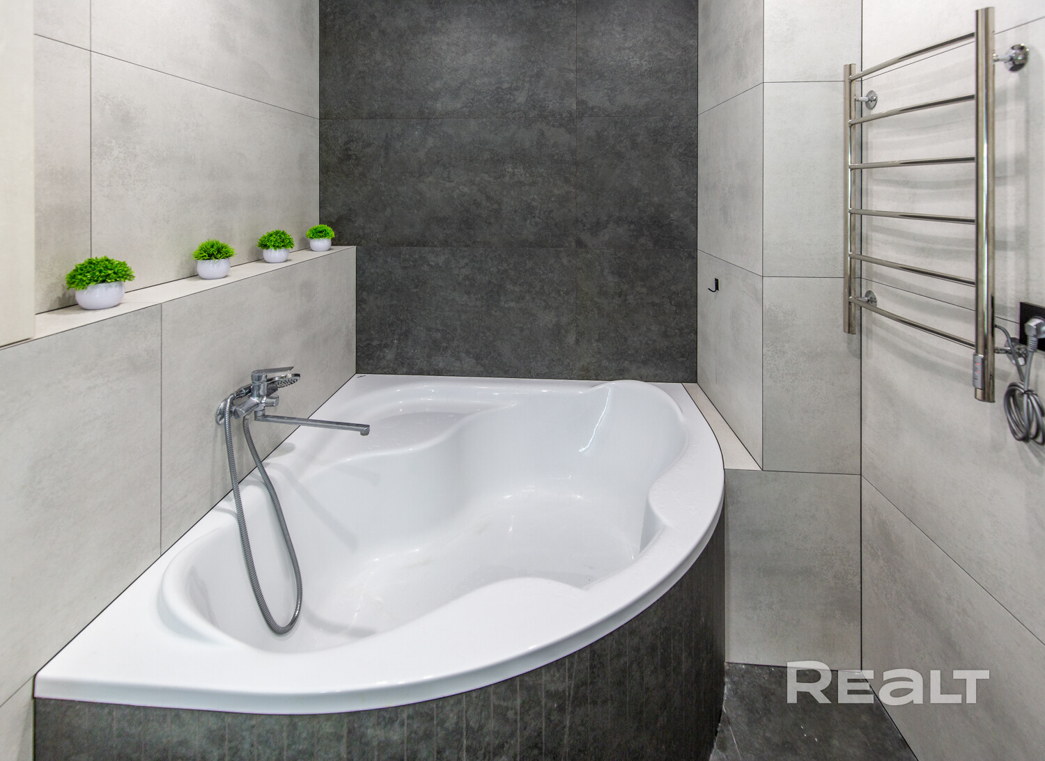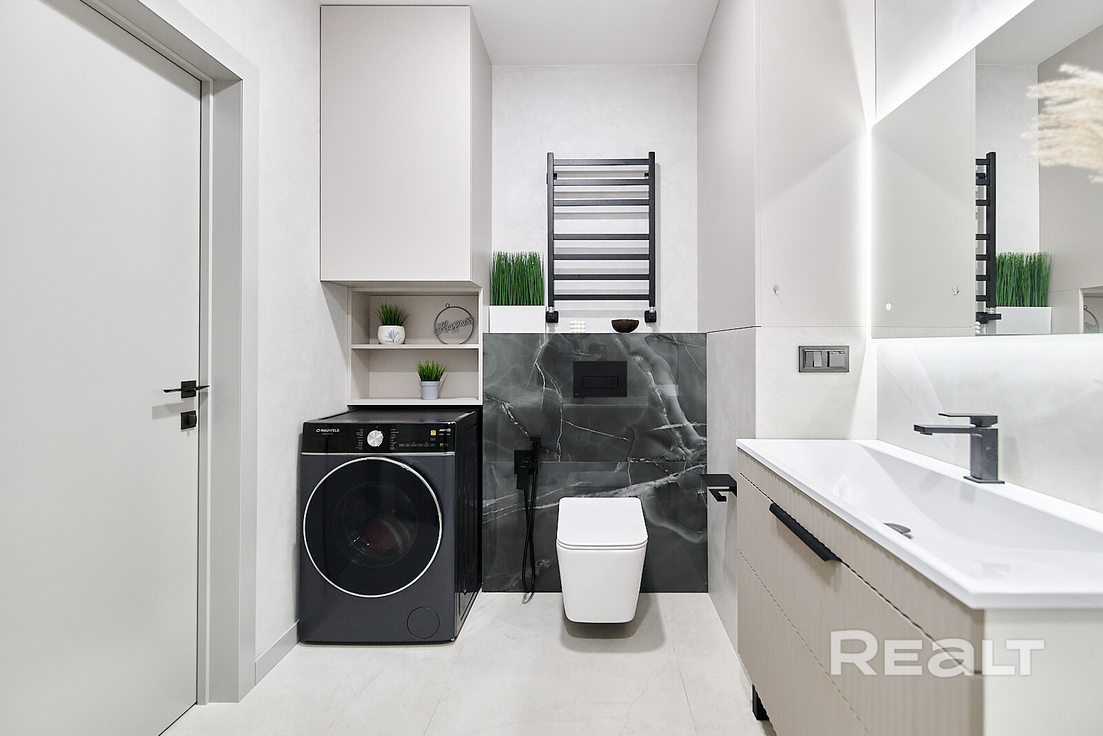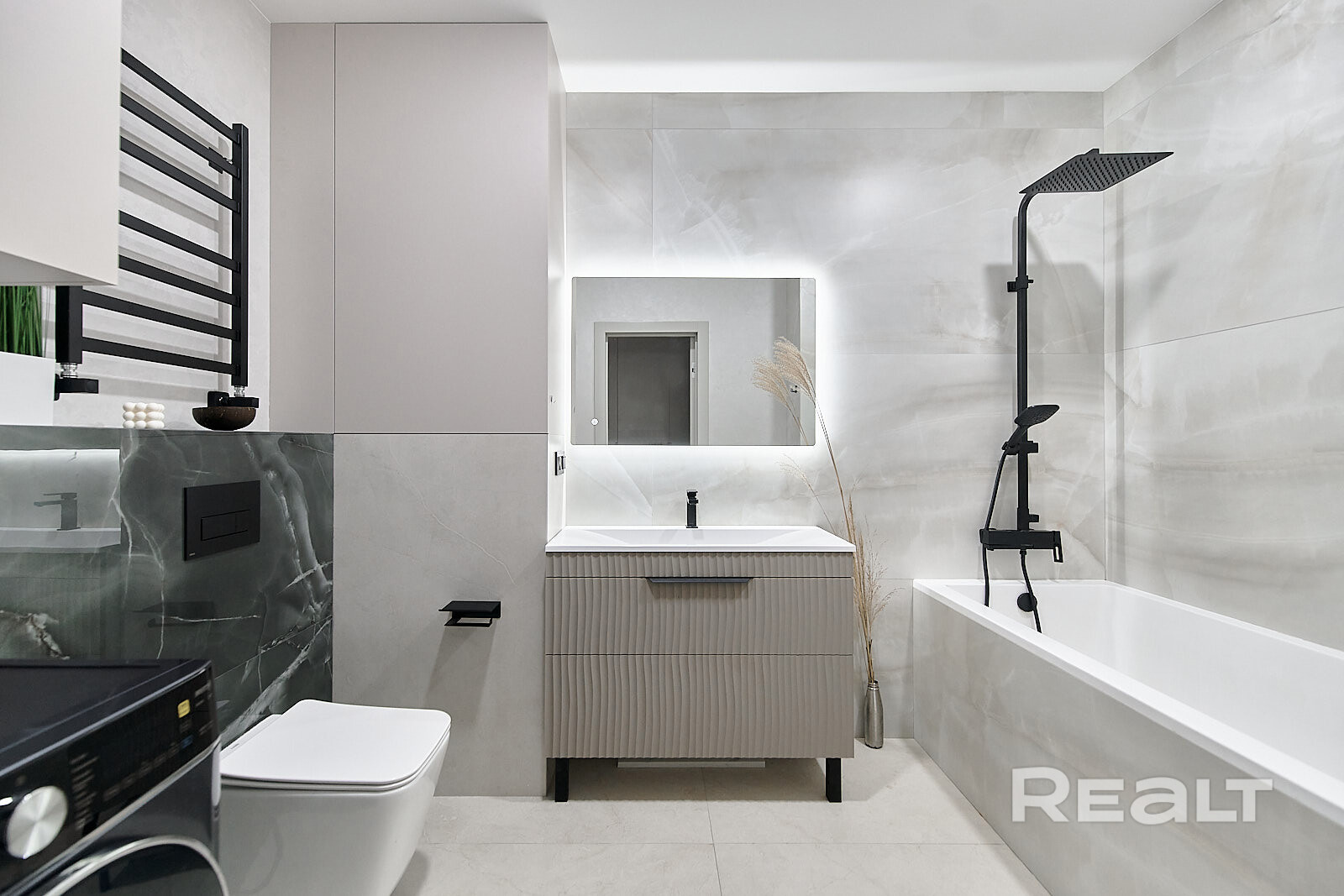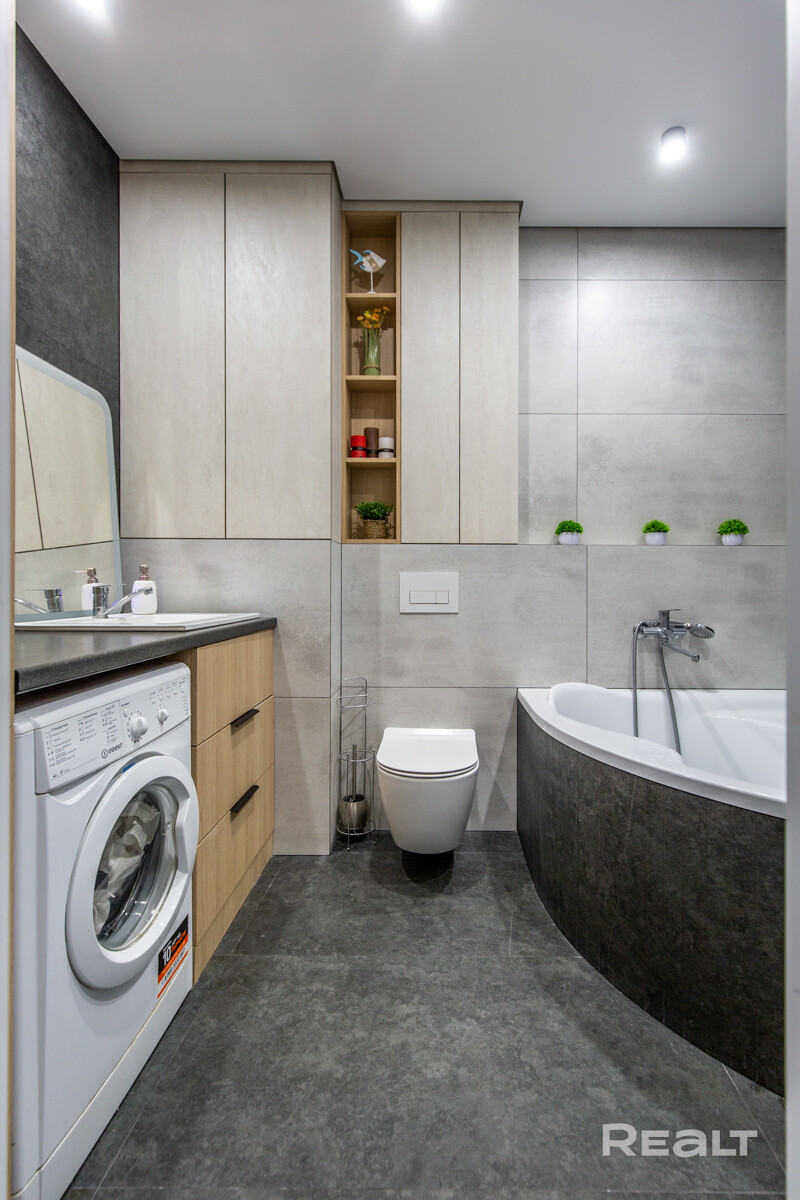 Санузел — совмещенный. Здесь стоят ванна, унитаз с инсталляцией и стиральная машина, есть гигиенический душ.