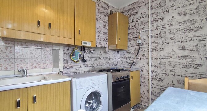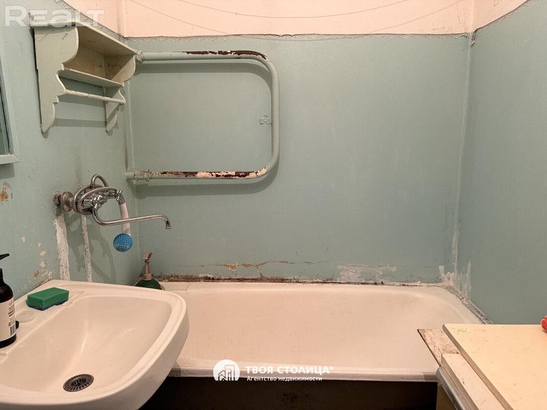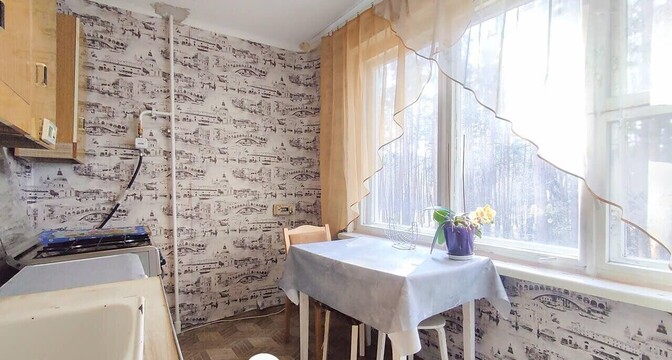 Общая площадь квартиры — 34 квадратных метра, 17 из них приходится на жилую площадь. Метраж кухни — 7 квадратных метров. В кухне есть выход на застекленную лоджию. Санузел раздельный. Продавец честно признается, что ремонт в квартире в плохом состоянии.