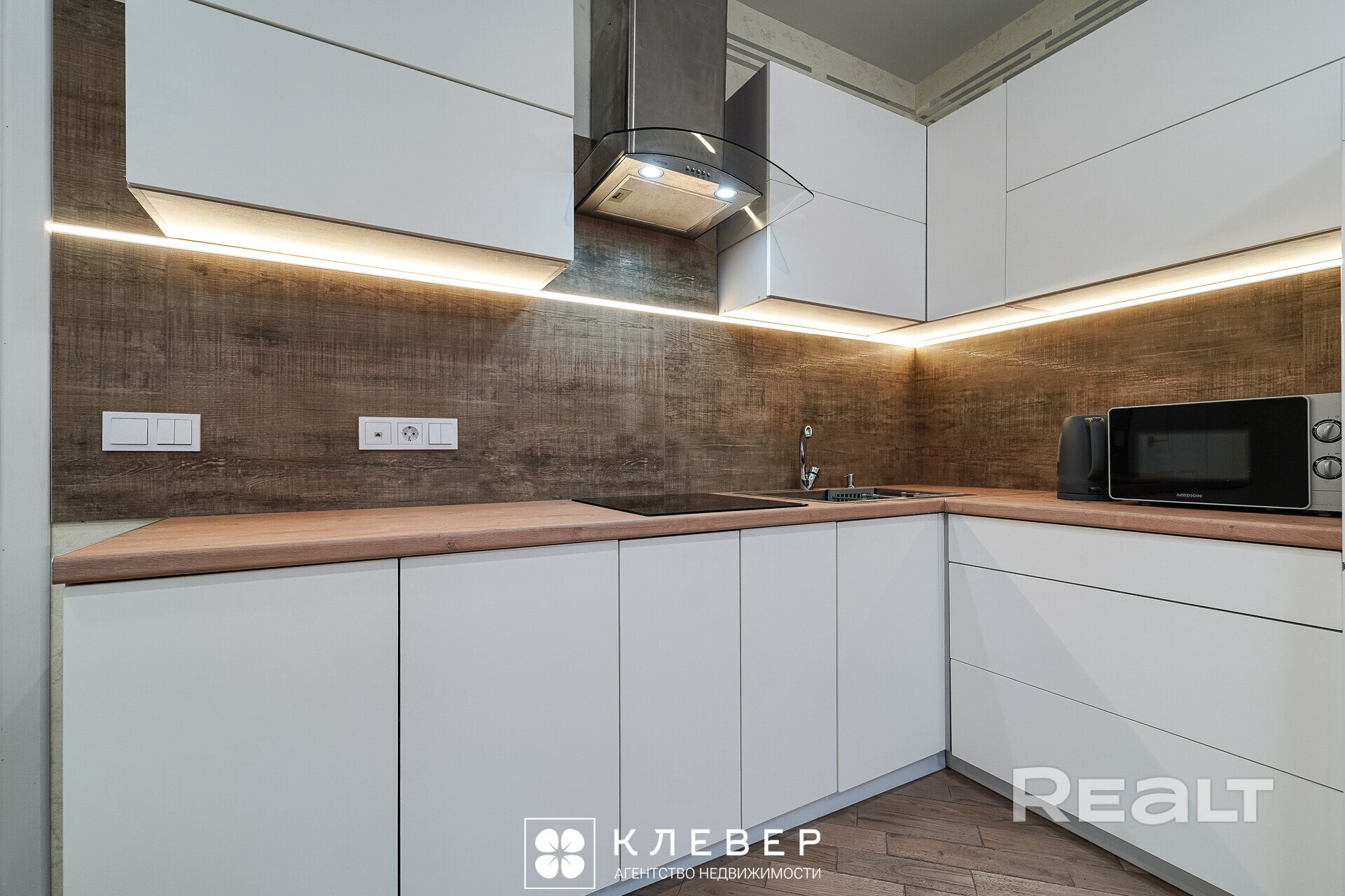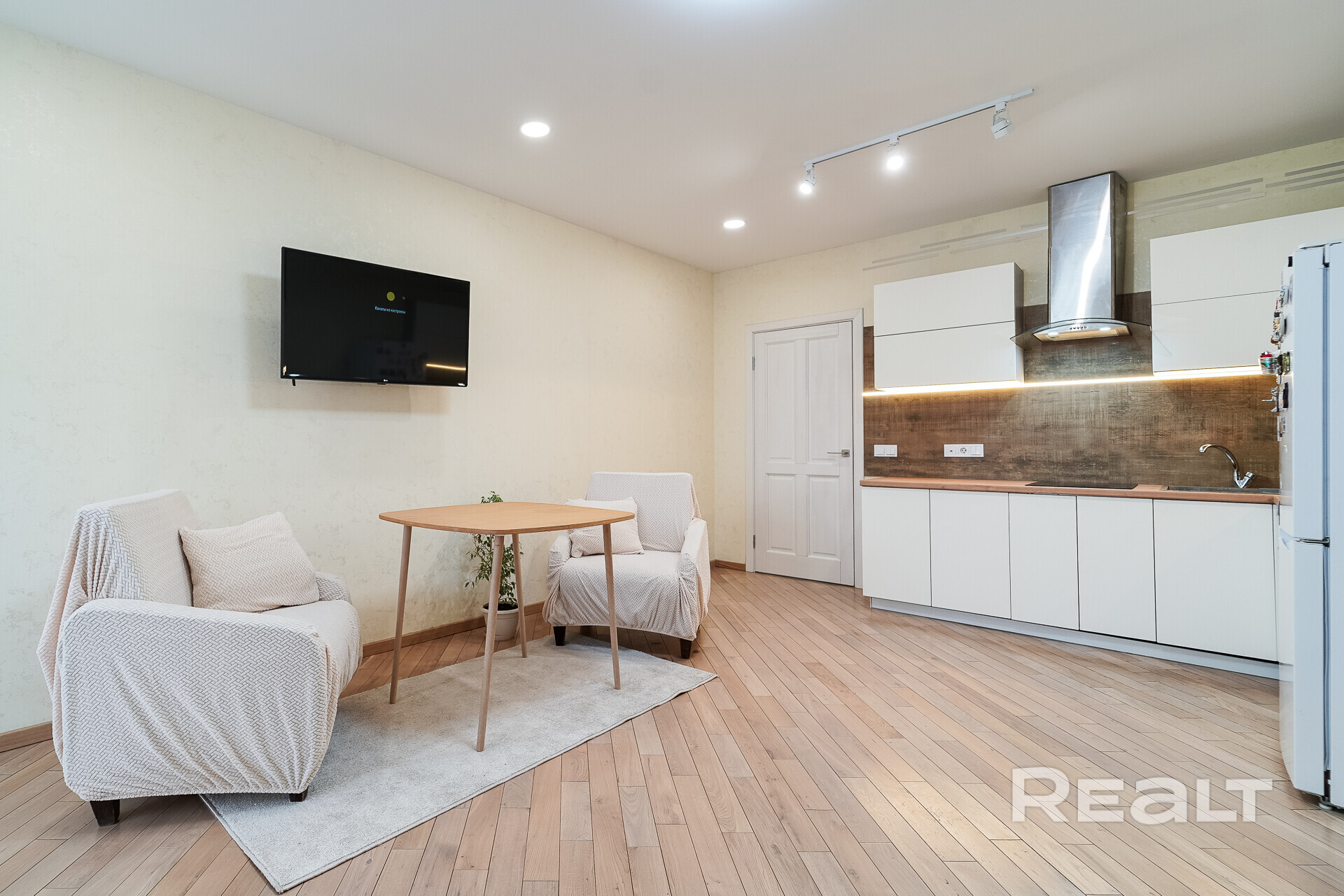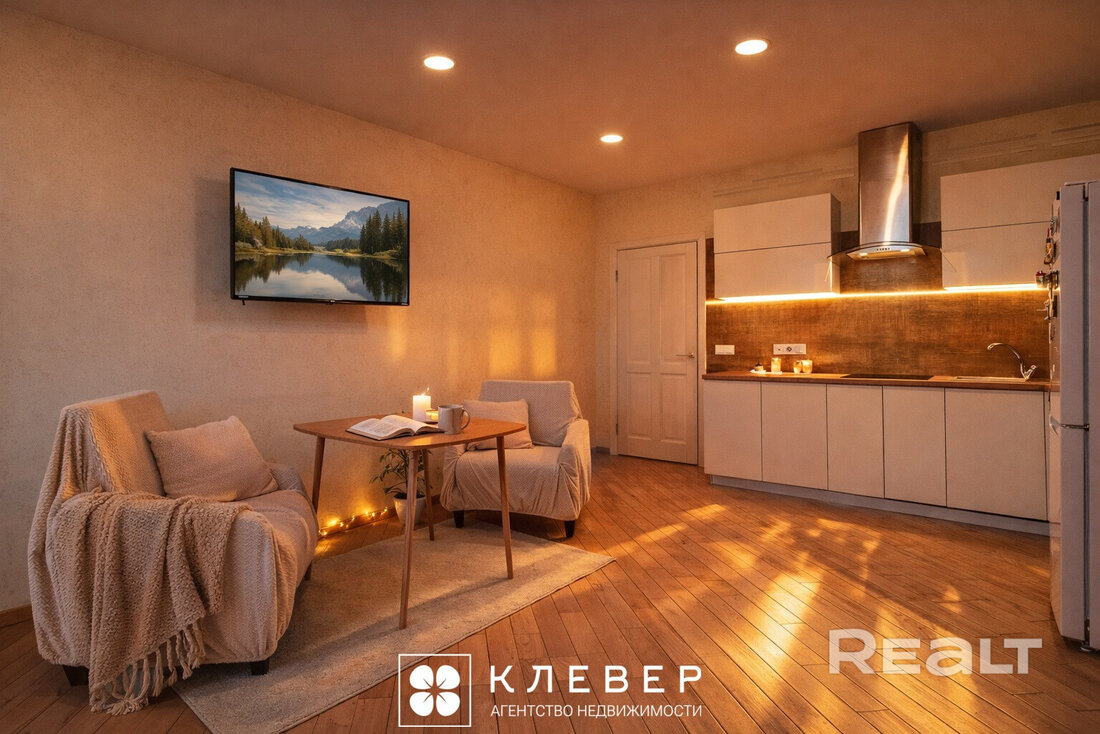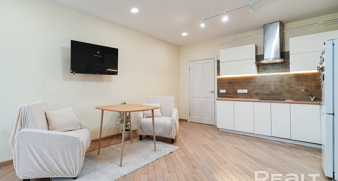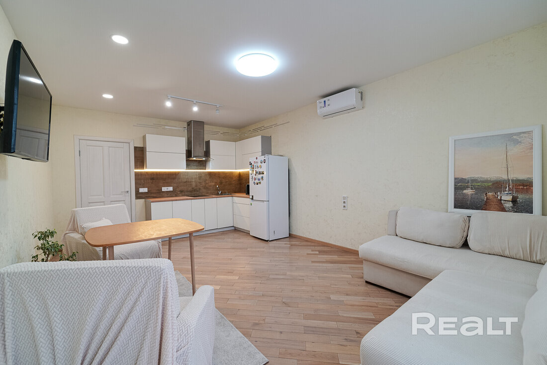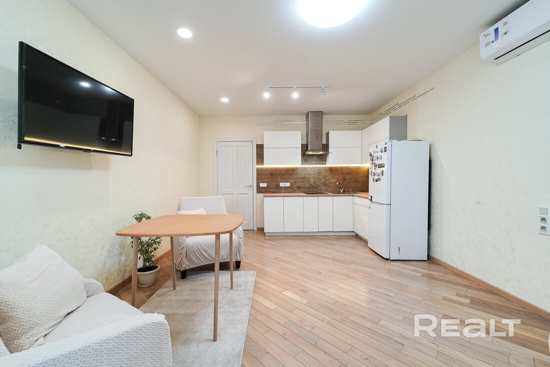 Она полностью готова к проживанию. Тут сделан светлый ремонт, на полу лежит паркет. Комната разделана на две зоны. У дальней стены установлен кухонный гарнитур с бытовой техникой.
