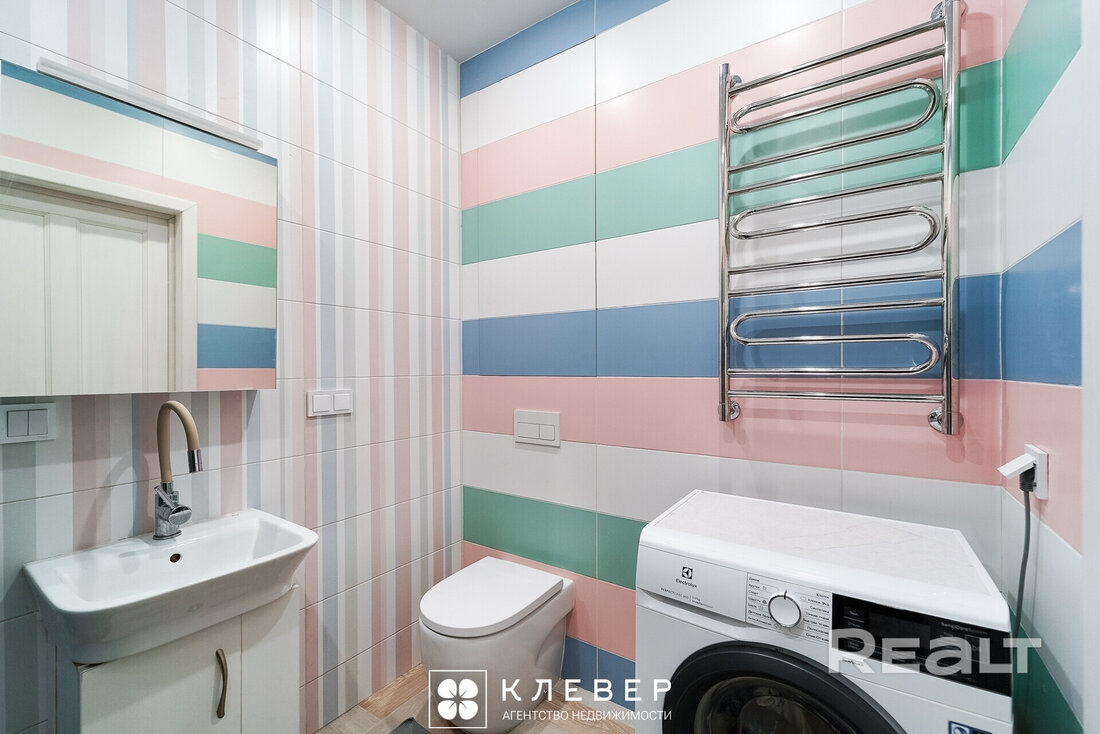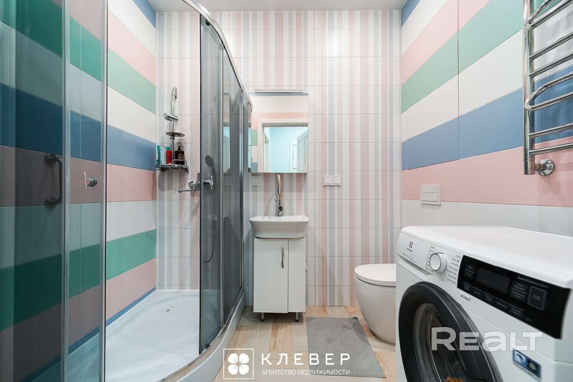 В ванной комнате поместились душевая кабина и стиральная машина.