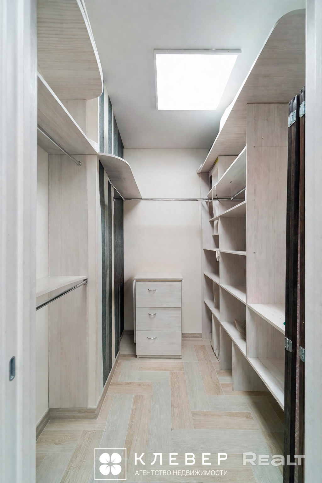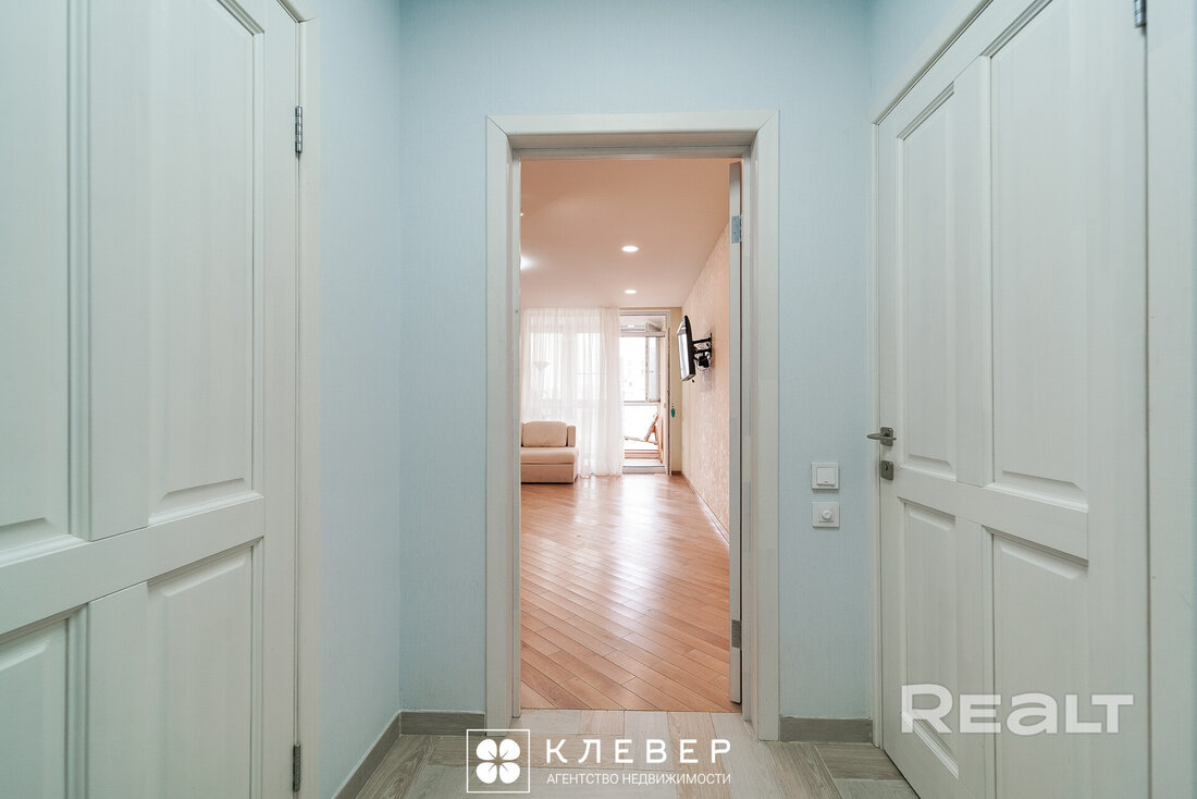 В коридоре есть две двери, за которыми скрываются полноценная гардеробная и совмещенный санузел.