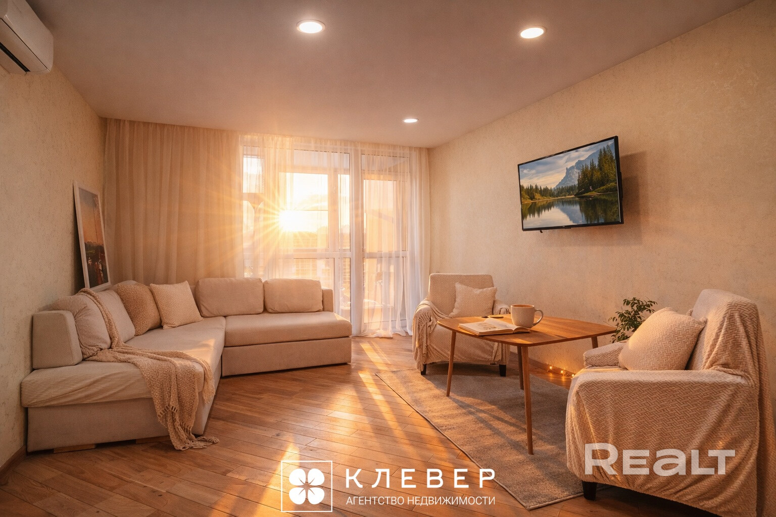 Также обустроена столовая зона с ТВ, стоит диван около выхода на лоджию.