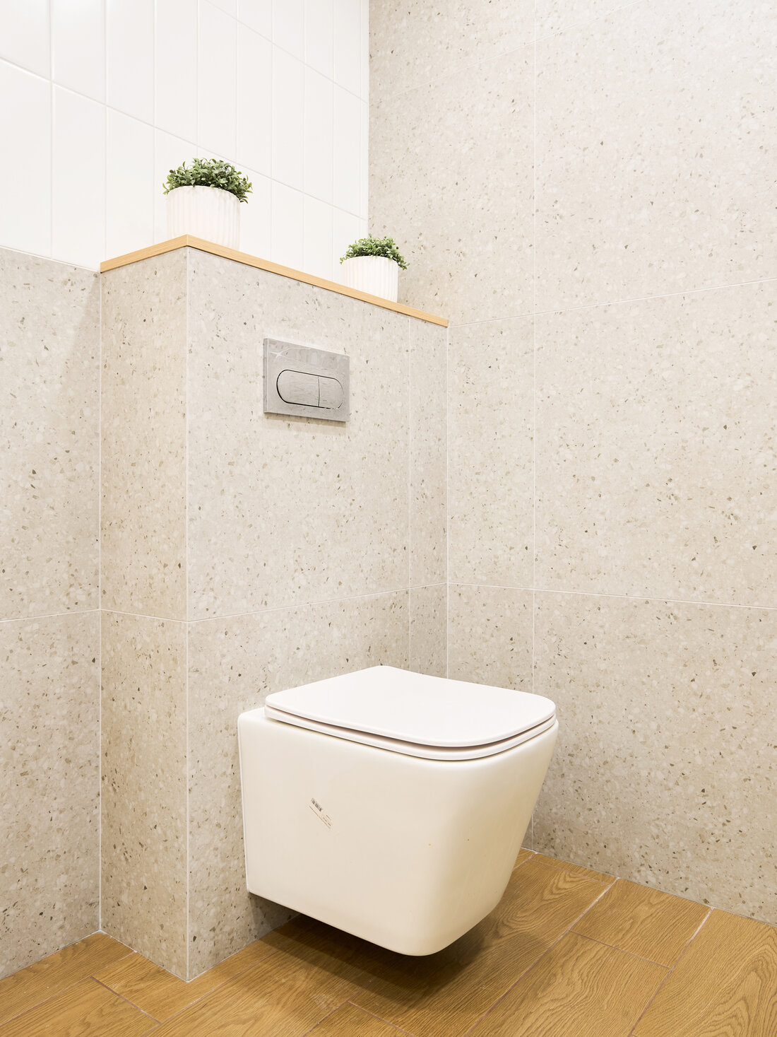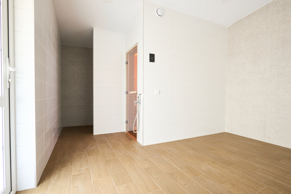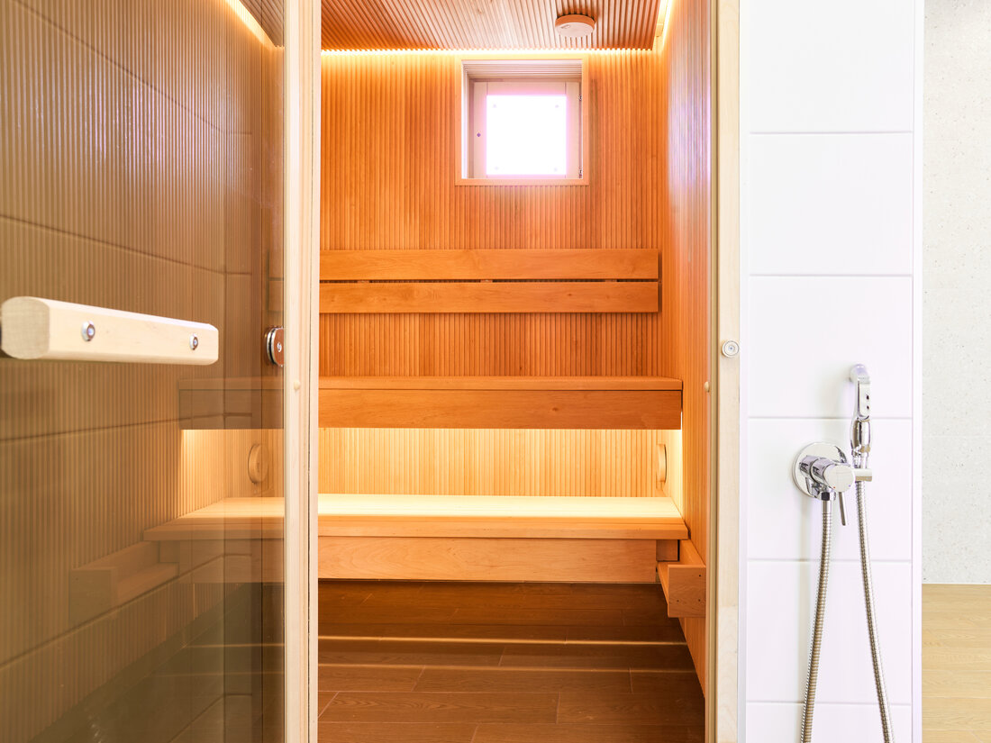 В доме две мокрые зоны. Одна занята совмещенным санузлом, вторая отдана под сауну. Она имеет отдельный выход на участок.