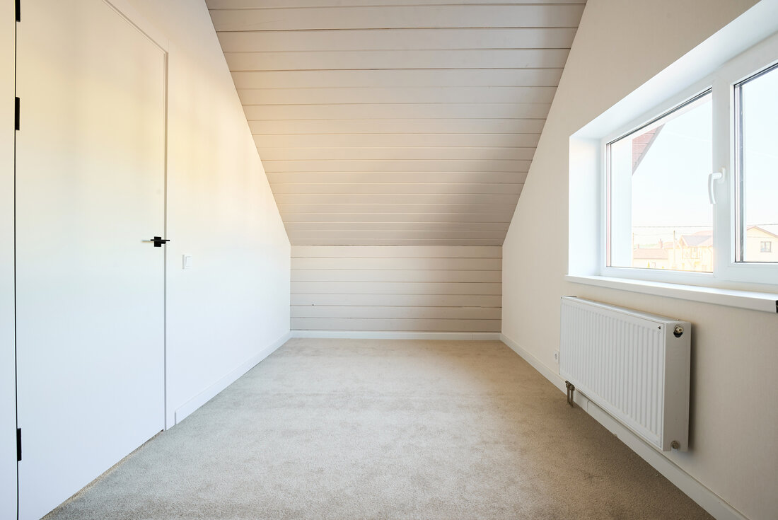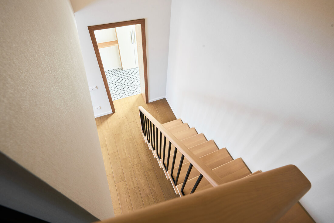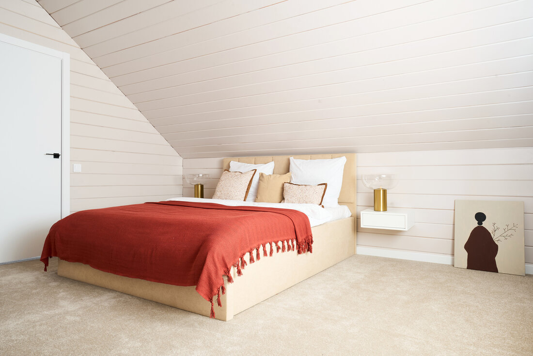 Стены тут оклеены обоями и отделаны стеновыми панелями из ЛДСП. Потолки — натяжные. Пол на первом этаже облицован плиткой (теплый пол), а для второго уровня выбрали ковролин.