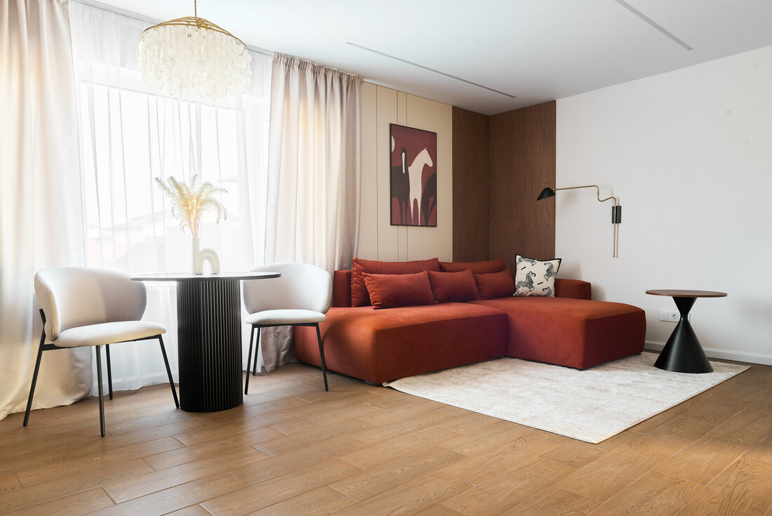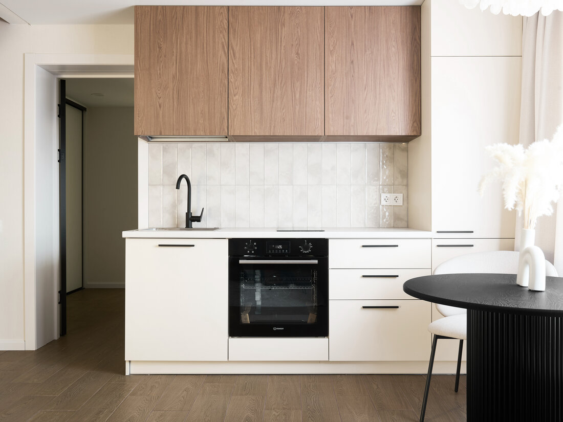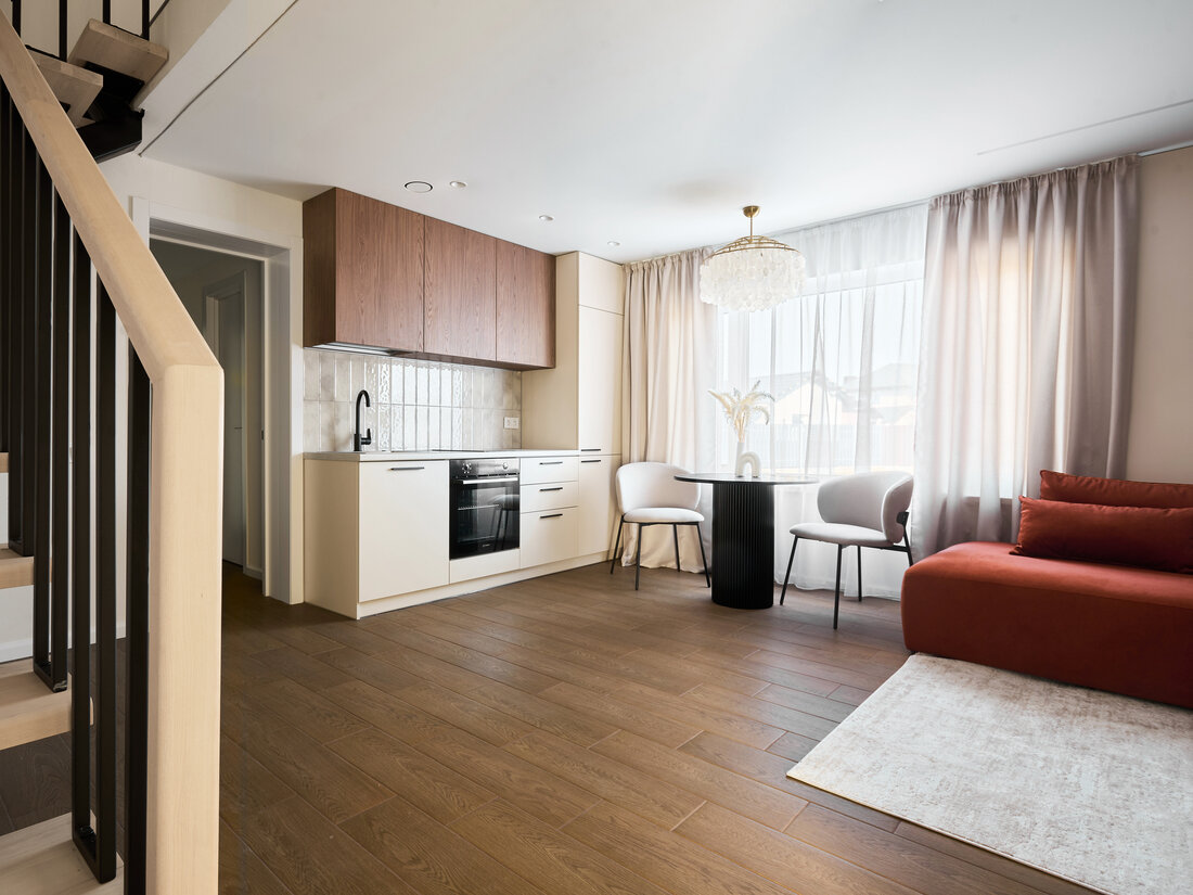 Внутри сделан хороший ремонт. Первый этаж заняли общие зоны, в том числе совмещенная кухня-гостиная с мебелью и техникой.