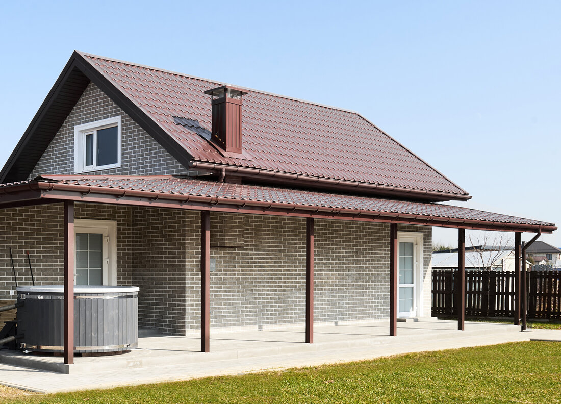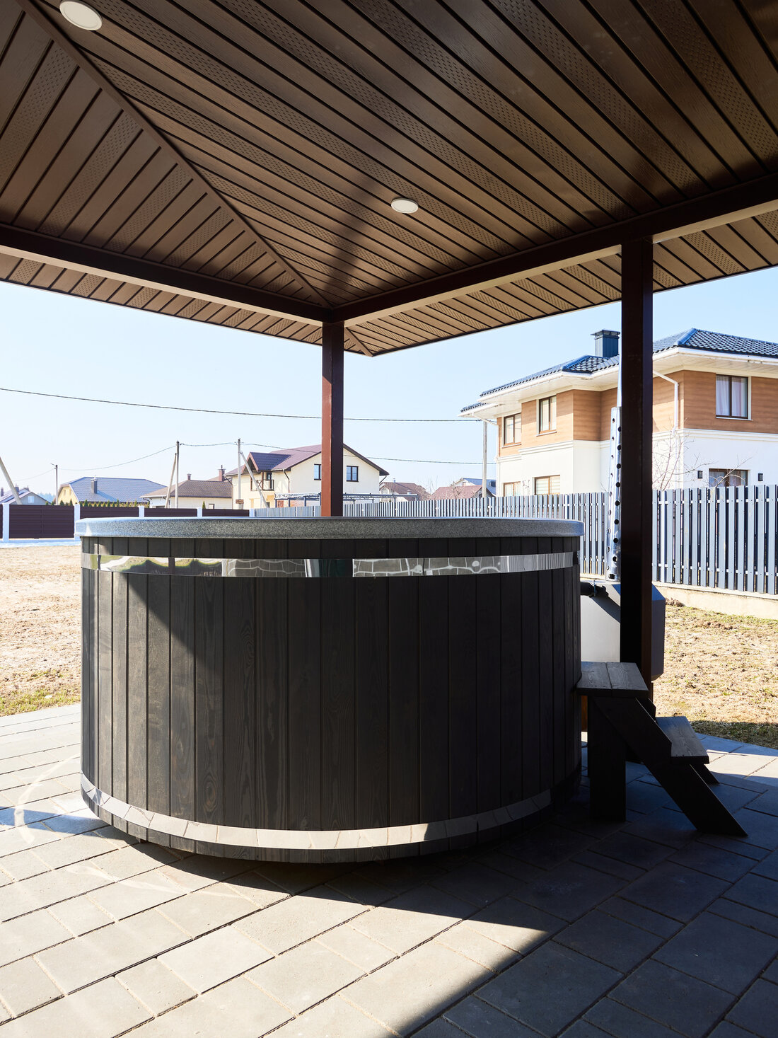 Под навесом около дома уместилась и большая купель. Места хватает, чтобы поставить садовую мебель.