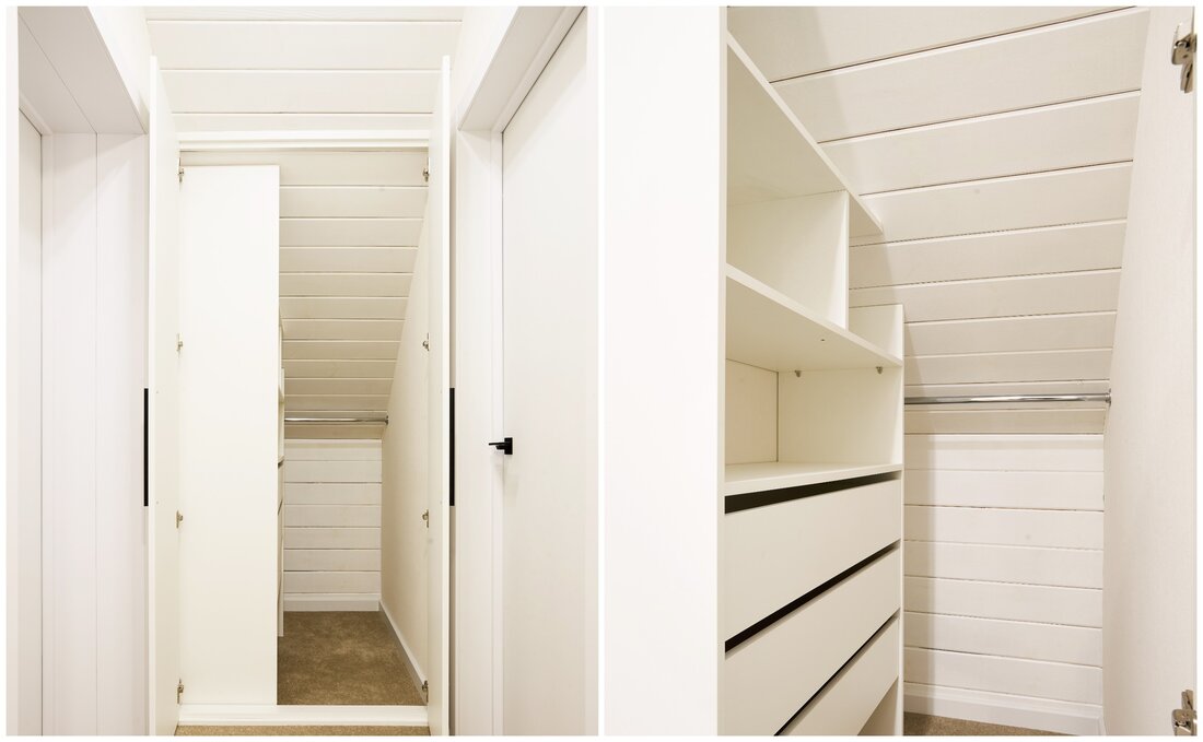 Там разместились две изолированные комнаты. В одной обустроена спальня. Также предусмотрена гардеробная.