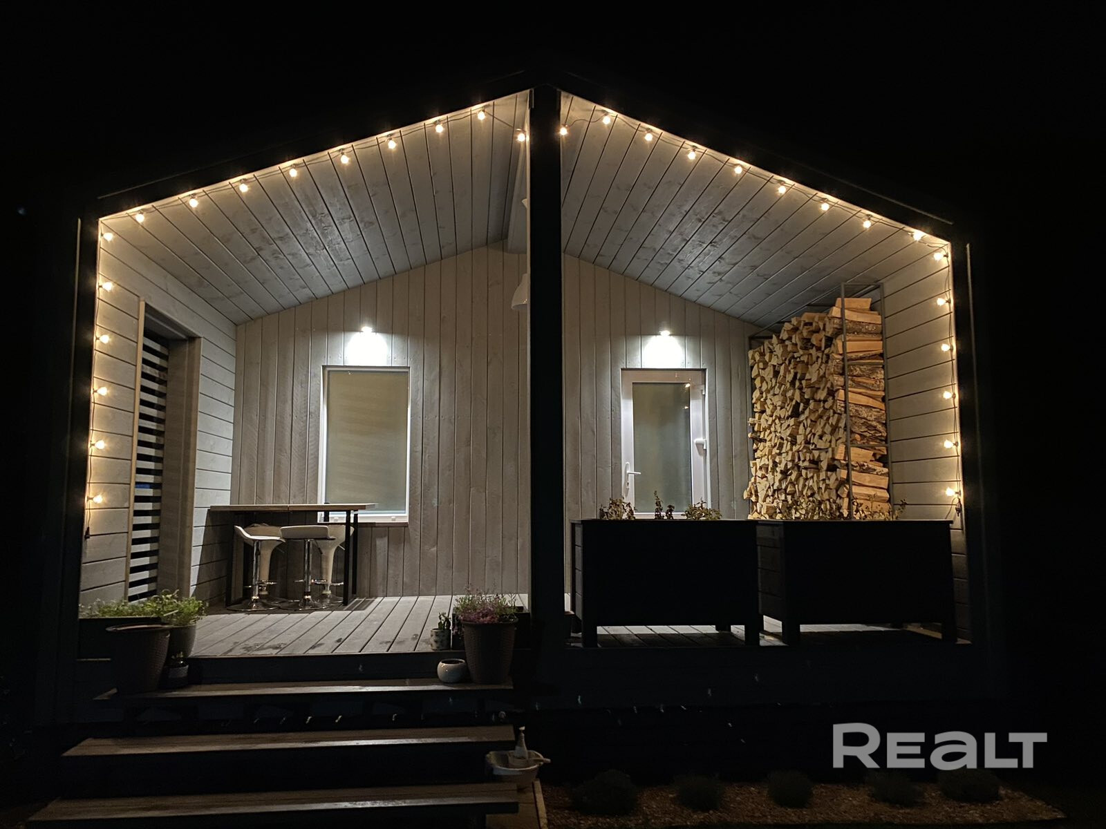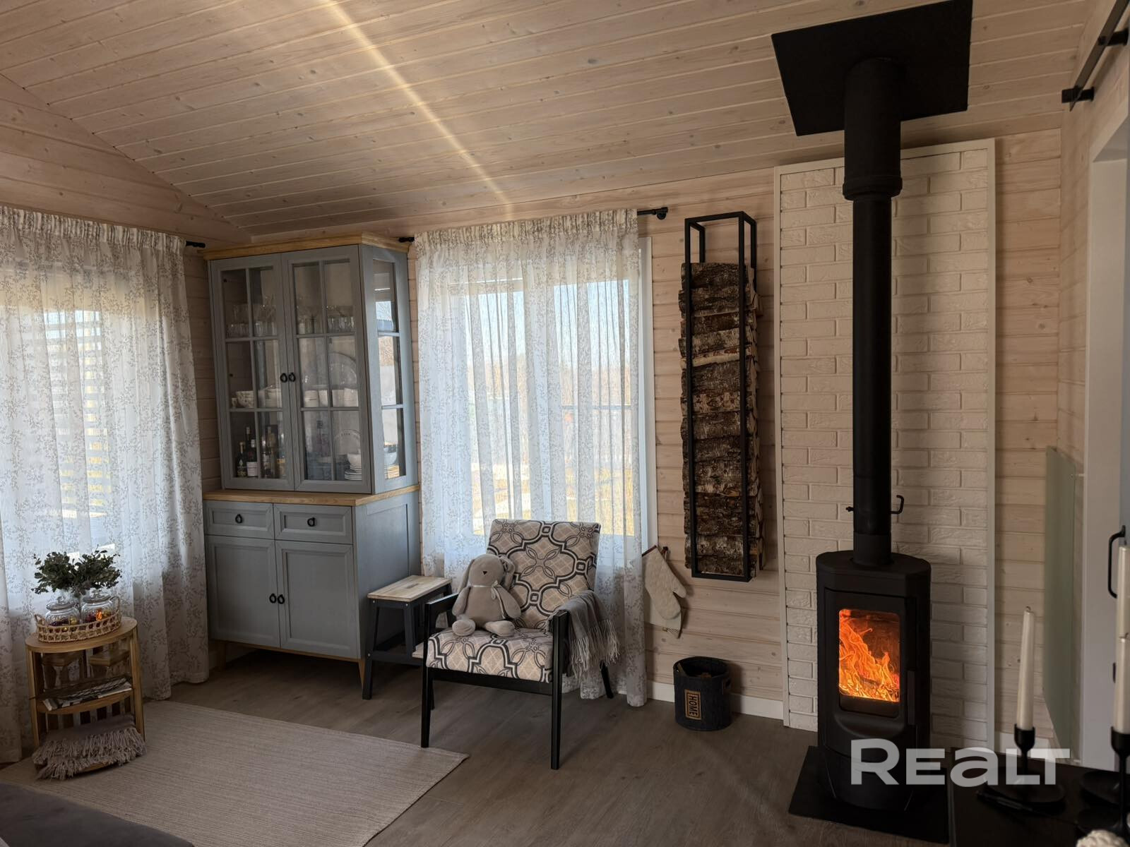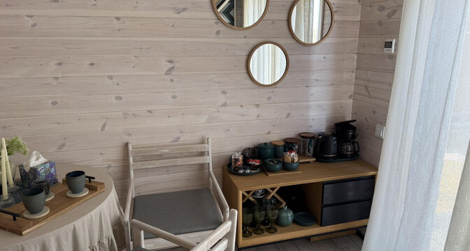Дом выглядит уютным. Внутри все отделано деревом. На полу в жилой части лежит кварцвинил, в окнах стоят стеклопакеты.