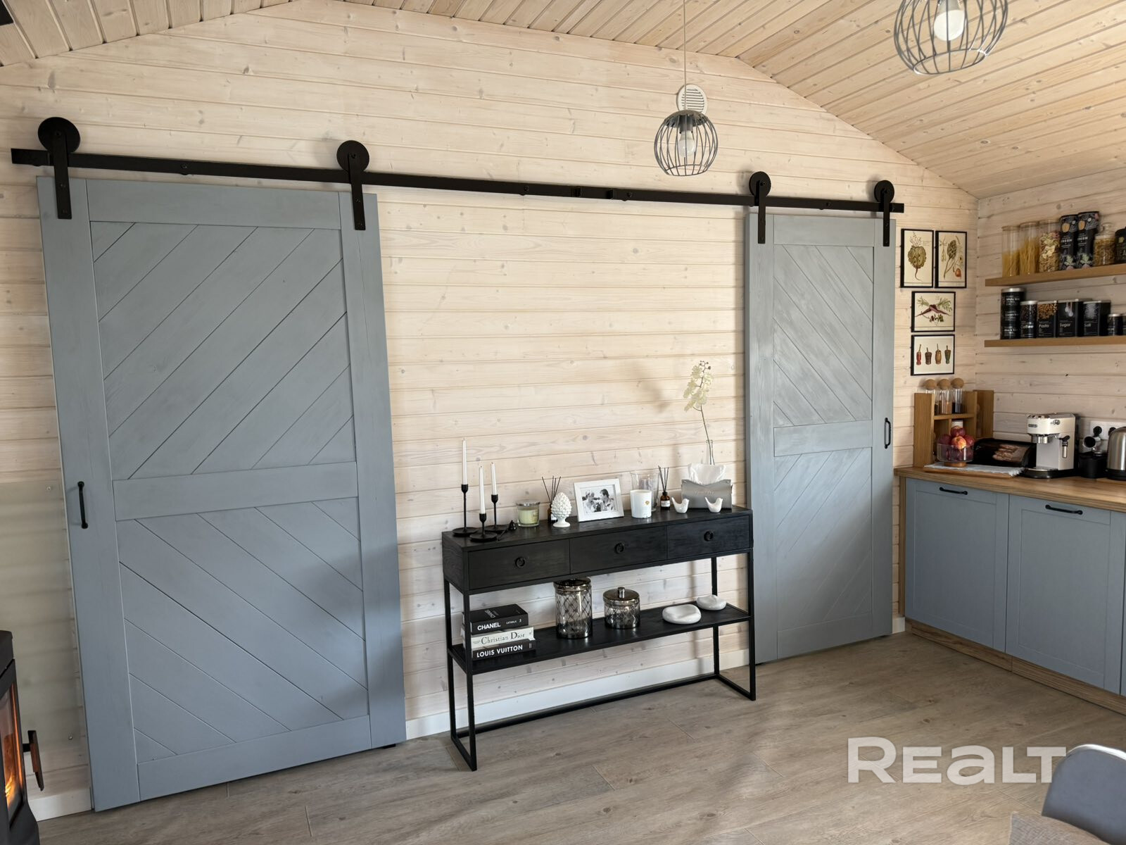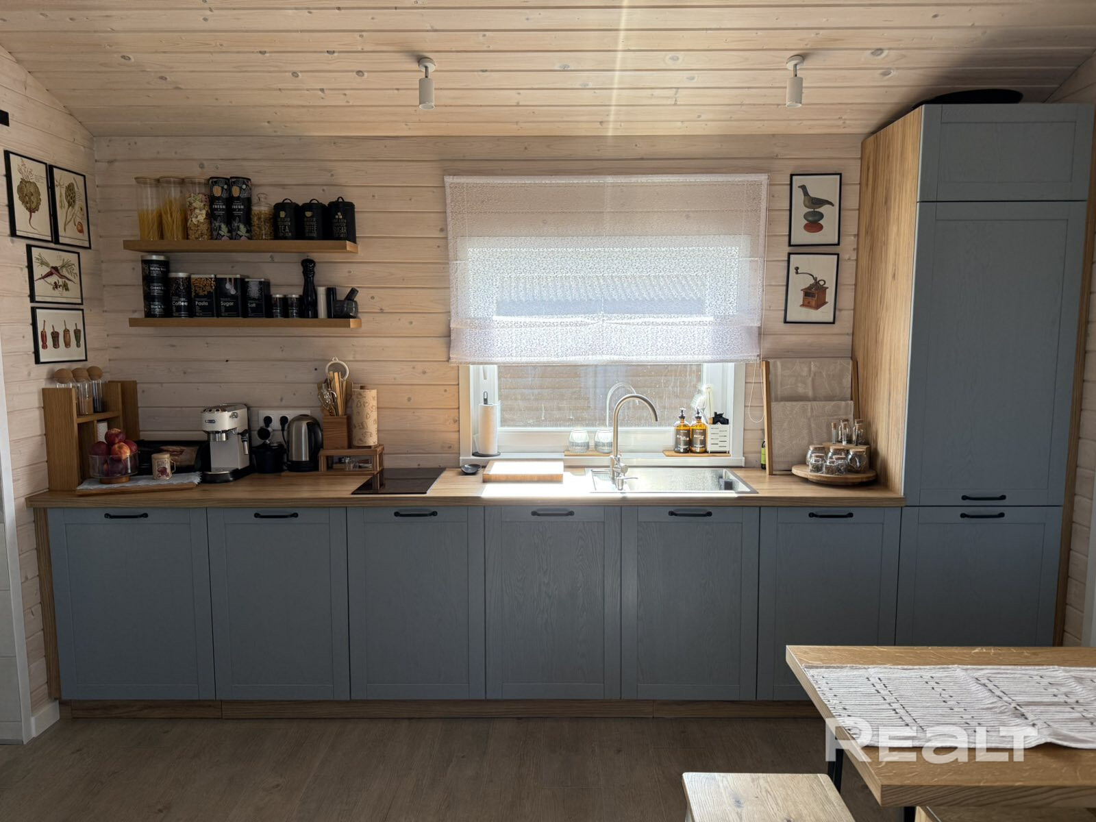 Самая большая комната — совмещенная кухня-гостиная. Здесь уже установлены гарнитур, бытовая техника: встроенный холодильник, электрическая панель. В этом помещении есть и печь-камин. Мебель выполнена из массива.