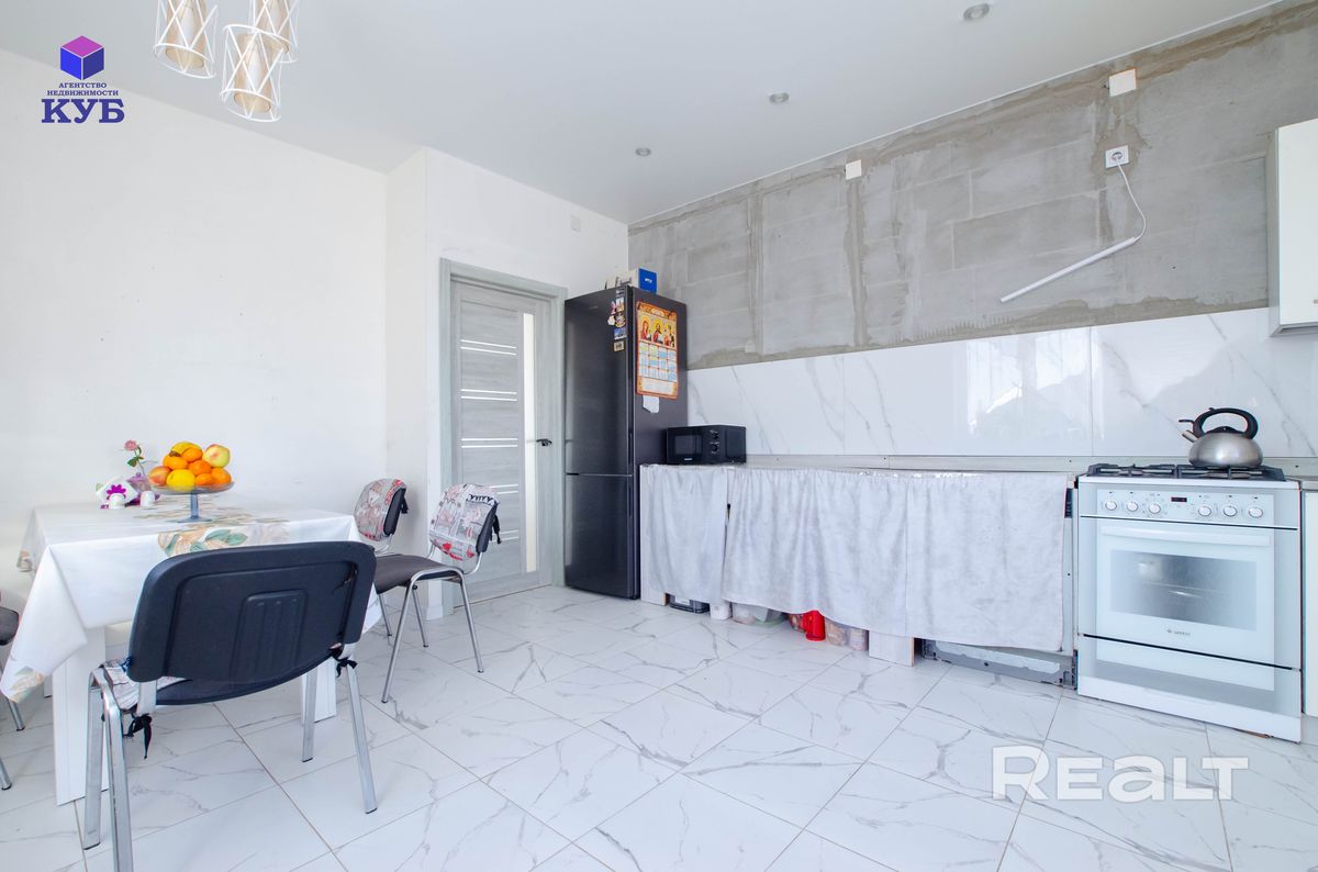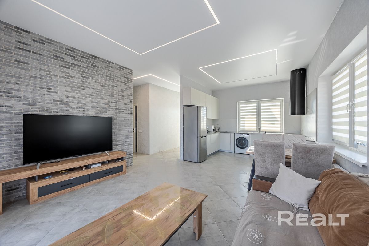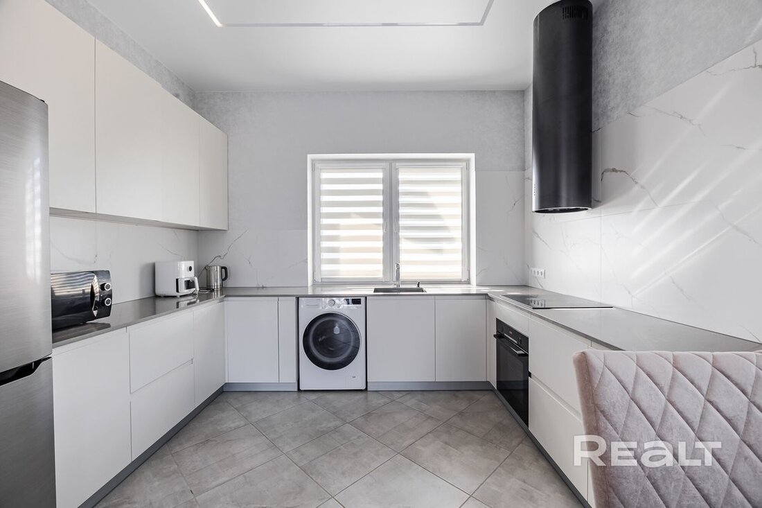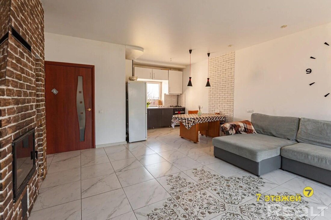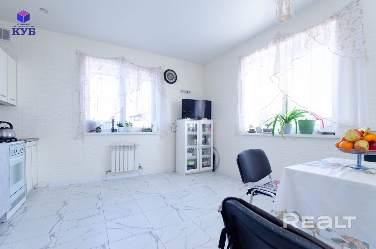 Общая площадь — 109 м2. Планировка простая: тамбур, гостиная с зоной кухни, две спальни, санузел, топочная и терраса. Продается с кухонной мебелью и бытовой техникой.