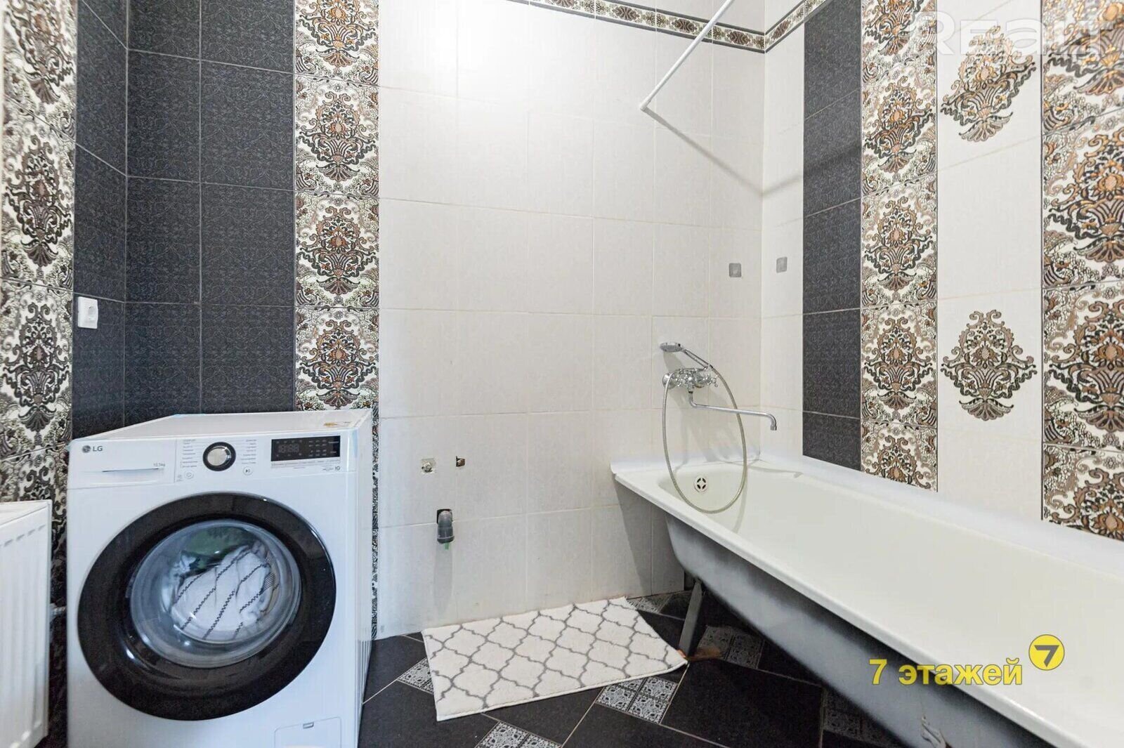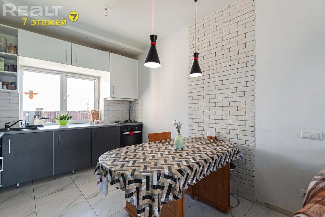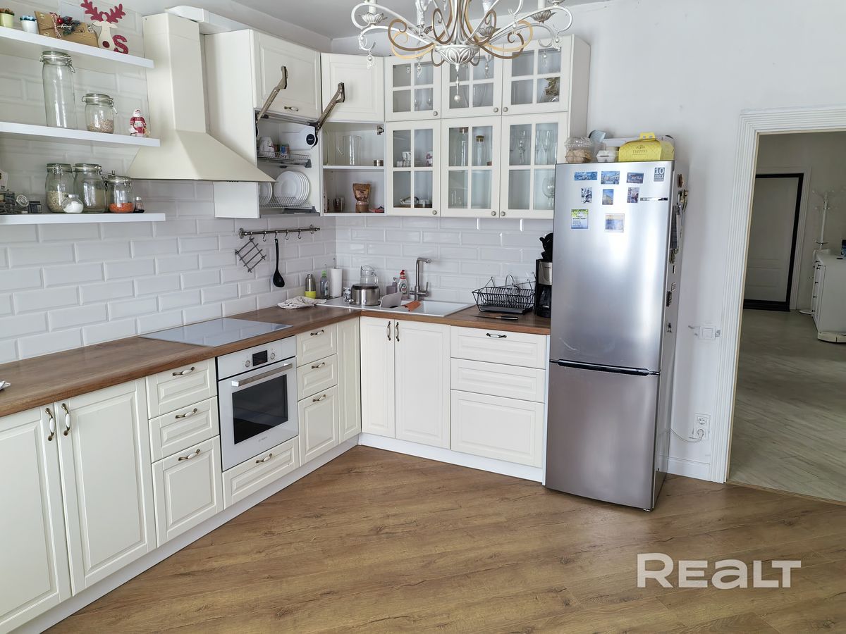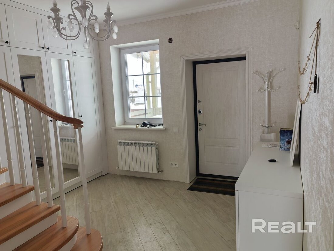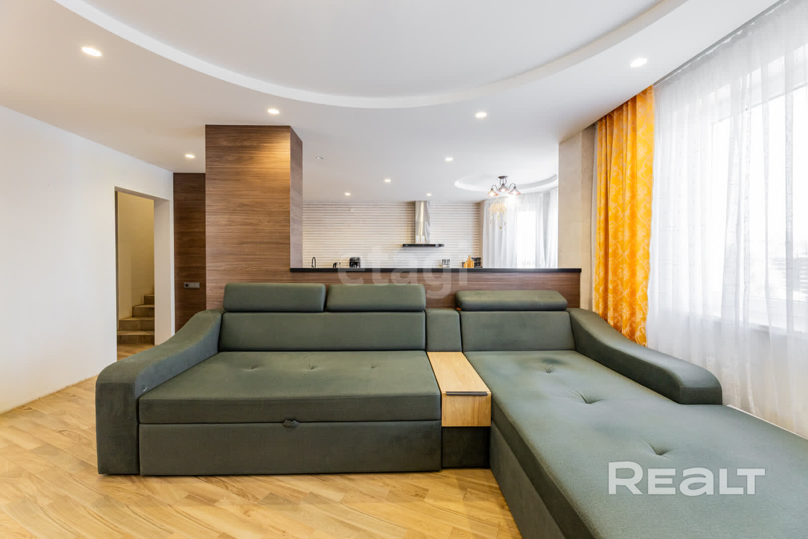 Общая площадь — 109 м2. Планировка простая: тамбур, гостиная с зоной кухни, две спальни, санузел, топочная и терраса. Продается с кухонной мебелью и бытовой техникой.