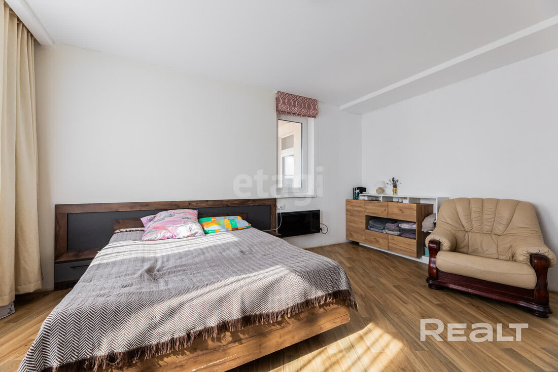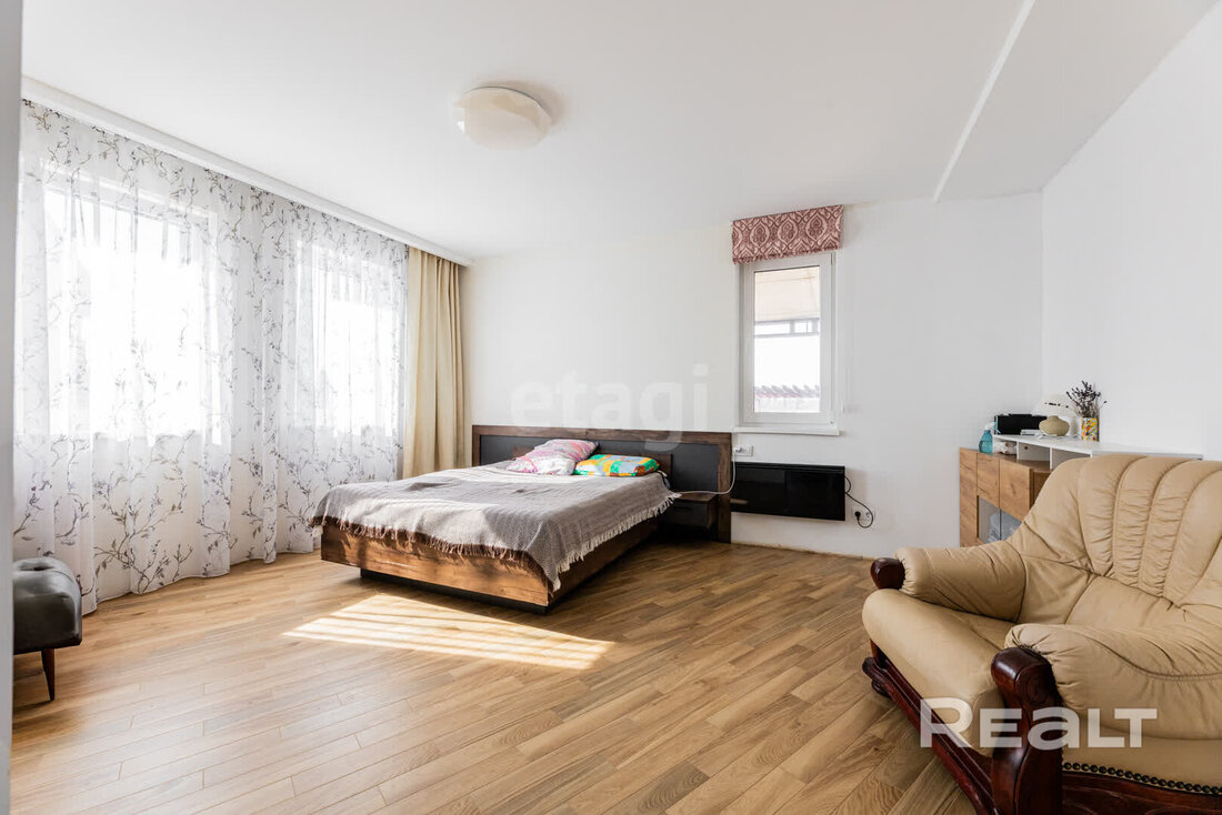 Общая площадь — 185,5 м2. На первом этаже: гостиная, кухня, жилая комната, прихожая, раздельный санузел, гараж с топочной. На втором — 4 спальни и санузел.