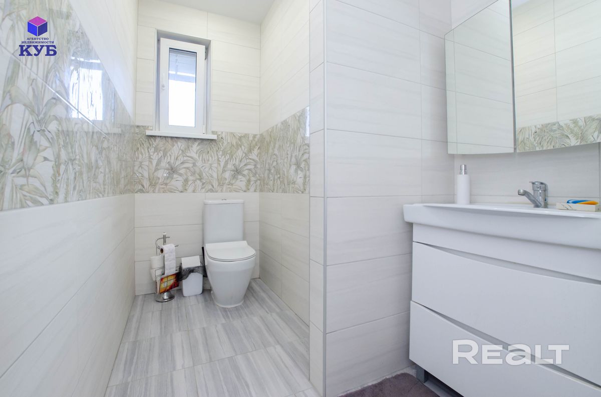 Здесь продается благоустроенный коттедж, полностью готовый к проживанию. Построен в 2016 году. Фундамент ленточный, стены блочные, перекрытия железобетонные. Два этажа, общая площадь — 90 квадратов.