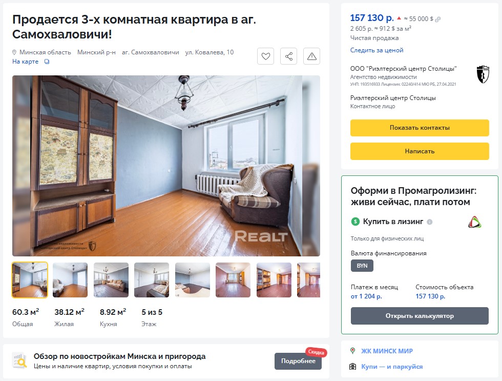На днях в объявлениях о продаже квартир и домов на Realt появился новый калькулятор. Теперь выбрать для себя жилье стоимостью от 35 тысяч долларов в эквиваленте в любой точке Беларуси можно, воспользовавшись лизинговой программой от компании «Промагролизинг». Кому доступен такой вариант покупки и чем он удобен?
