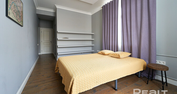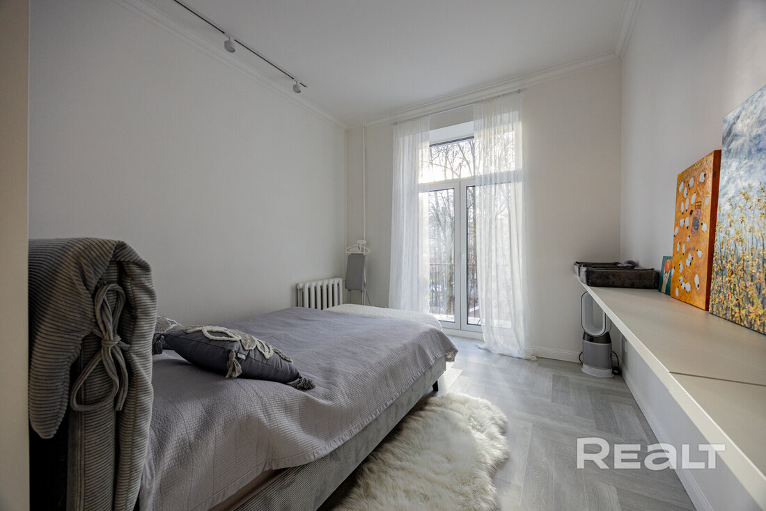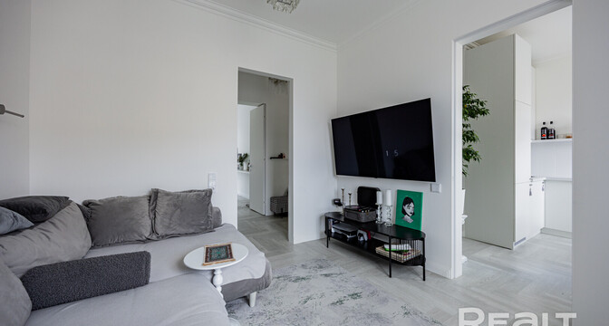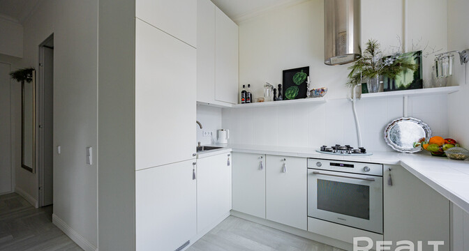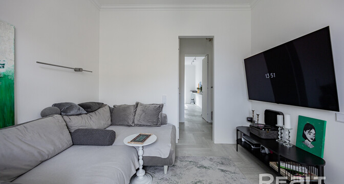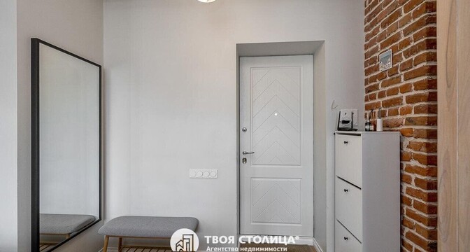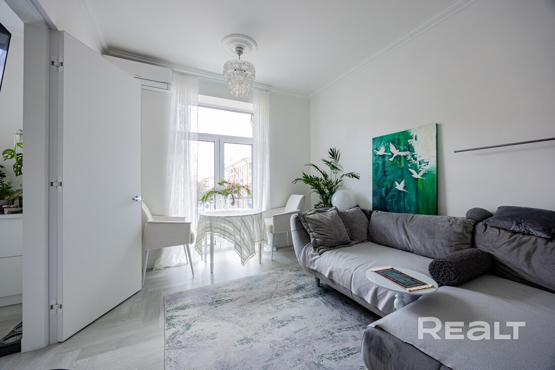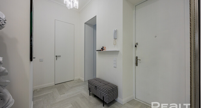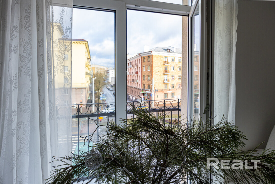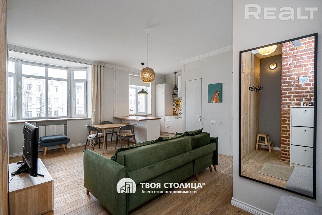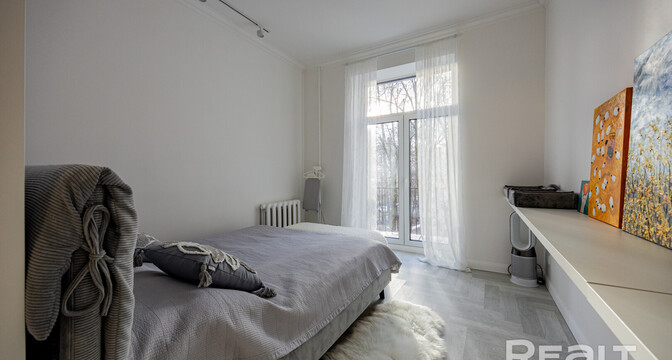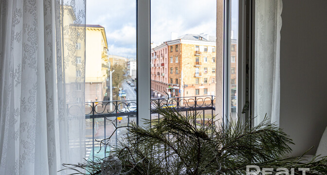 Следующая квартира — двухкомнатная с перепланировкой в евроформат. Находится на четвертом этаже четырехэтажной сталинки на улице Змитрока Бядули, 3. Рядом — трамвайное кольцо и остановка — трамваев и автобусов. Станция метро «Площадь Победы» — в восьми минутах ходьбы.