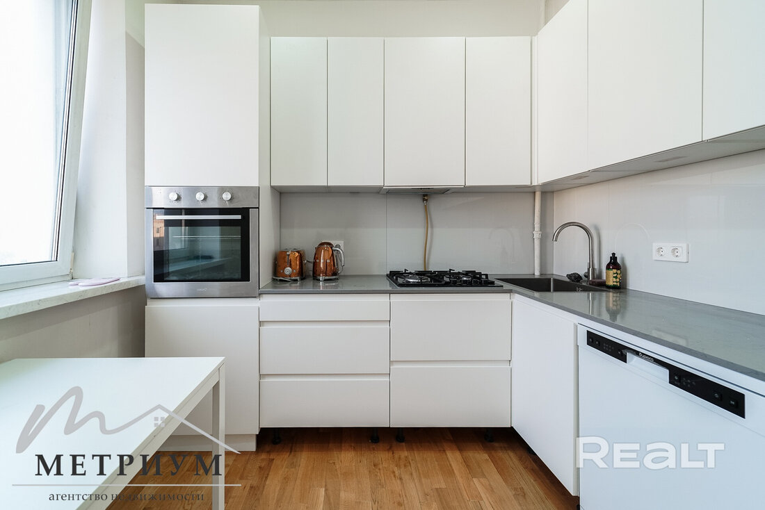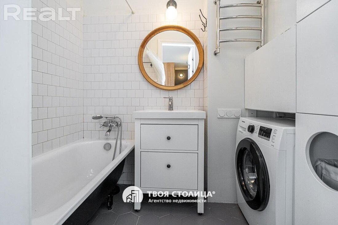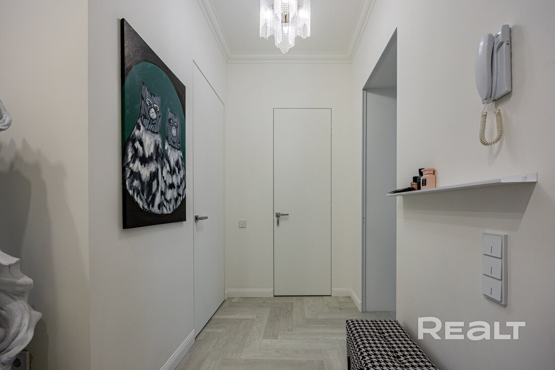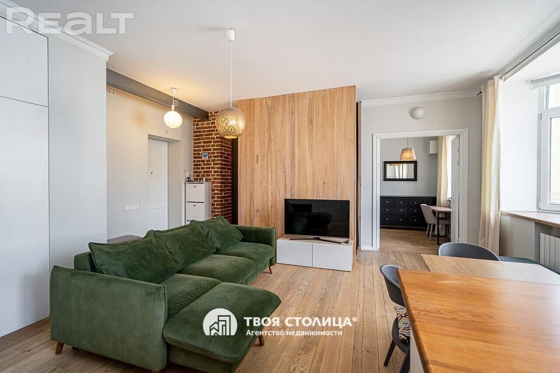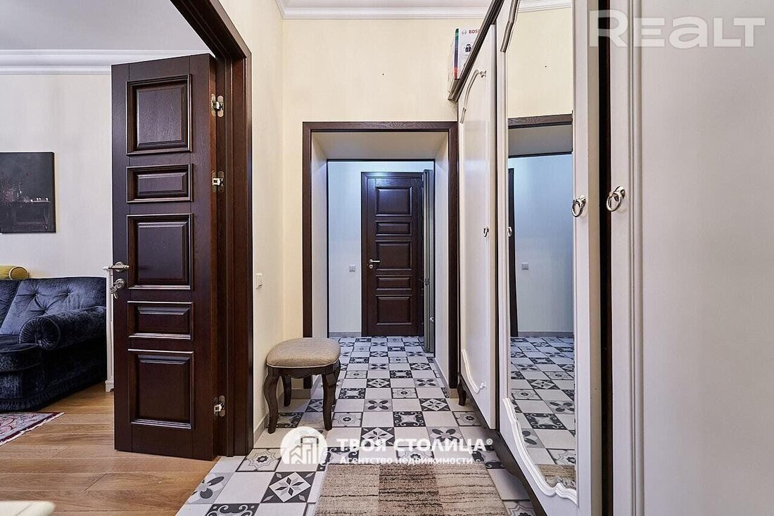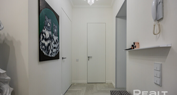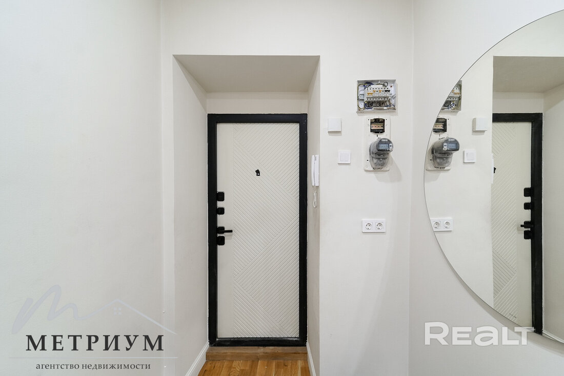 Следующая квартира — двухкомнатная с перепланировкой в евроформат. Находится на четвертом этаже четырехэтажной сталинки на улице Змитрока Бядули, 3. Рядом — трамвайное кольцо и остановка — трамваев и автобусов. Станция метро «Площадь Победы» — в восьми минутах ходьбы.