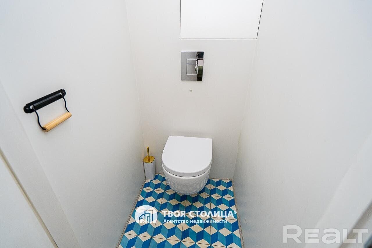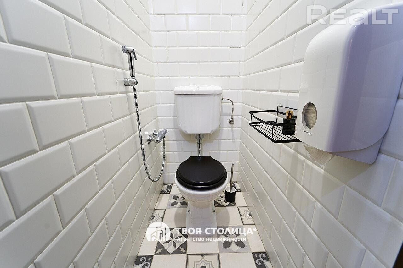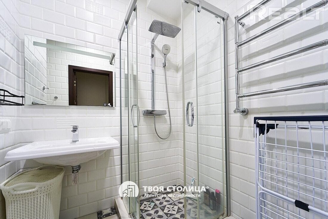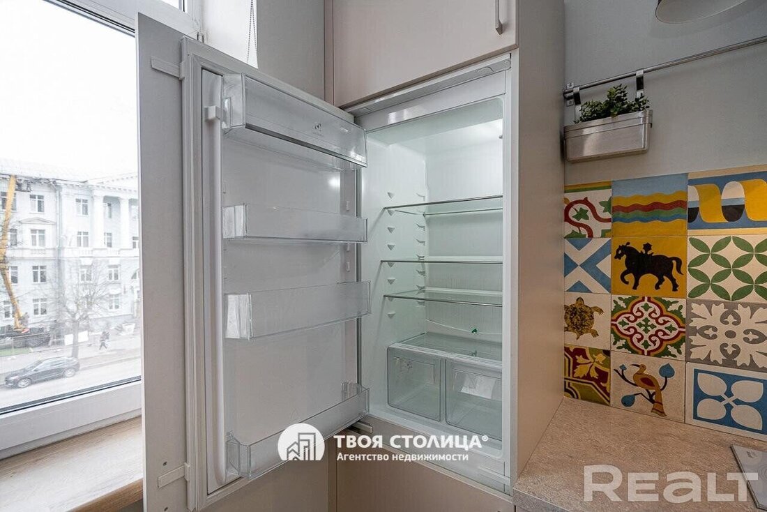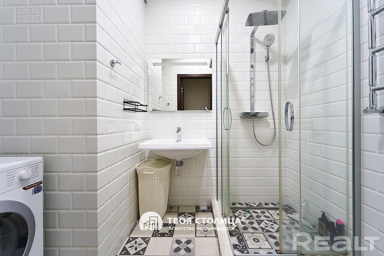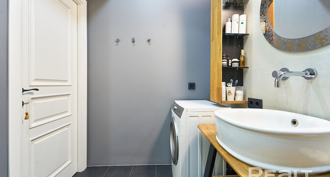 Следующая квартира — двухкомнатная с перепланировкой в евроформат. Находится на четвертом этаже четырехэтажной сталинки на улице Змитрока Бядули, 3. Рядом — трамвайное кольцо и остановка — трамваев и автобусов. Станция метро «Площадь Победы» — в восьми минутах ходьбы.