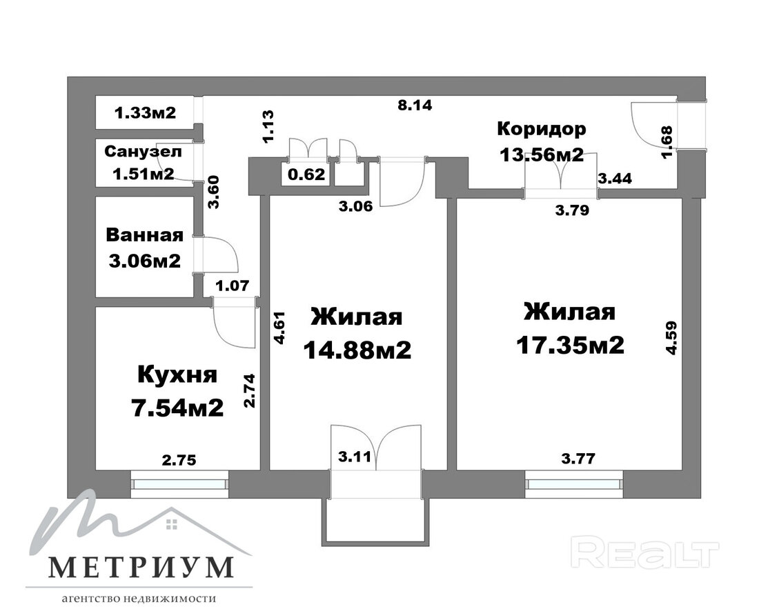 Общая площадь — 61 квадрат, жилая — 35 квадратов и кухонная зона — 10 метров. Между кухней и гостиной двери нет.