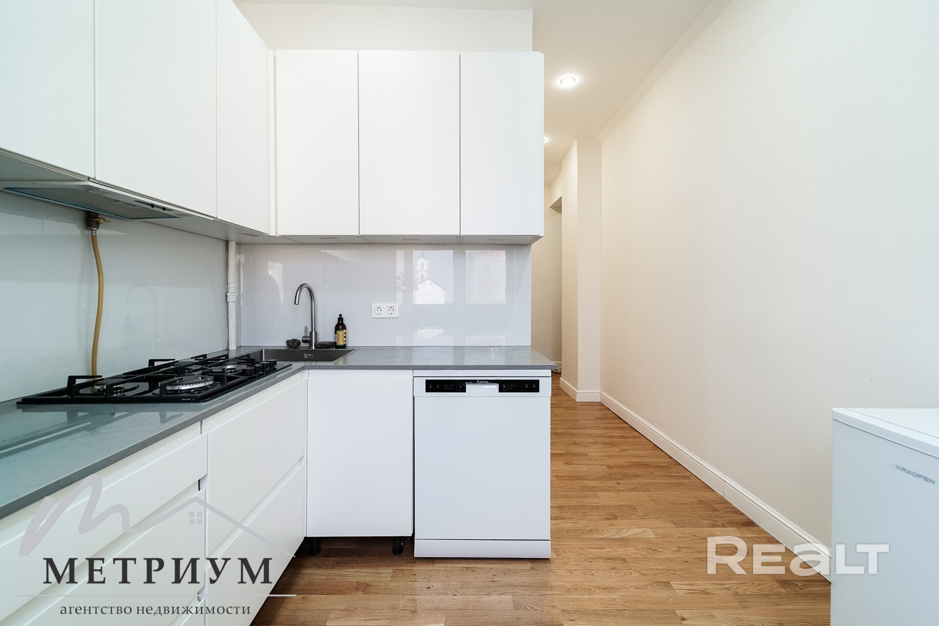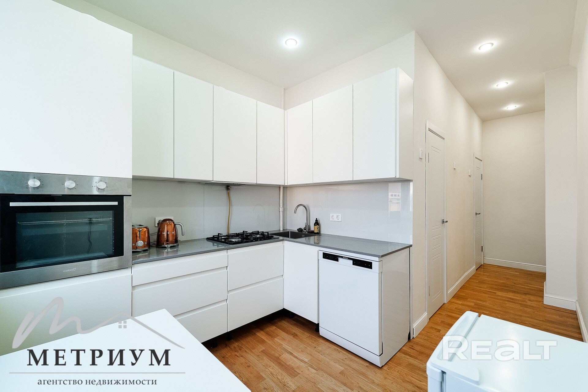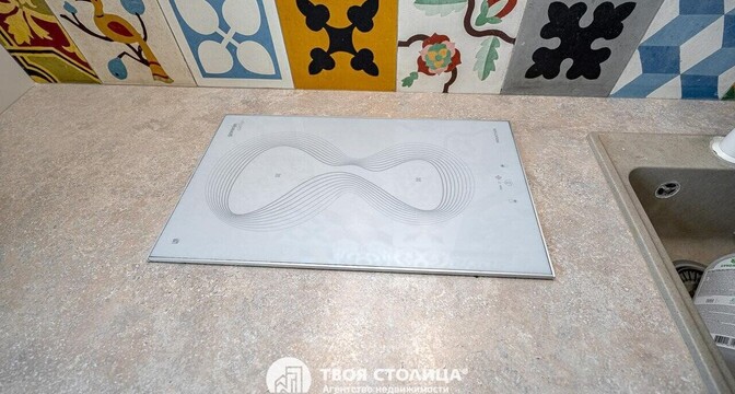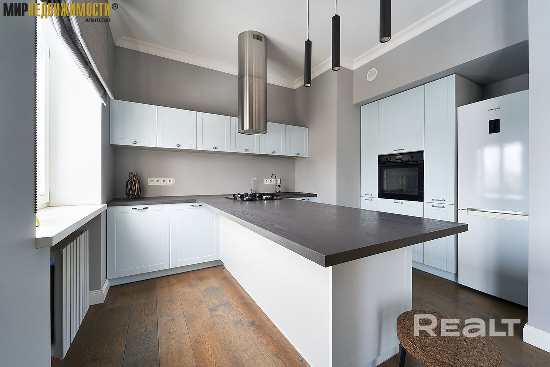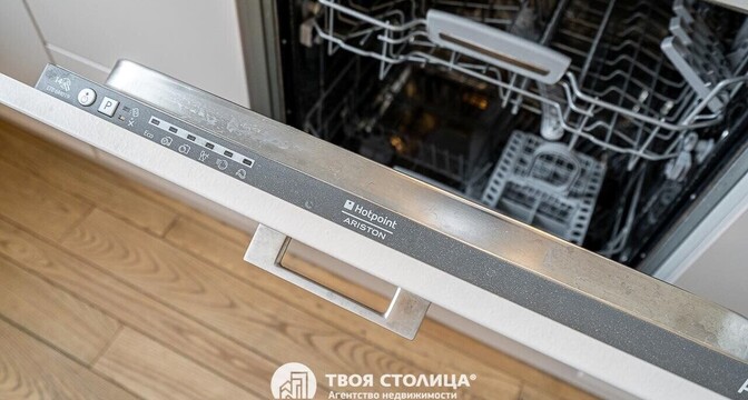 В кухне из техники есть посудомоечная машина, холодильник духовой шкаф, вытяжка и варочная панель.