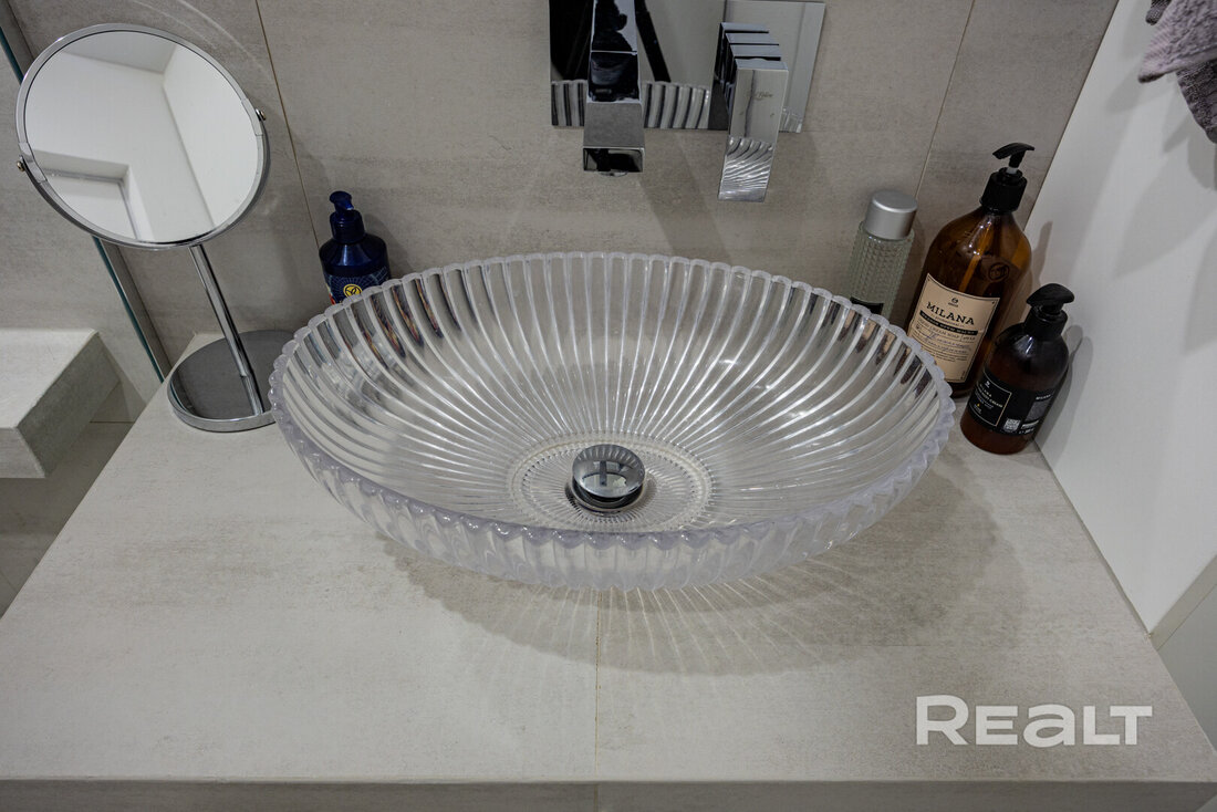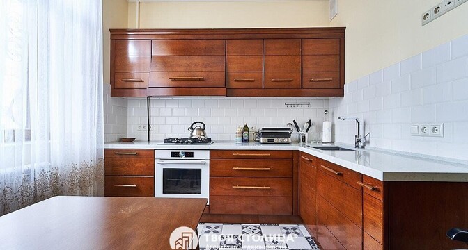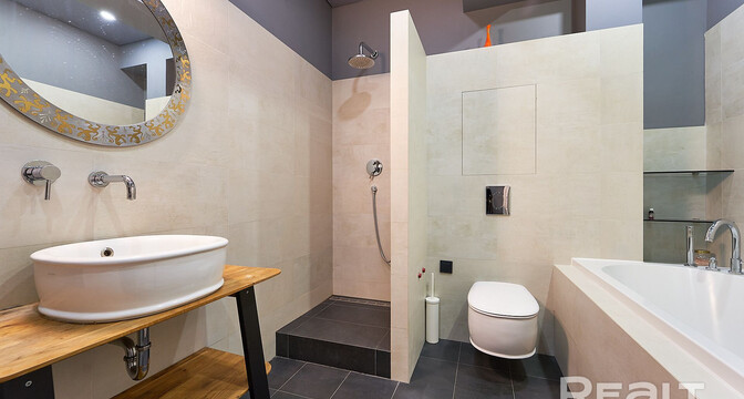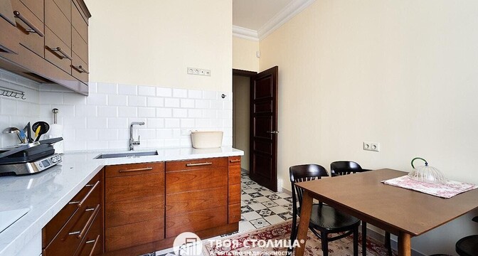 На полу в квартире уложена чешская дубовая паркетная доска, стеклопакеты — деревянные. В кухне из техники есть духовой шкаф, варочная поверхность, вытяжка, посудомоечная машина и холодильник. Установлены фильтры для воды.
