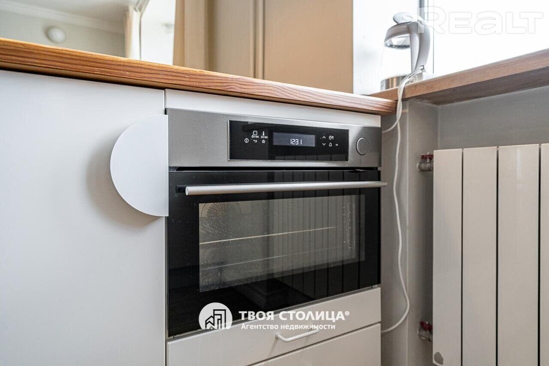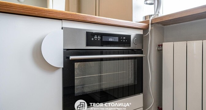В квартире заменили электропроводку и другие коммуникации. На полу постелили массив дуба. В этой двушке минимум мебели, но самое главное — кухня и санузел оборудованы полностью. Духовой шкаф и газовая плита в кухне от бренда ZorG, а столешница выполнена из камня.