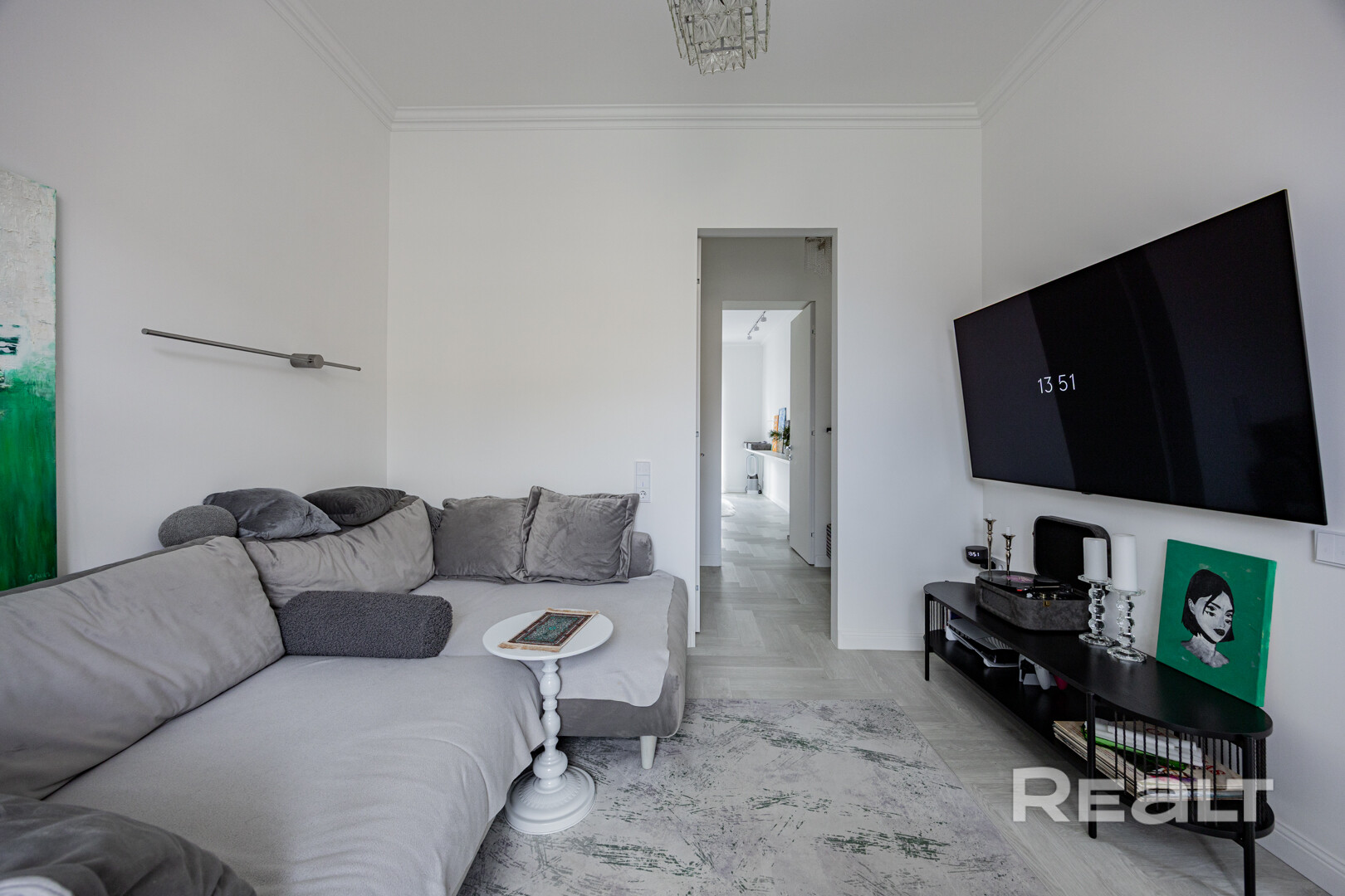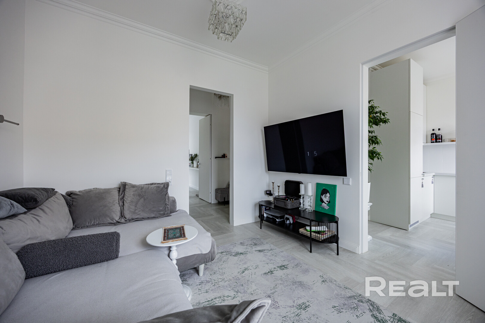 Двушка евроформата находится на третьем этаже. Высота потолков — 2,95 метра. Гостиная объединена с кухней, а в изолированной комнате оборудована спальня. Общая площадь — 50 квадратных метров. Про эту квартиру мы совсем недавно рассказывали отдельно.