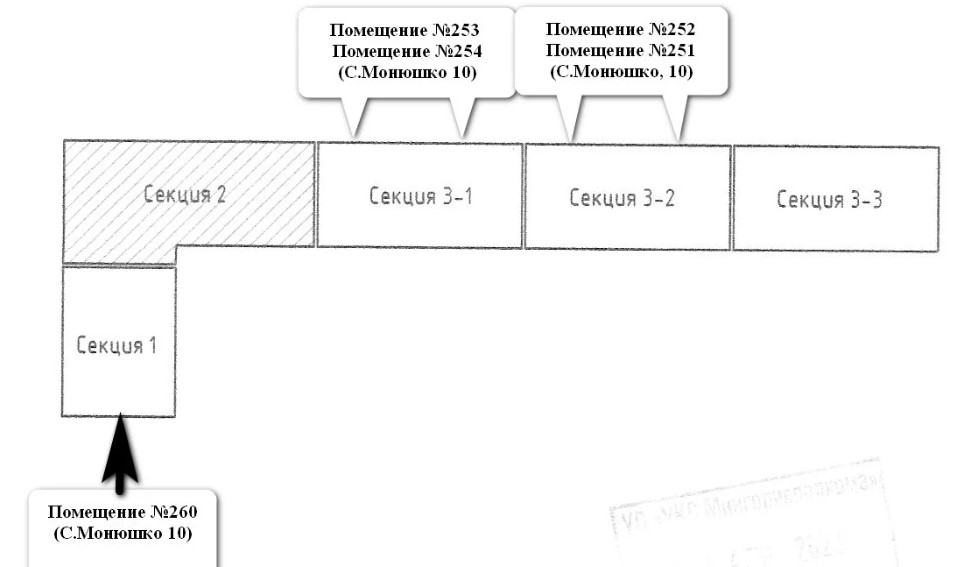 5) Помещение административного назначения общей площадью 67,3 м² с машиноместом. Начальная стоимость помещения с учетом НДС — 171 209,23 BYN, размер задатка — 17 000 BYN. Чтобы ознакомиться с планировкой, нажмите сюда.