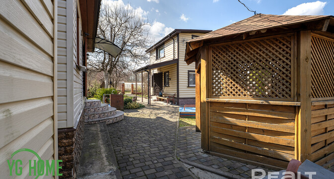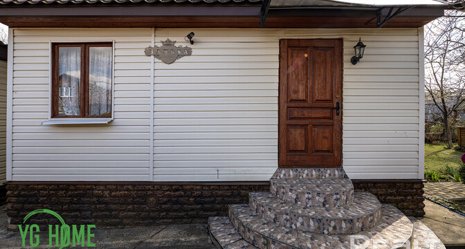 Участок небольшой — 4 сотки. Высажены яблони, груши, виноград, а по периметру участка — декоративный виноград в качестве зеленого забора. Есть баня, летняя кухня, беседка и хозпостройки. Кроме основного участка, есть еще 3 сотки обработанной земли, где можно что-то выращивать.