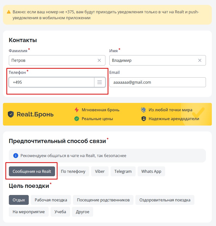 Если вы гость, и вы вводите, например, российский номер телефона, то вам придет уведомление об успешном бронировании в чате на сайте и в push-уведомлении в мобильном приложении Realt. А арендодатель сможет связаться с вами уже не только в чате Realt, но и по указанному вами номеру.