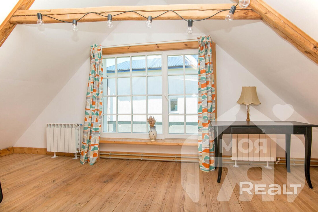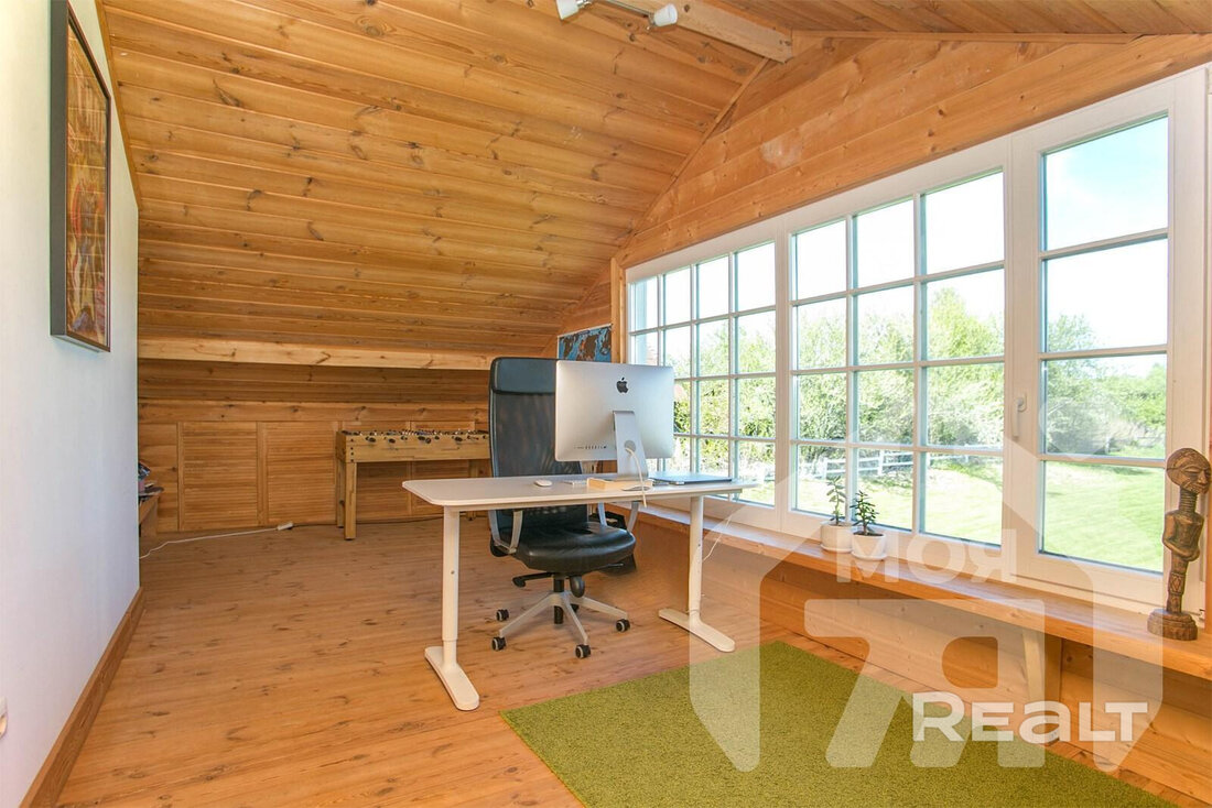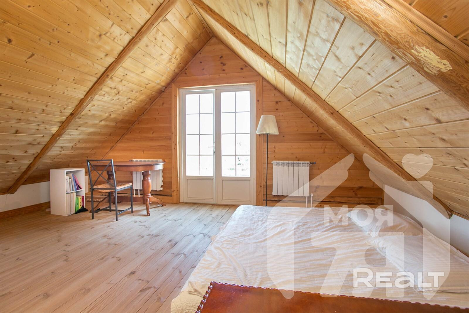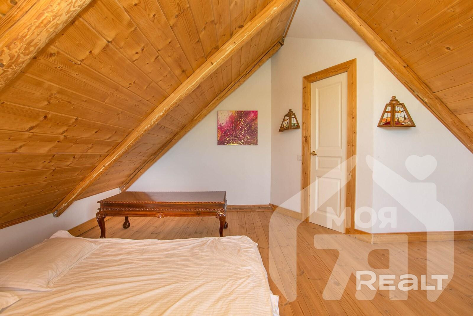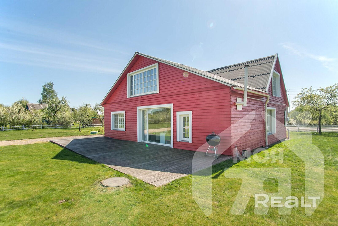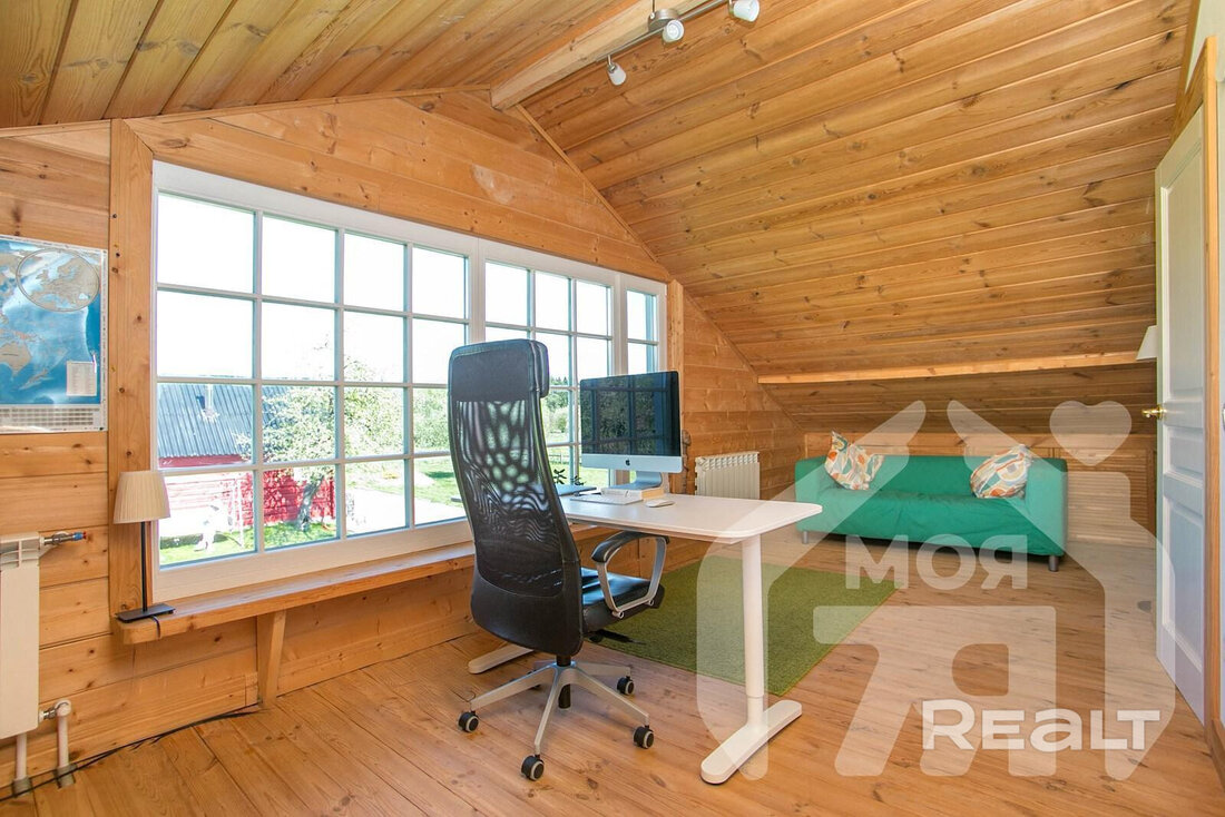 На просторном участке в 60 соток в деревне Лапоровичи, в 400 метрах от Минского моря, продается красивый деревянный дом с дизайнерским интерьером. Благодаря расположению на возвышенности из окон мансардного этажа открывается живописный вид на водные просторы. В нем все готово для комфортного проживания: от мебели и бытовой техники до самого современного инженерного проживания. Стоимость для этой локации выглядит адекватной. Вот подробности.