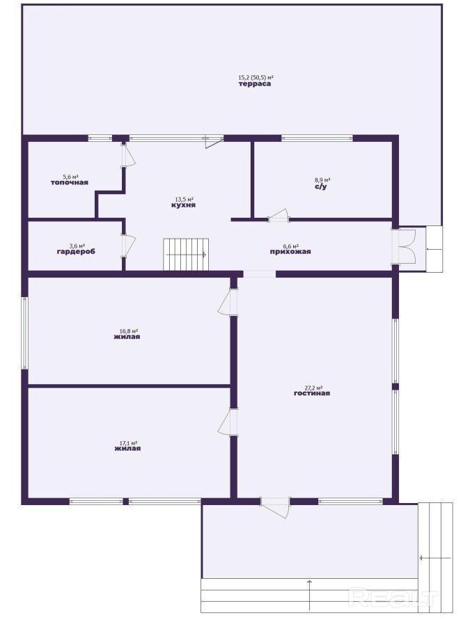 Общая площадь — 201,8 м². На первом этаже расположены гостиная с выходом на террасу, две жилые комнаты, кухня с лестницей на второй этаж, санузел, топочная, гардеробная и прихожая.