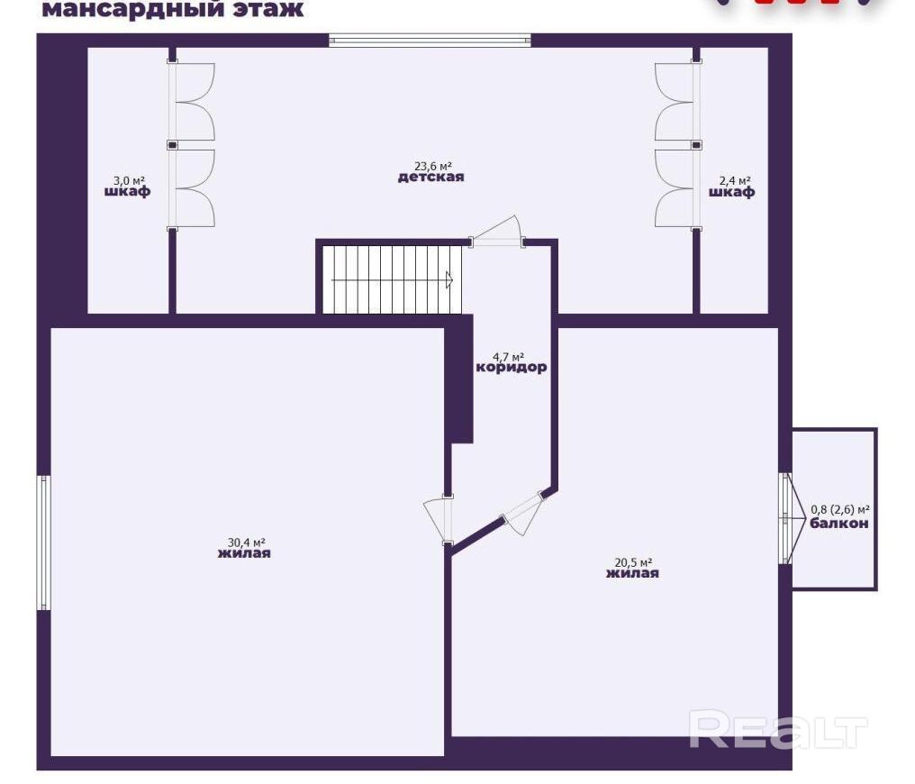 На мансарде — три спальни с гардеробными и балконом. Такая планировка обеспечивает четкое зонирование на общую и приватную зоны.