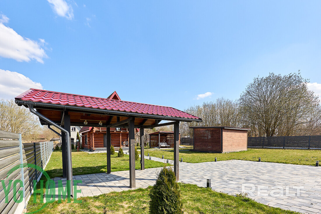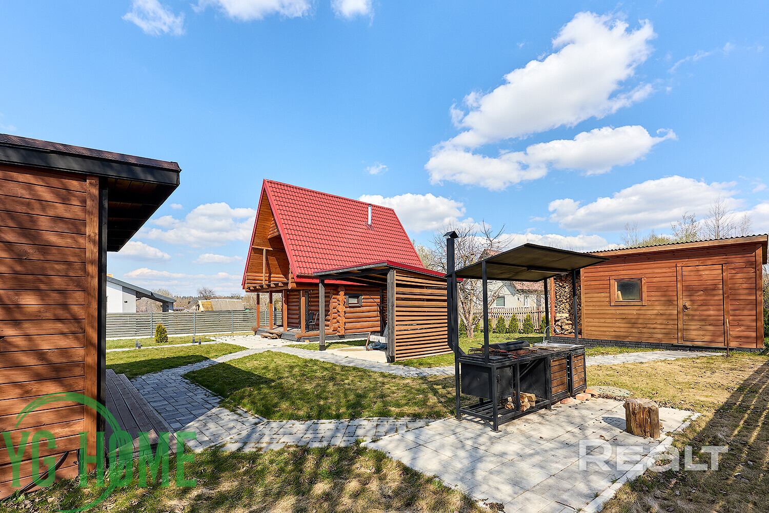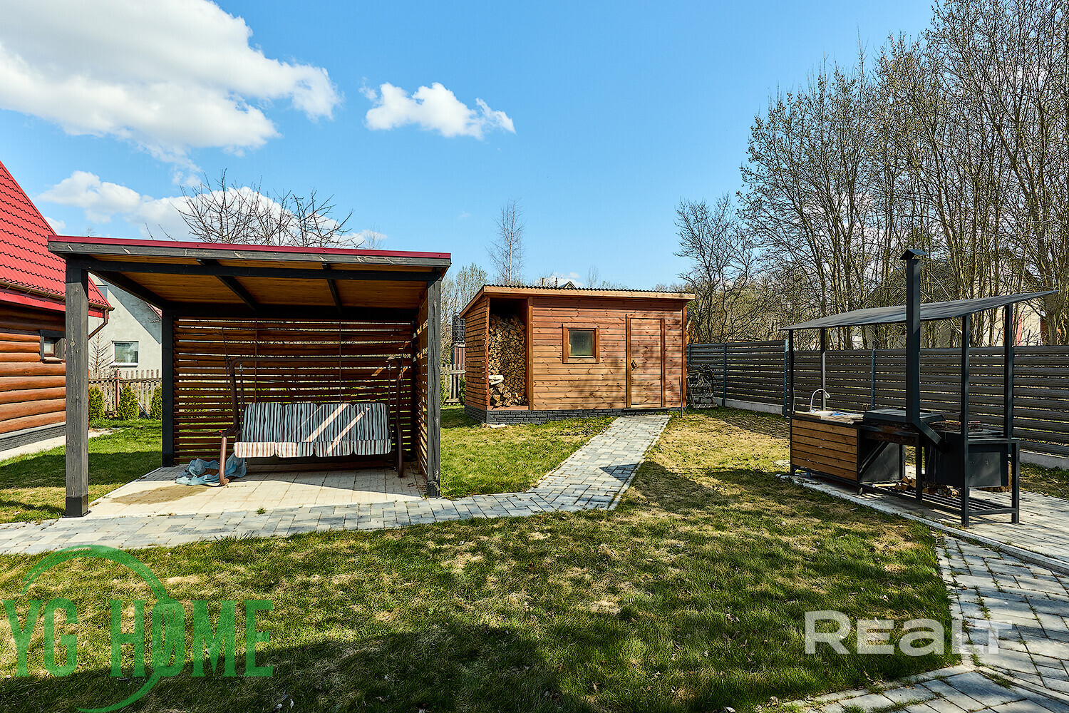 На ухоженной территории есть все, что нужно для полноценного отдыха. На фотографиях можно заметить беседку, барбекю, садовые качели, навес для машины и хозпостройки.