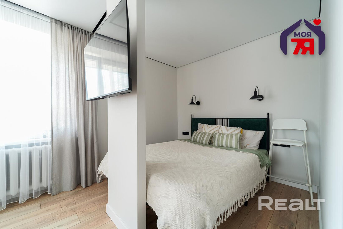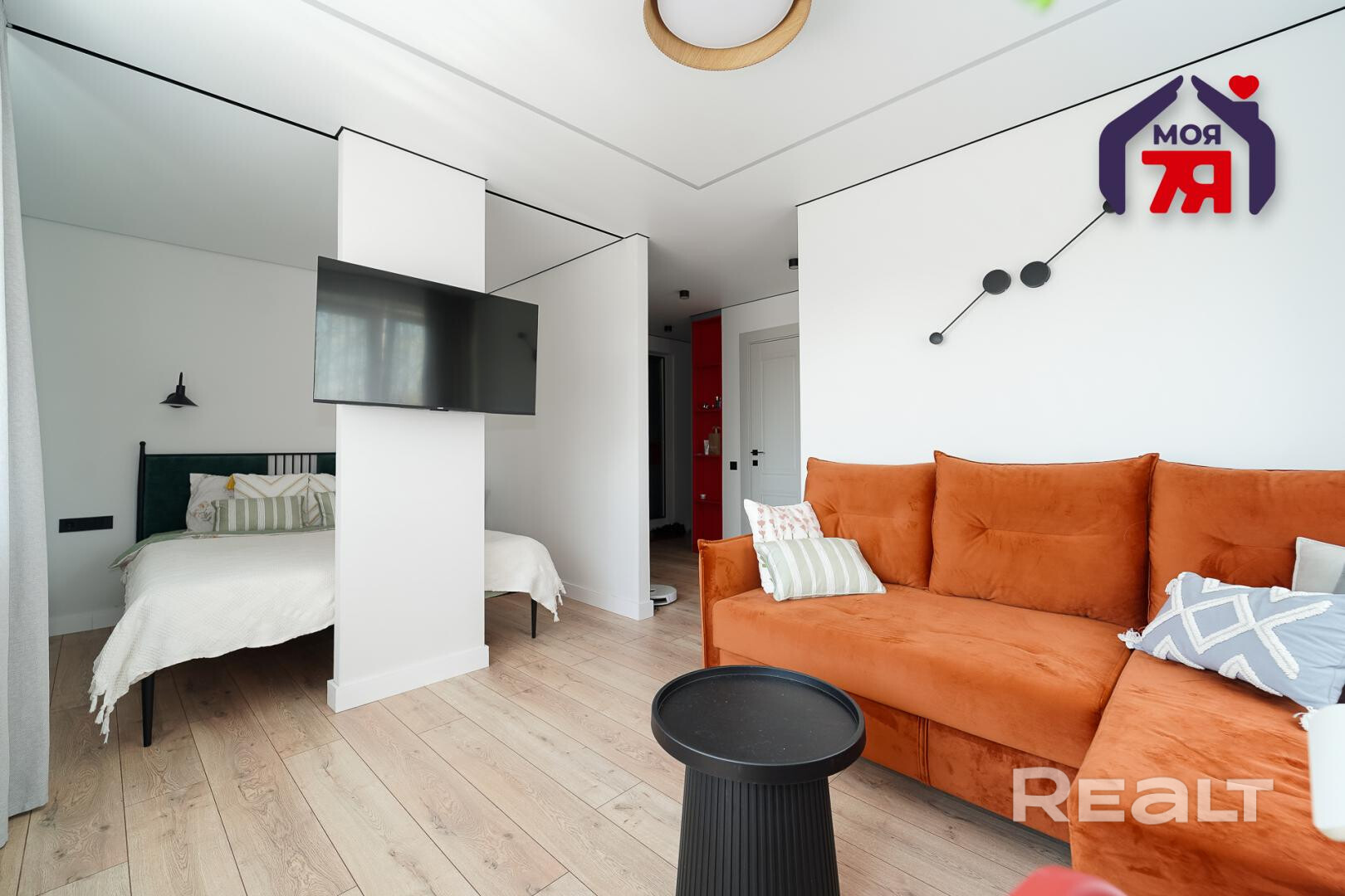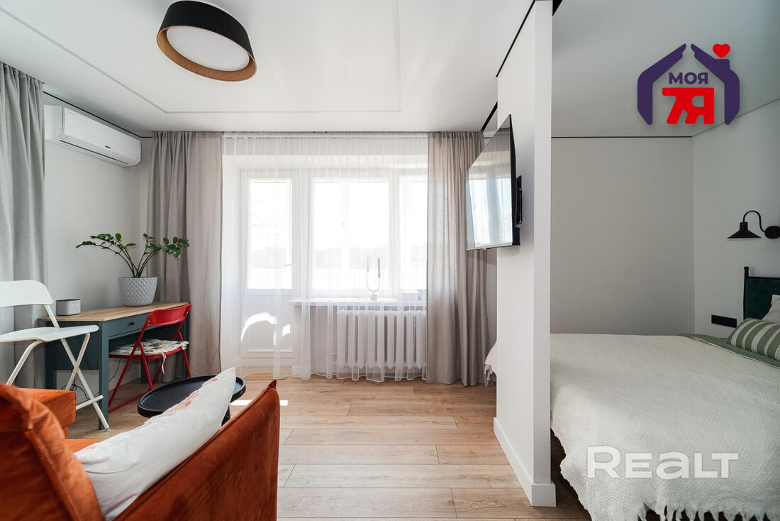 Комнату разделили на зону гостиной и спальную зону, где разместили большую кровать.