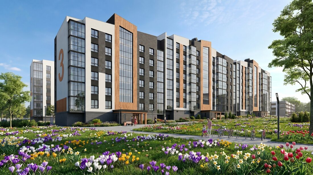 Сегодняшнее предложение касается дома № 3. Он рассчитан на 3 подъезда, 6−7 этажей и сразу 164 квартиры площадью от 34 до 82 квадратов. В квартирах планируются высокие потолки (2,7 метра) и увеличенные окна. Сдавать жилье будут с черновой отделкой.