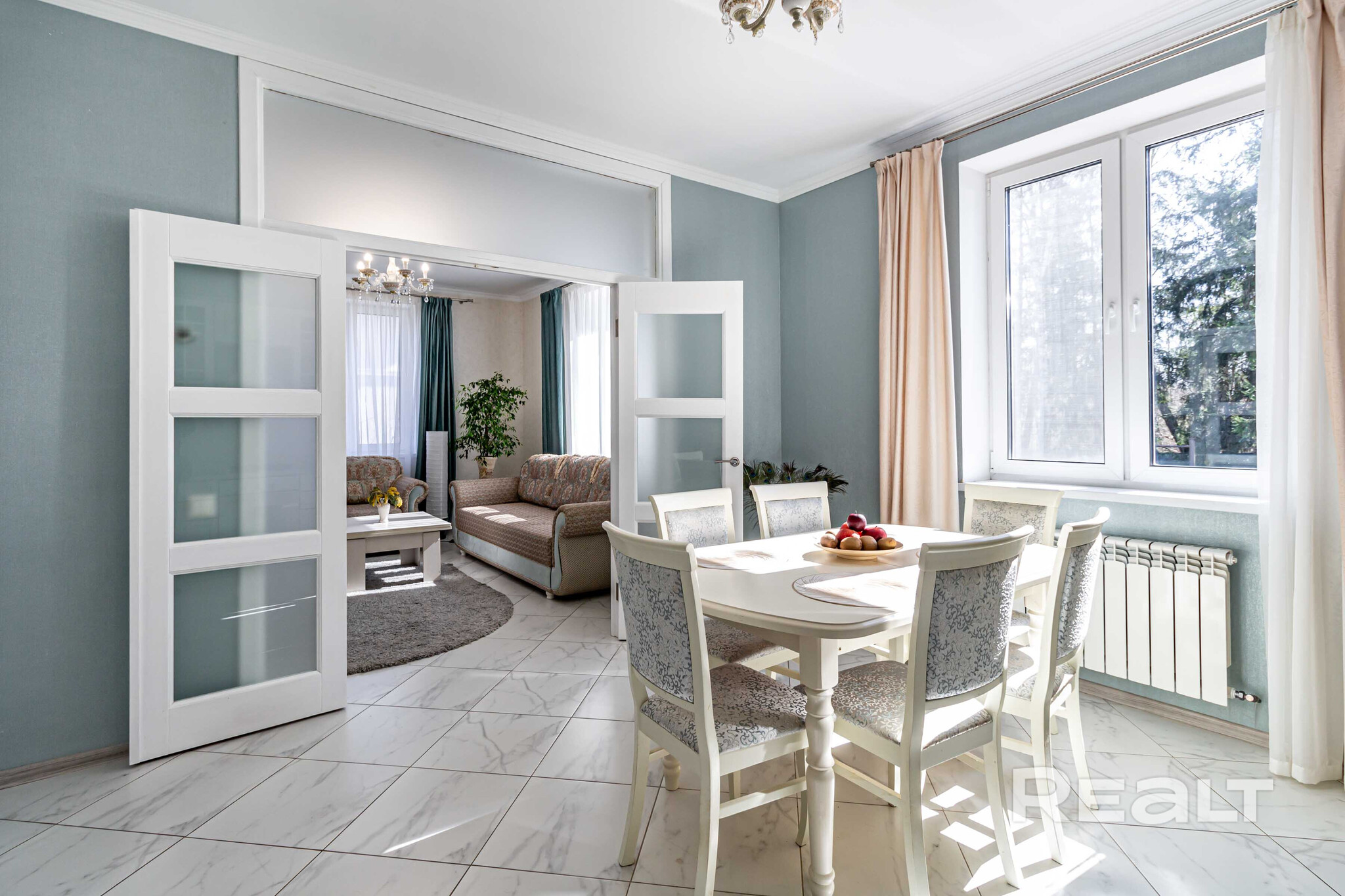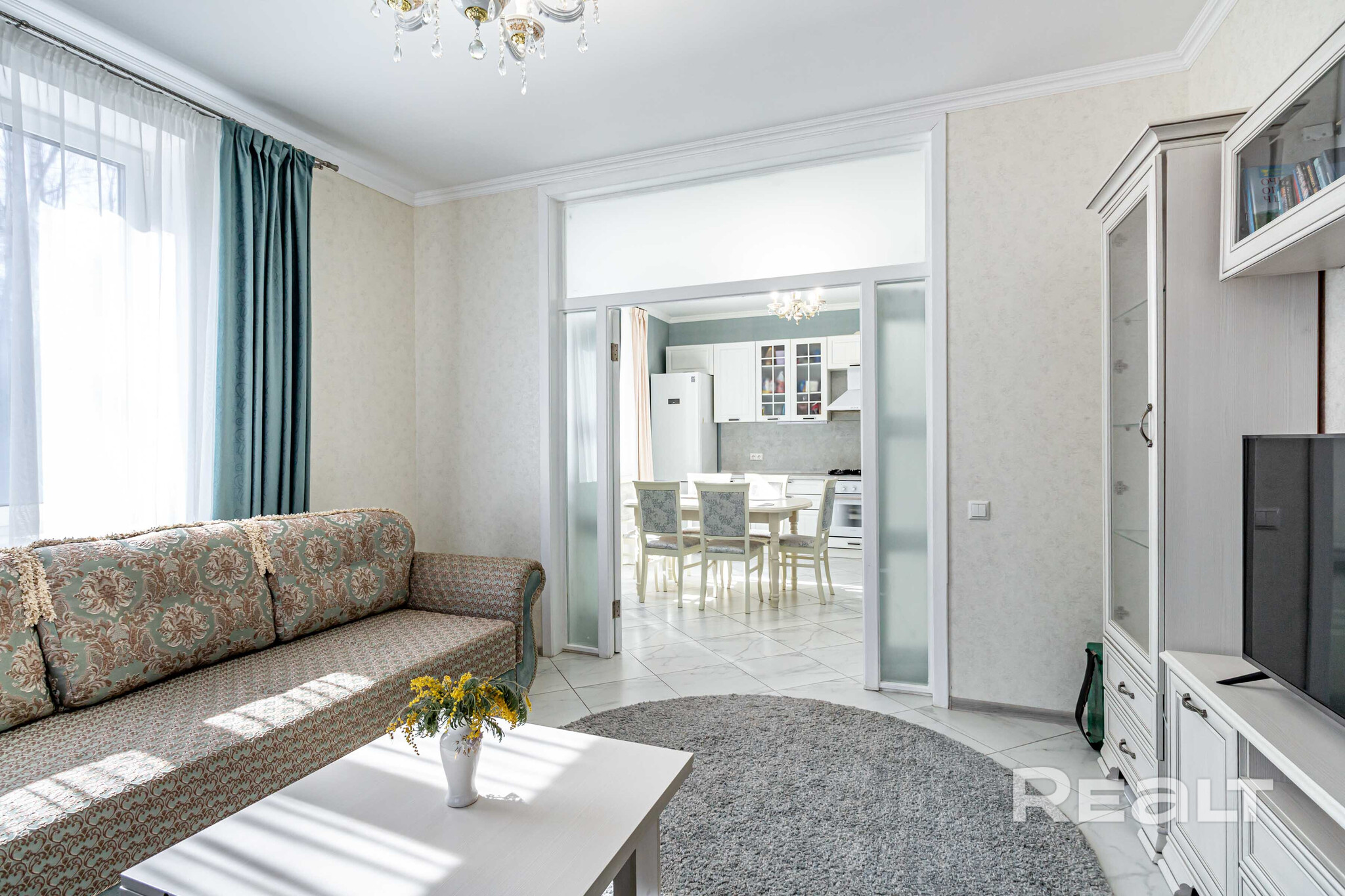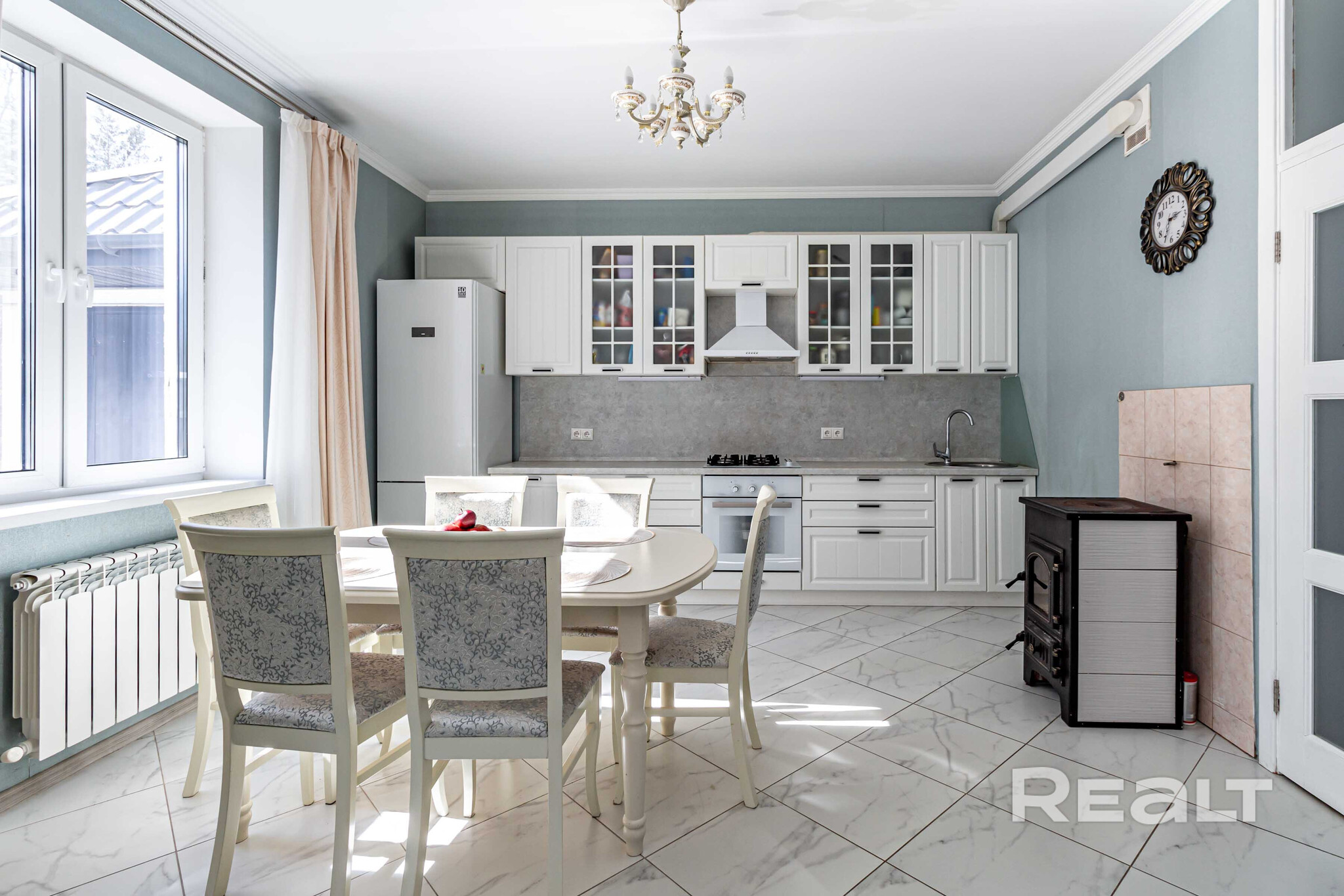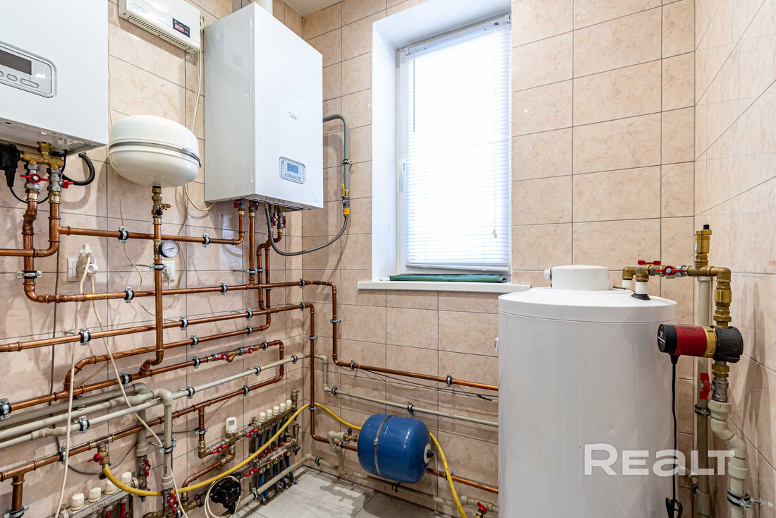 На даче есть все коммуникации: газовое отопление, вода, канализация, оптоволокно «Белтелеком». На первом этаже — теплый пол + радиаторы, на втором — радиаторы.