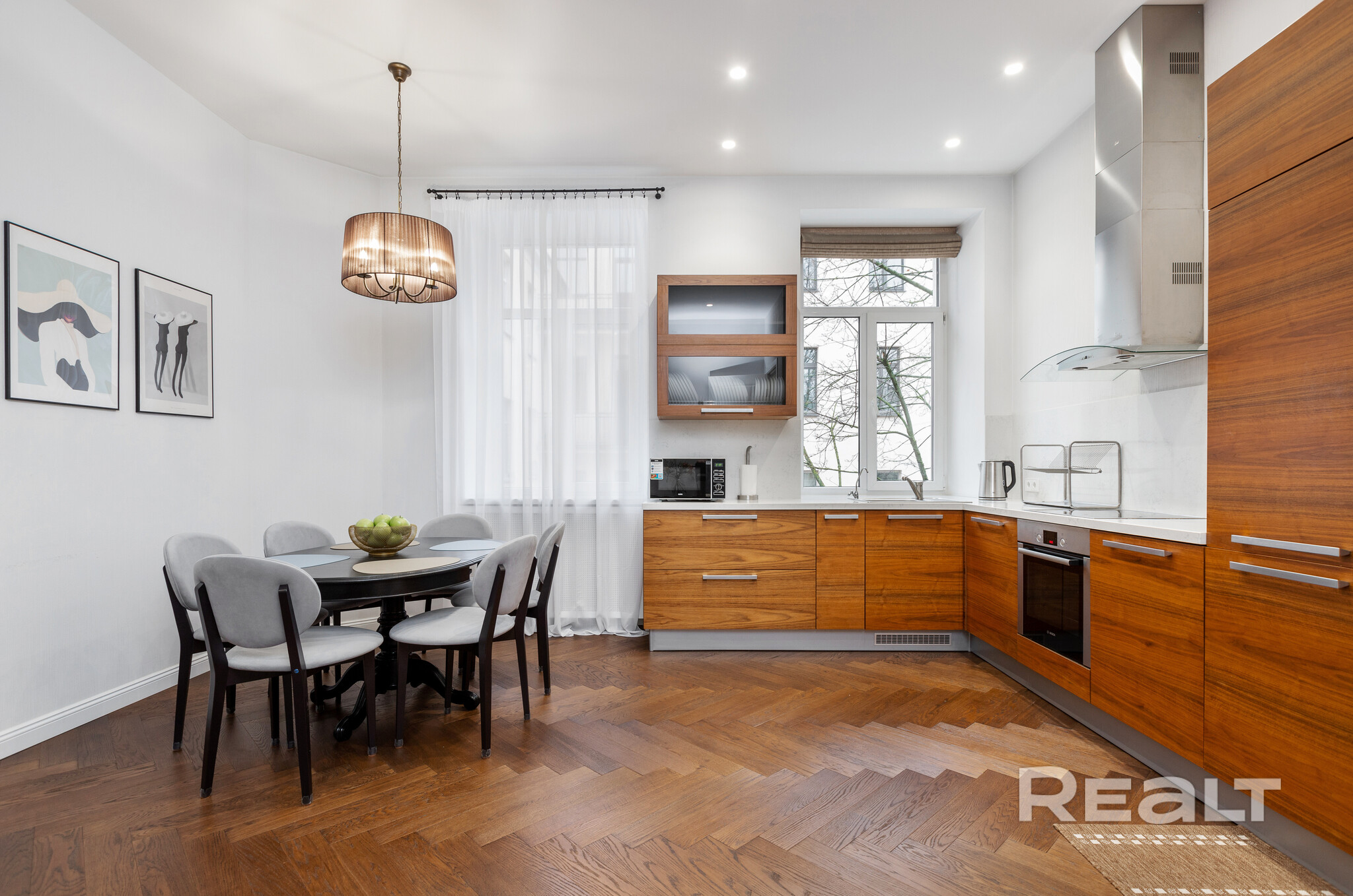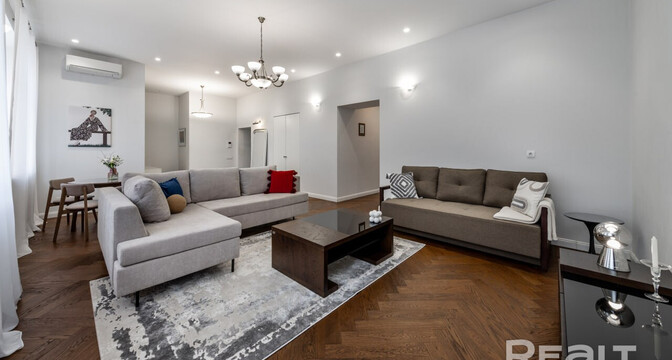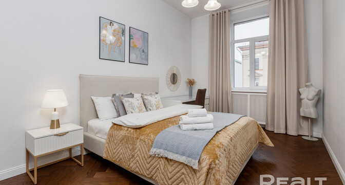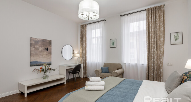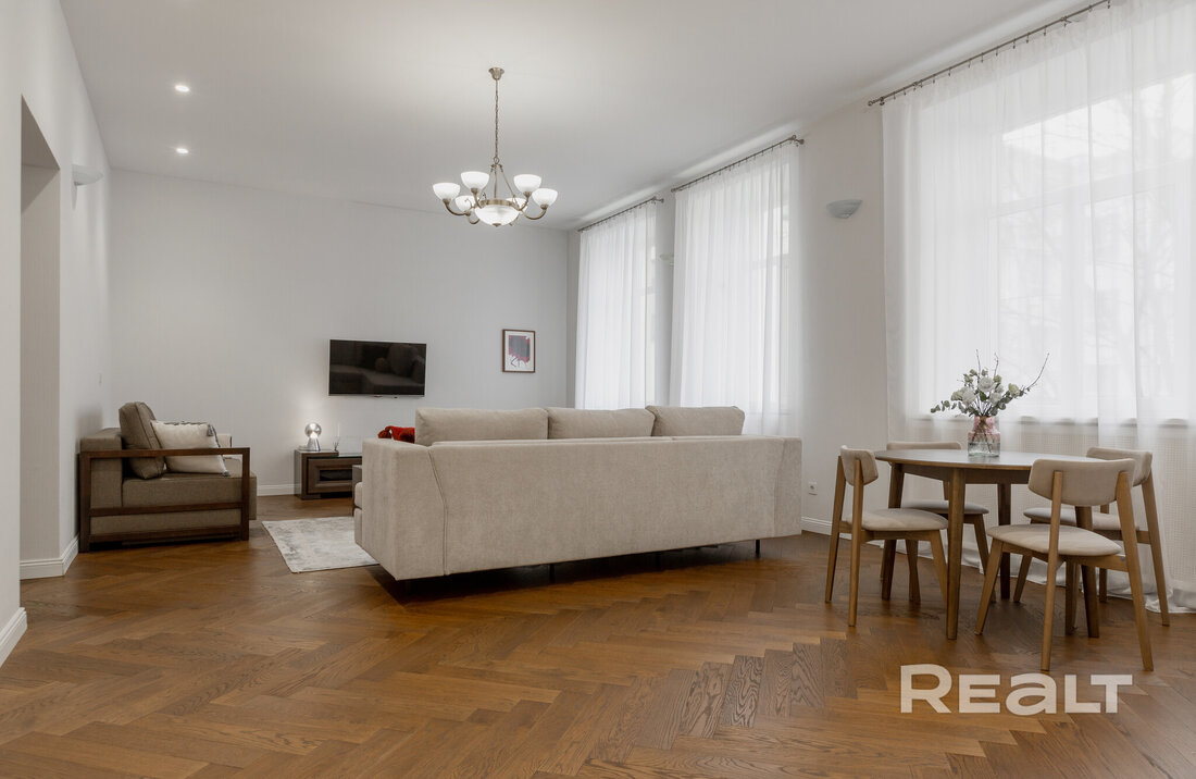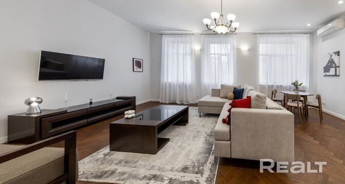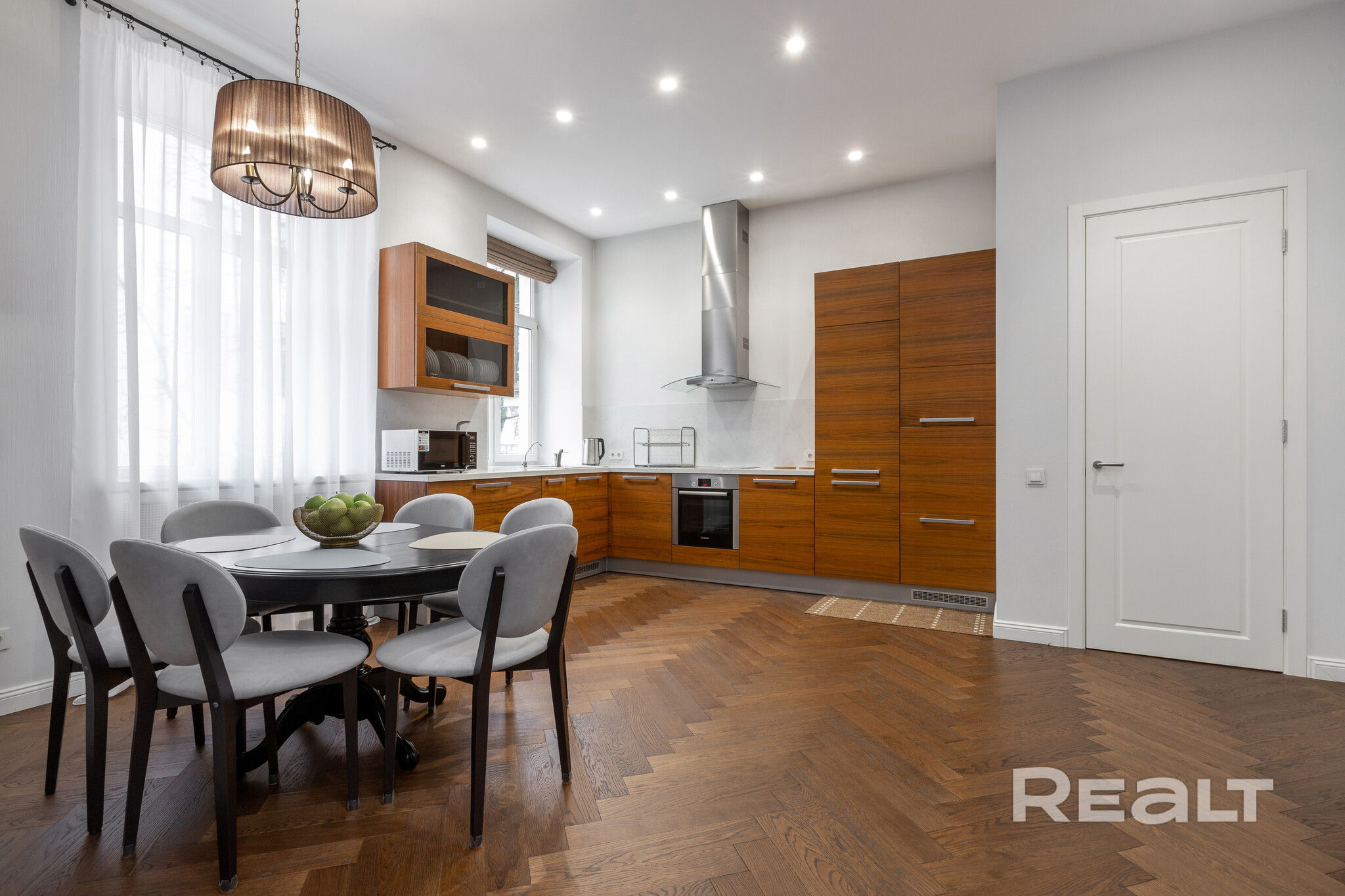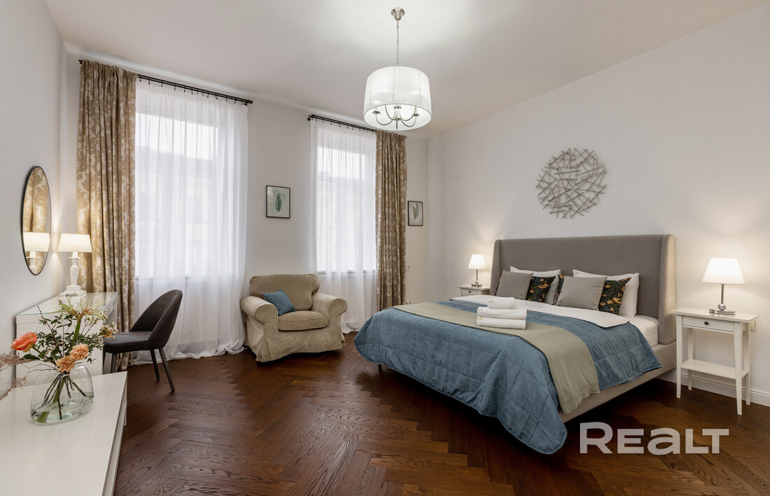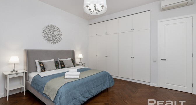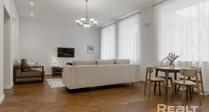Этот дом в самом центре Минска построен больше ста лет назад. Его возводили как доходный — квартиры там сдавали в аренду, а владельцем был врач. Здание пережило две войны и в прошлом веке здесь селилась партийная элита, писатели и поэты. Интересно, что и сейчас, в 2026 году, здесь можно снять квартиру в аренду. Симпатичный вариант на сутки — светлую четырехкомнатную квартиру с приятным ремонтом — мы нашли в сервисе Realt.Бронь.