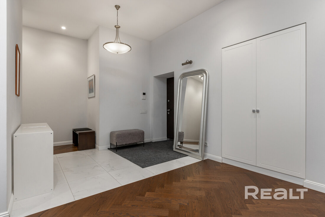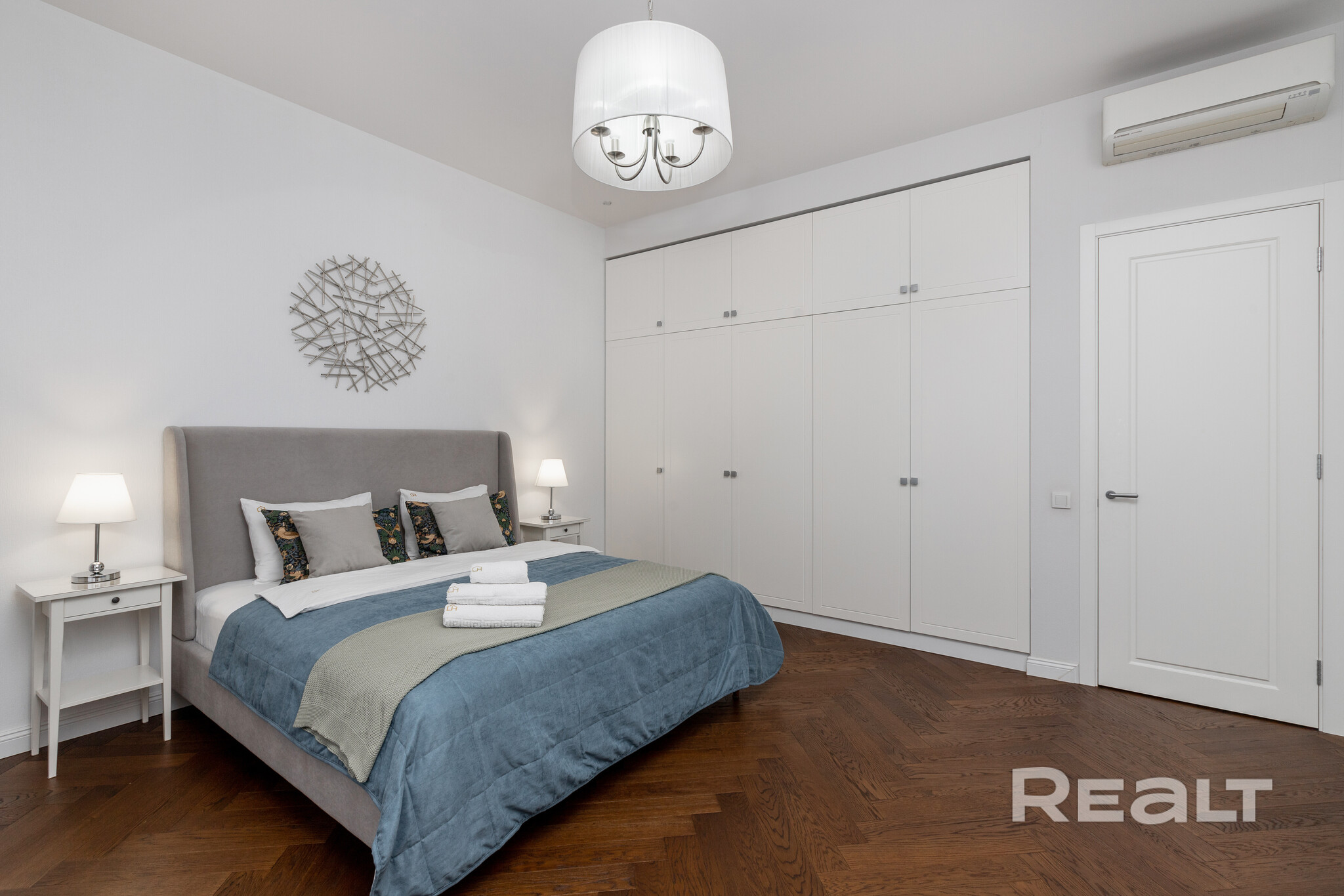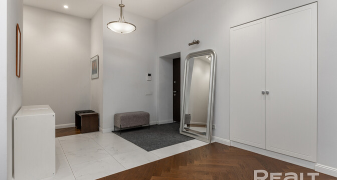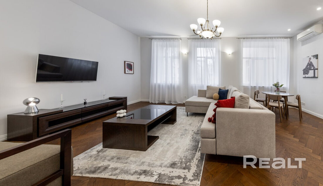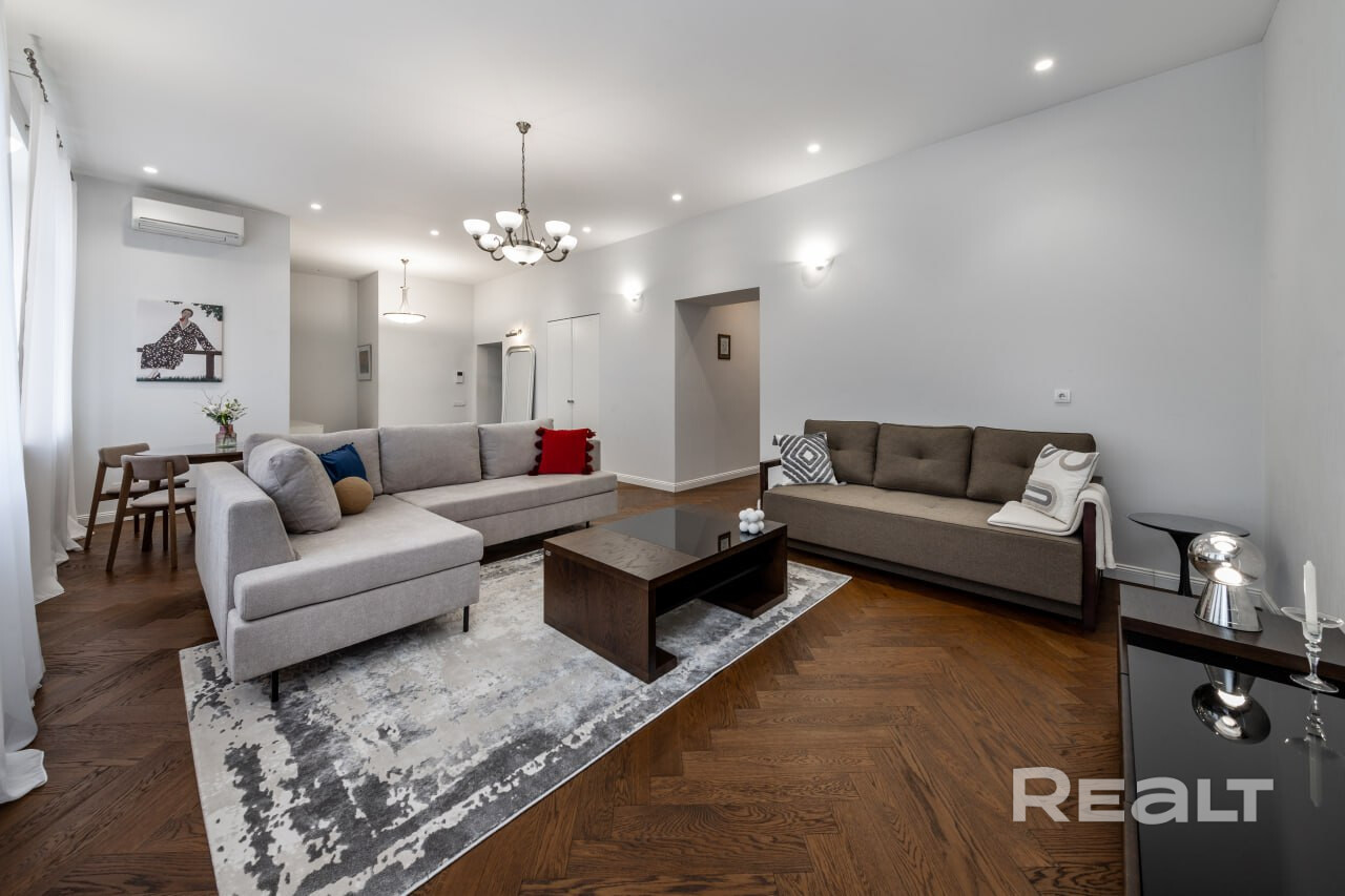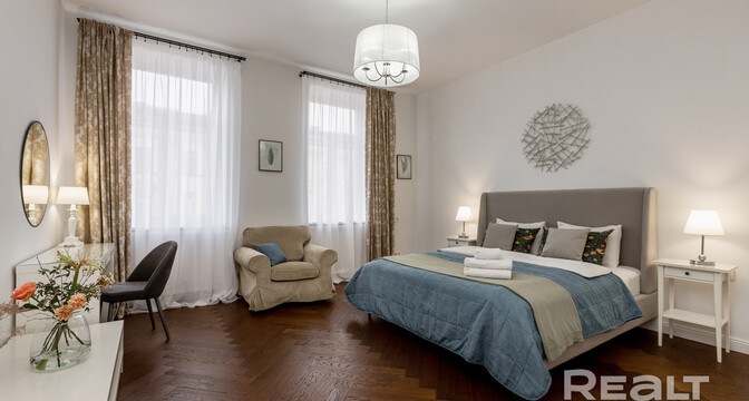 Этот дом в самом центре Минска построен больше ста лет назад. Его возводили как доходный — квартиры там сдавали в аренду, а владельцем был врач. Здание пережило две войны и в прошлом веке здесь селилась партийная элита, писатели и поэты. Интересно, что и сейчас, в 2026 году, здесь можно снять квартиру в аренду. Симпатичный вариант на сутки — светлую четырехкомнатную квартиру с приятным ремонтом — мы нашли в сервисе Realt.Бронь.