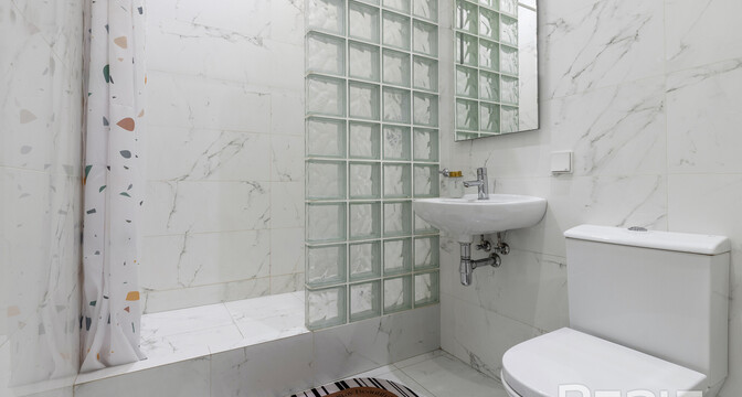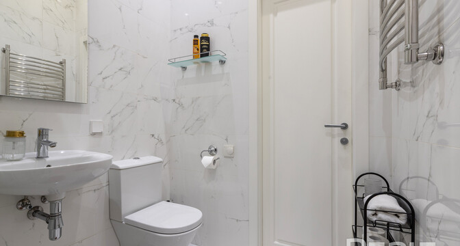 Для гостей подготовлены все нужные ванные принадлежности — от гелей для душа до махровых белых полотенец. Можно воспользоваться стиральной машиной, есть утюг, гладильная доска и фен.