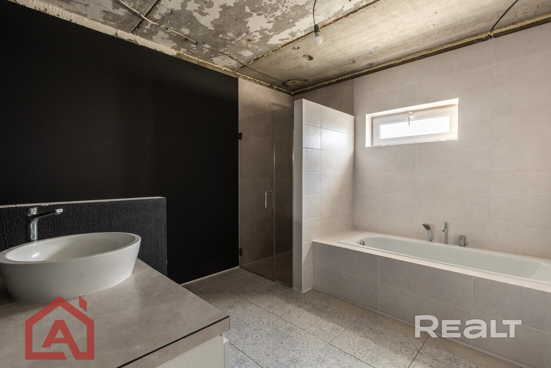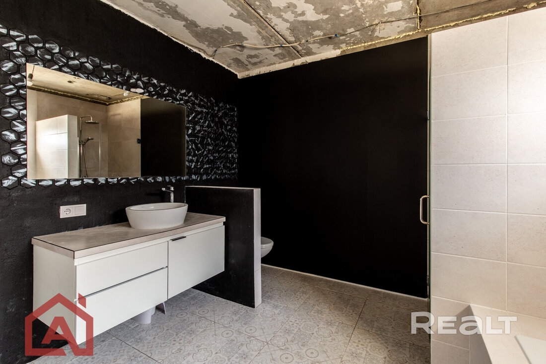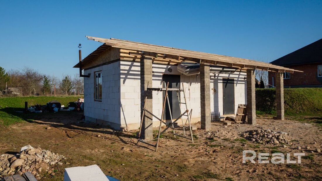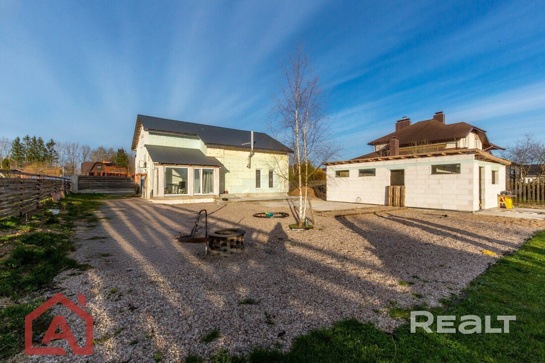 Коттедж под отделку – это двухэтажный дом на 200 квадратов с монолитным фундаментом, остеклен, накрыт металочерепицей. Первый уровень распланирован и возведены межкомнатные стены. Второй – просторный, высокий мансардный этаж. К дому идет отдельный рукав газа, электричество подведено в дом 380В, устройство канализации/септика – с учетом индивидуальных потребностей. Есть купленные строительные материалы, что будут переданы новому собственнику.
