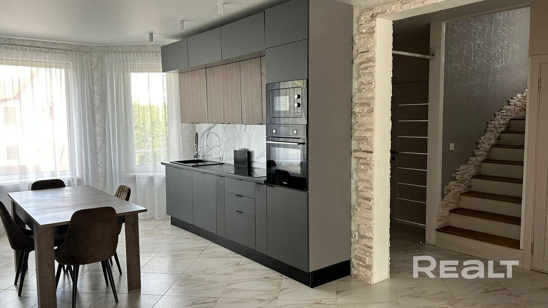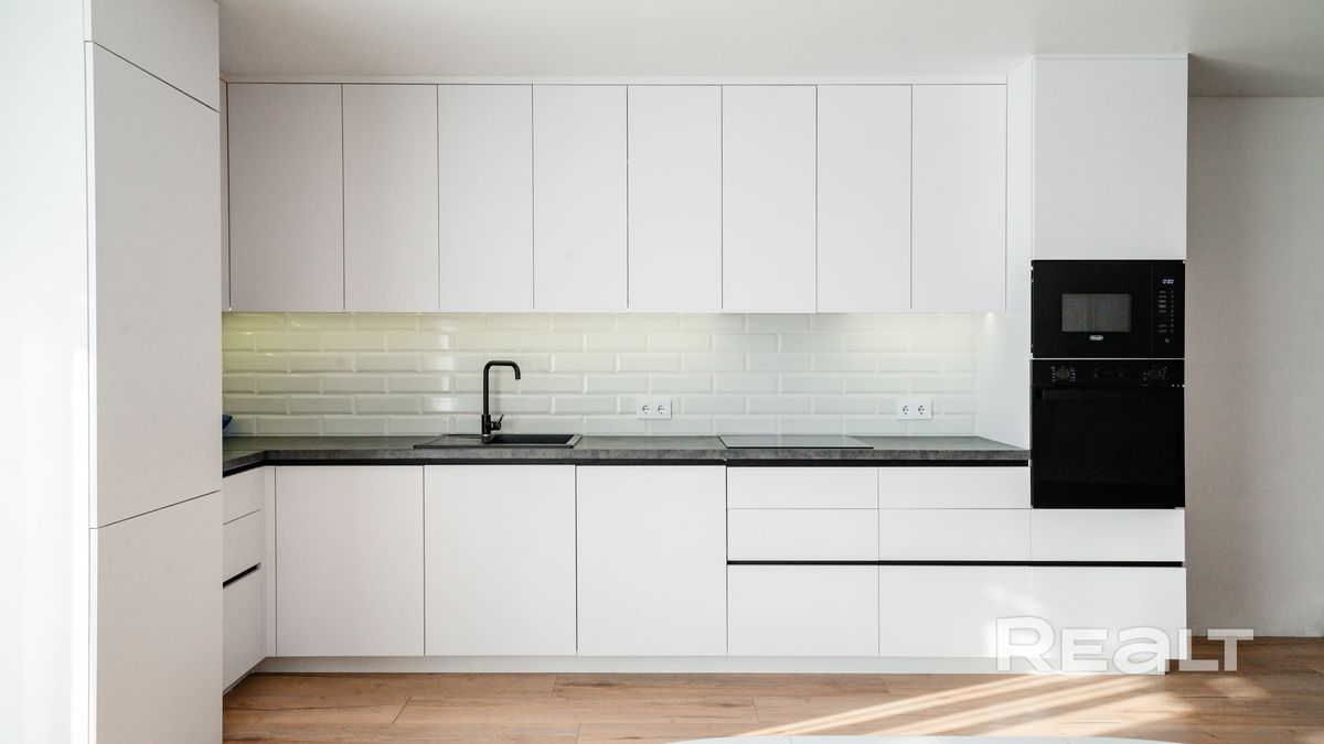 На кухне установлен новый гарнитур с электрическим духовым шкафом, индукционной варочной панелью, встроенными печью СВЧ, посудомойкой, вытяжкой и холодильником. Дополнительная морозильная камера в хозяйственном помещении.