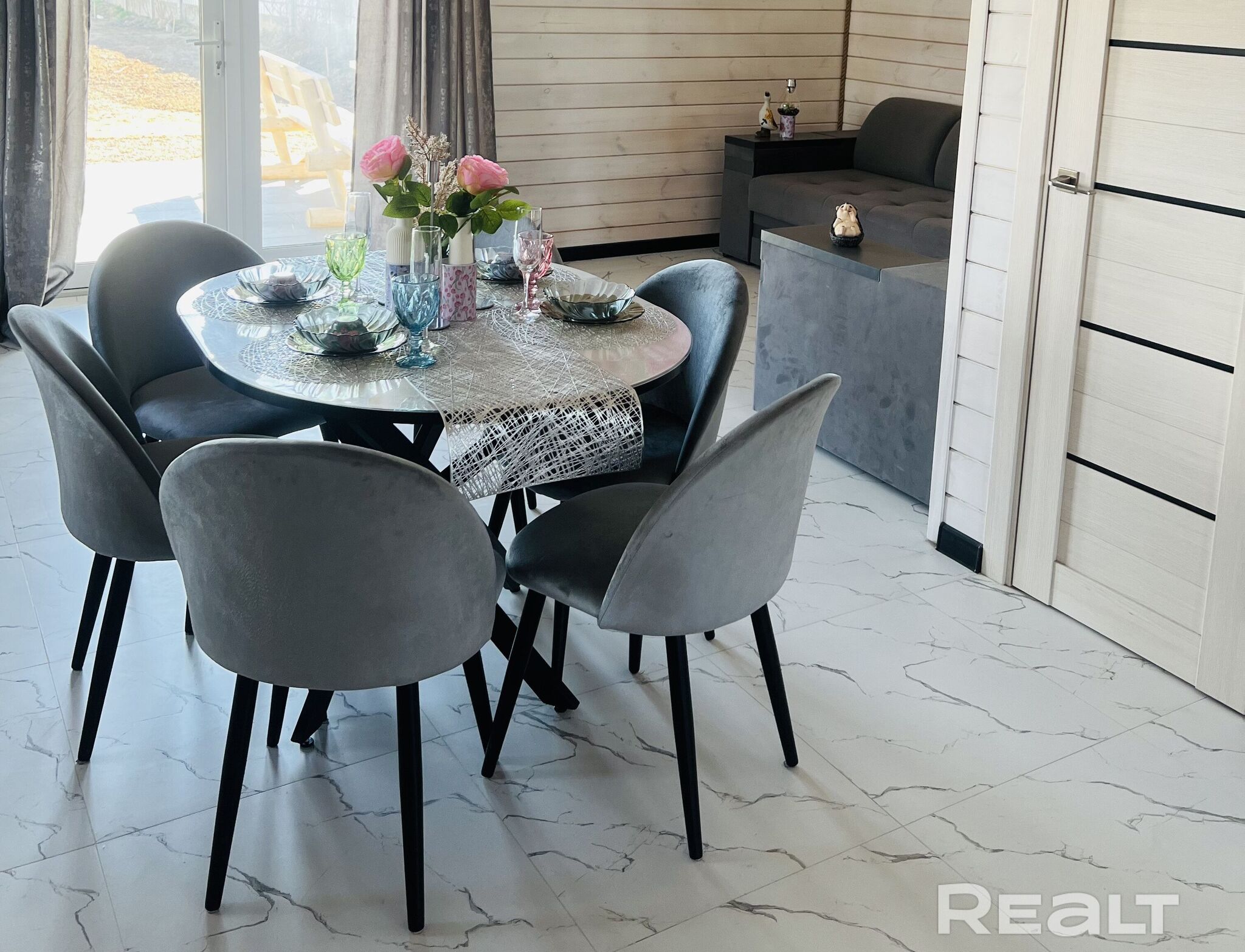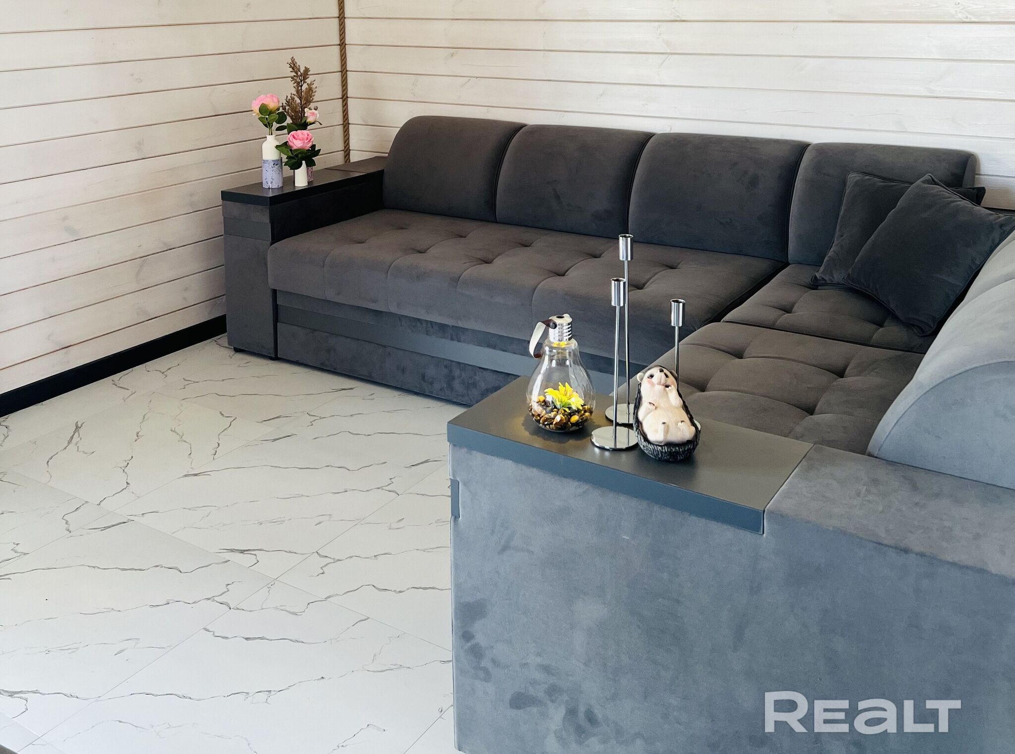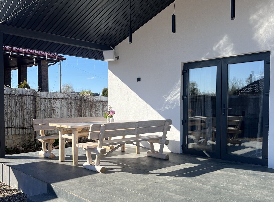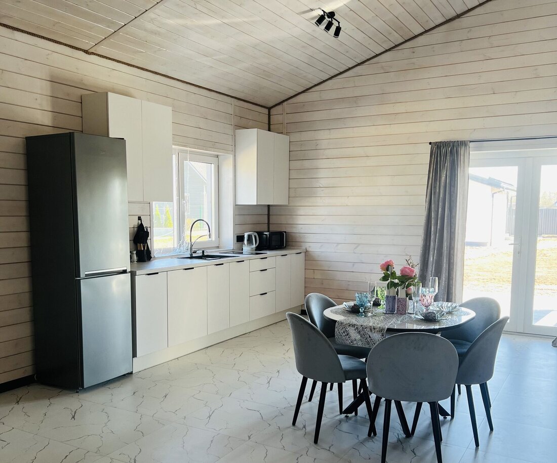 Общая площадь — 142 м2. Планировка такая: прихожая, топочная, санузел, две спальни и гостиная кухня. Внутри дом отделан деревом.