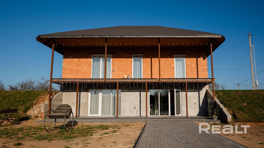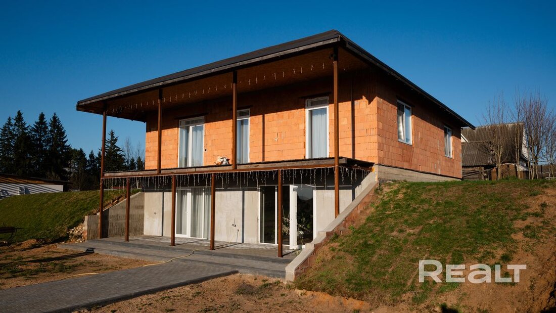 Дом здесь двухэтажный, с полузаглубленным первым этажом. Над главным входом в дом по всей ширине навес, являющийся террасой для второго этажа. Построен в 2026 году. Стены из керамоблока толщиной 40 см. Первый этаж дополнительно утеплен. На крыше — битумная черепица.