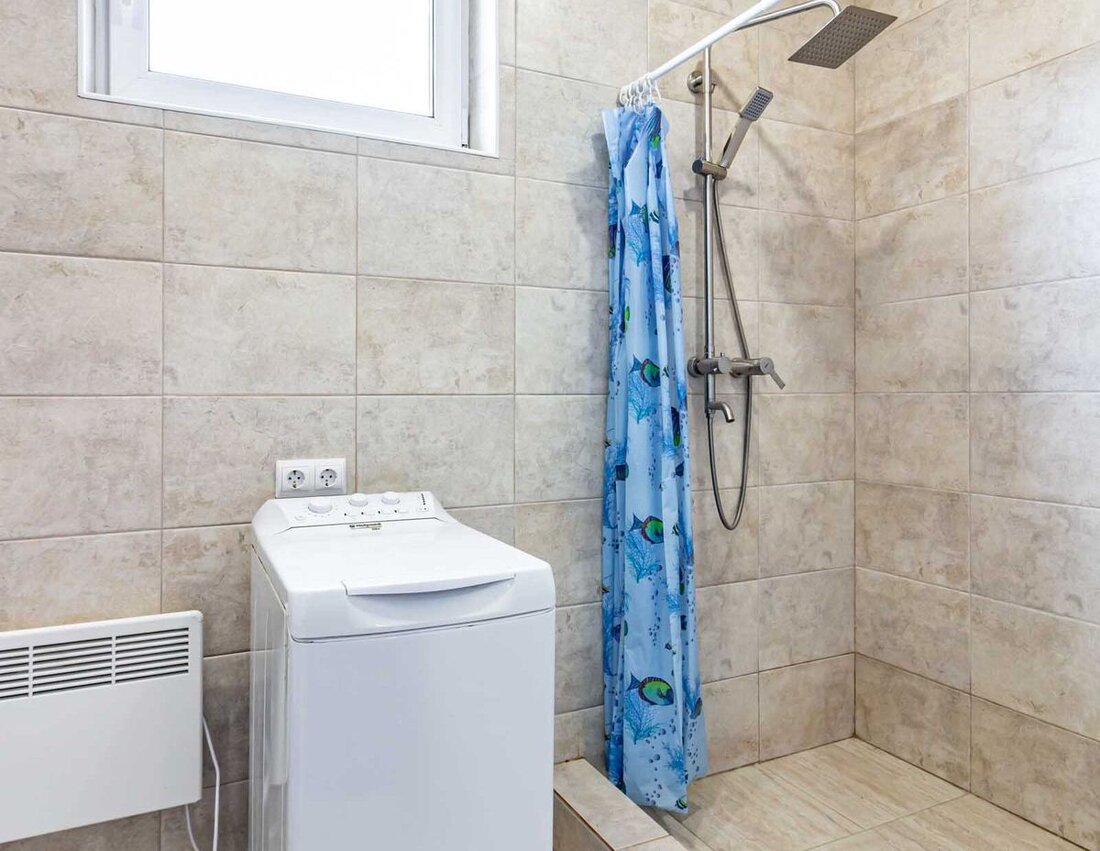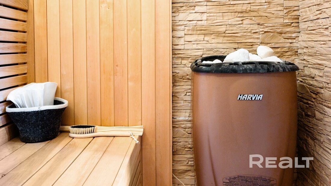 В сауне стоит финская печь-каменка Harvia, с выносным пультом управления и возможностью лить воду на камни. В прачечной — стирально-сушильная машина Viomi Master 2 на 10 кг.