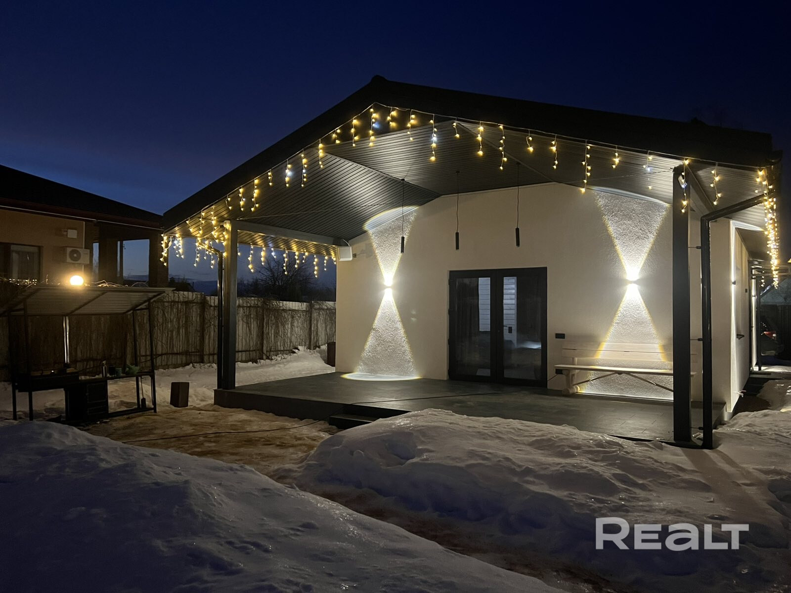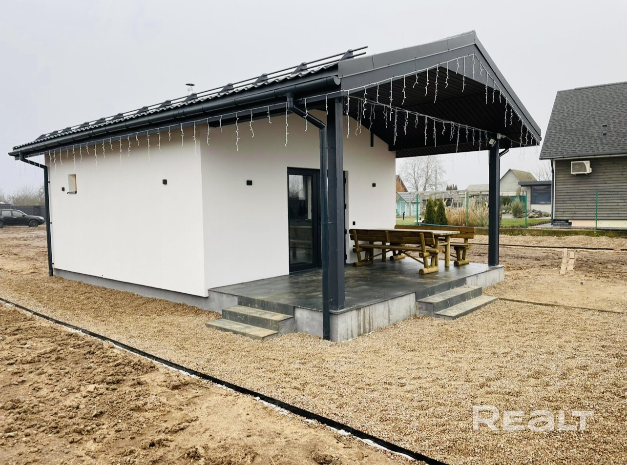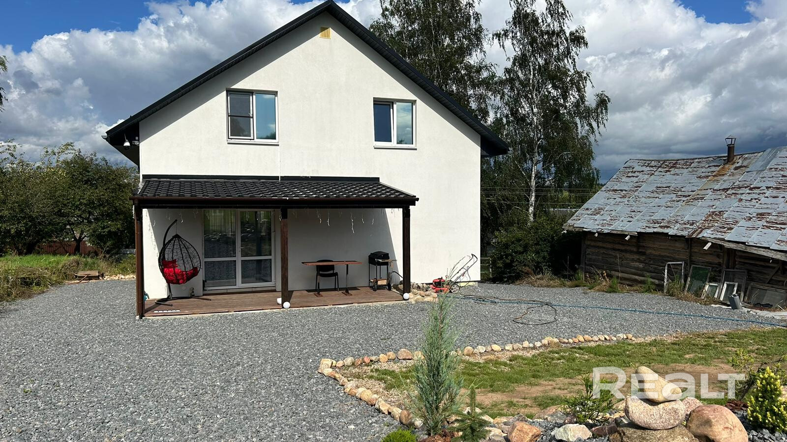 Дом новый, с крытой террасой. Фасад отделан декоративной штукатуркой и покрашен. На крыше — металлочерепица, окна ПВХ с ламинацией.
